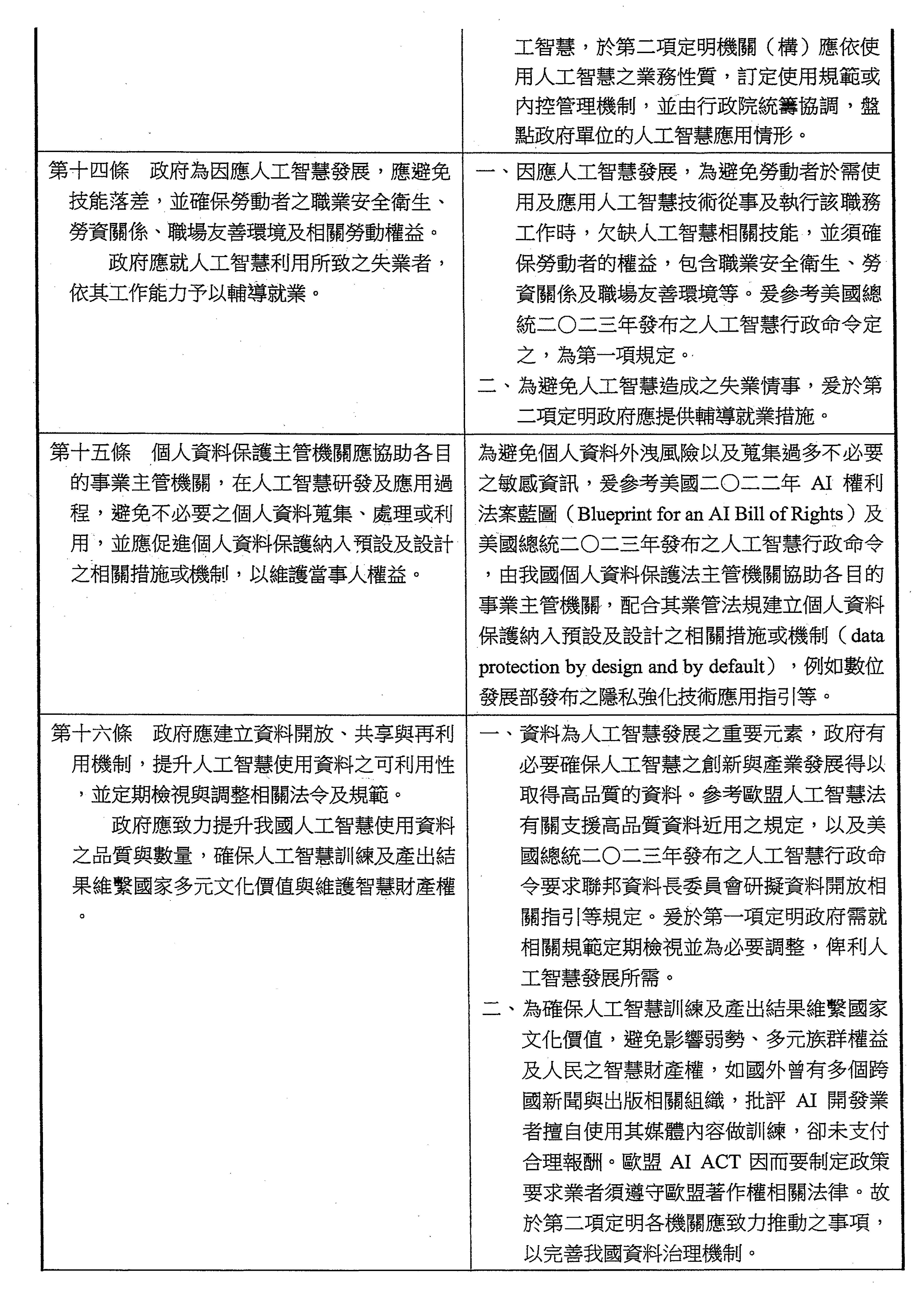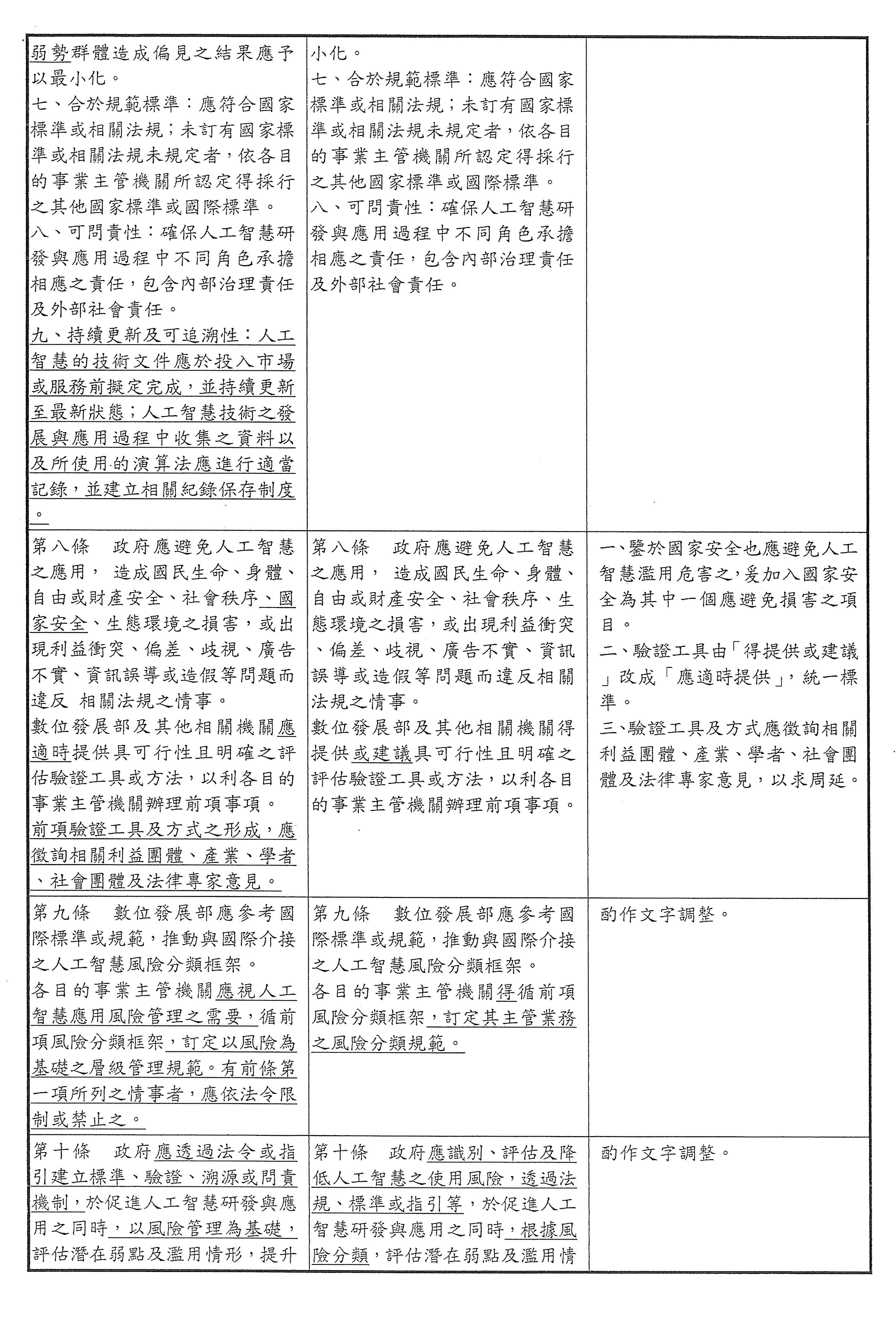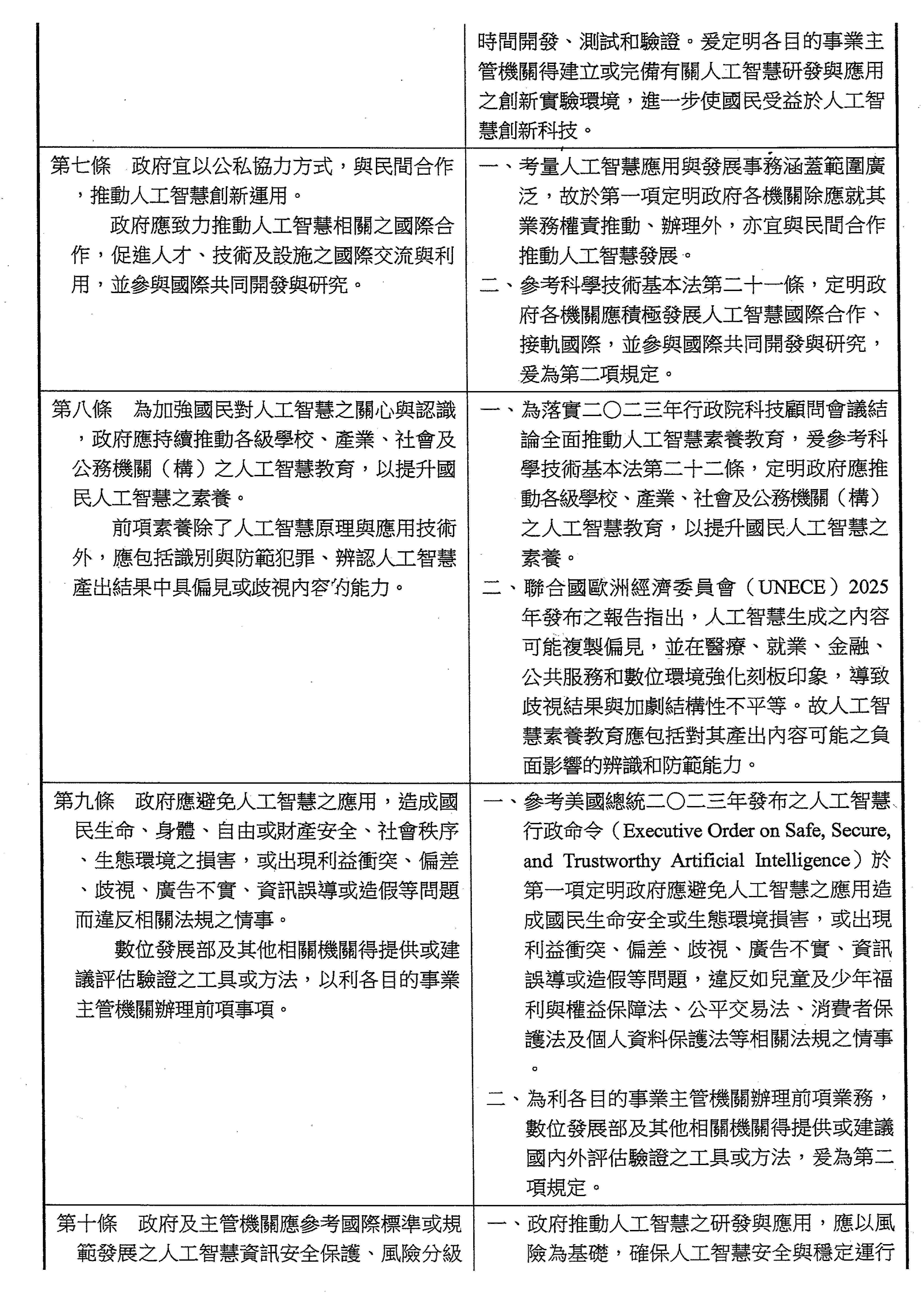 二、「人工智慧基本法草案」相關草案,另定期繼續審查。請數位發展部於114年7月15日以前提出部版建議條文,並定於114年7月21日當週排審。審查結果如下: