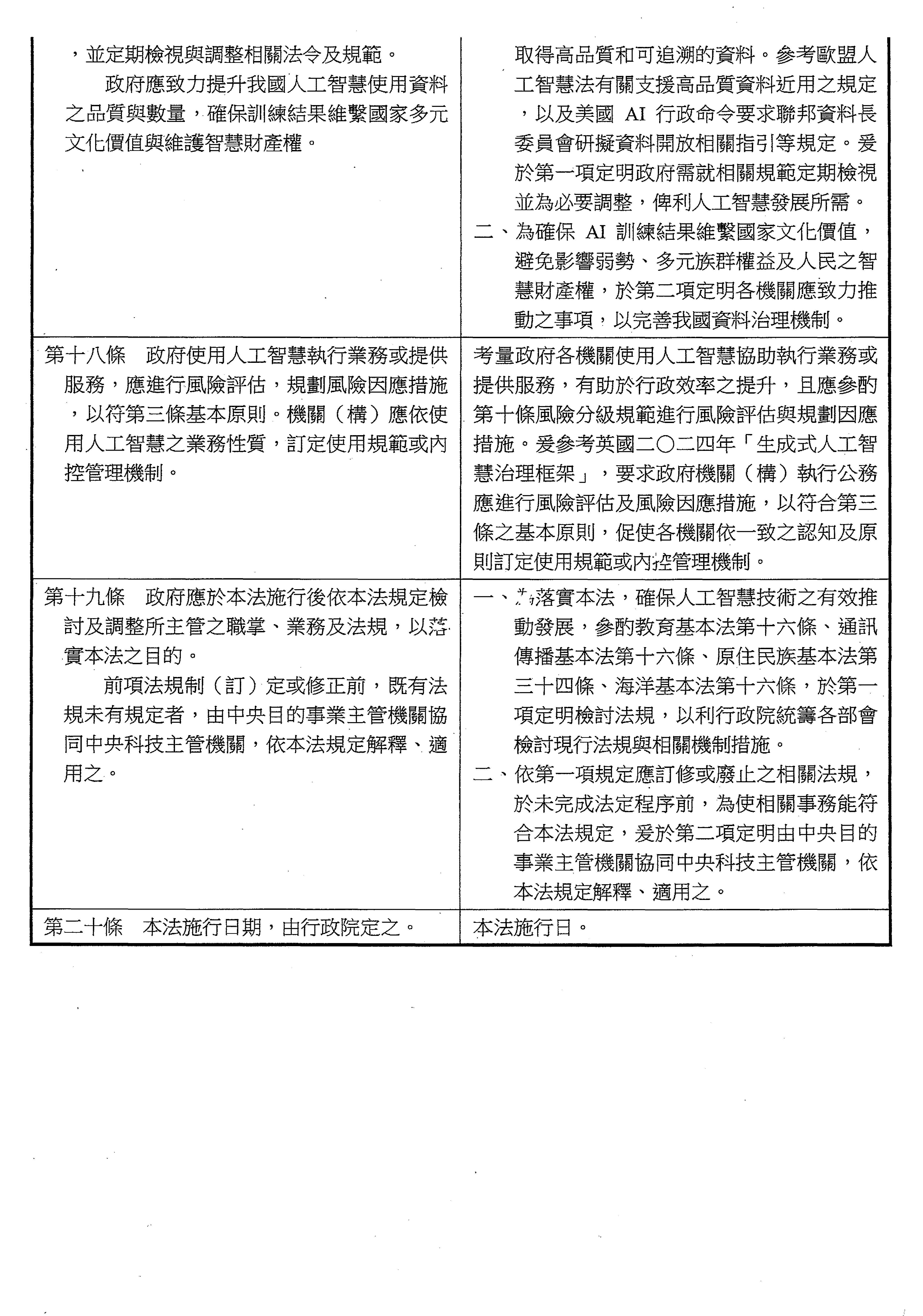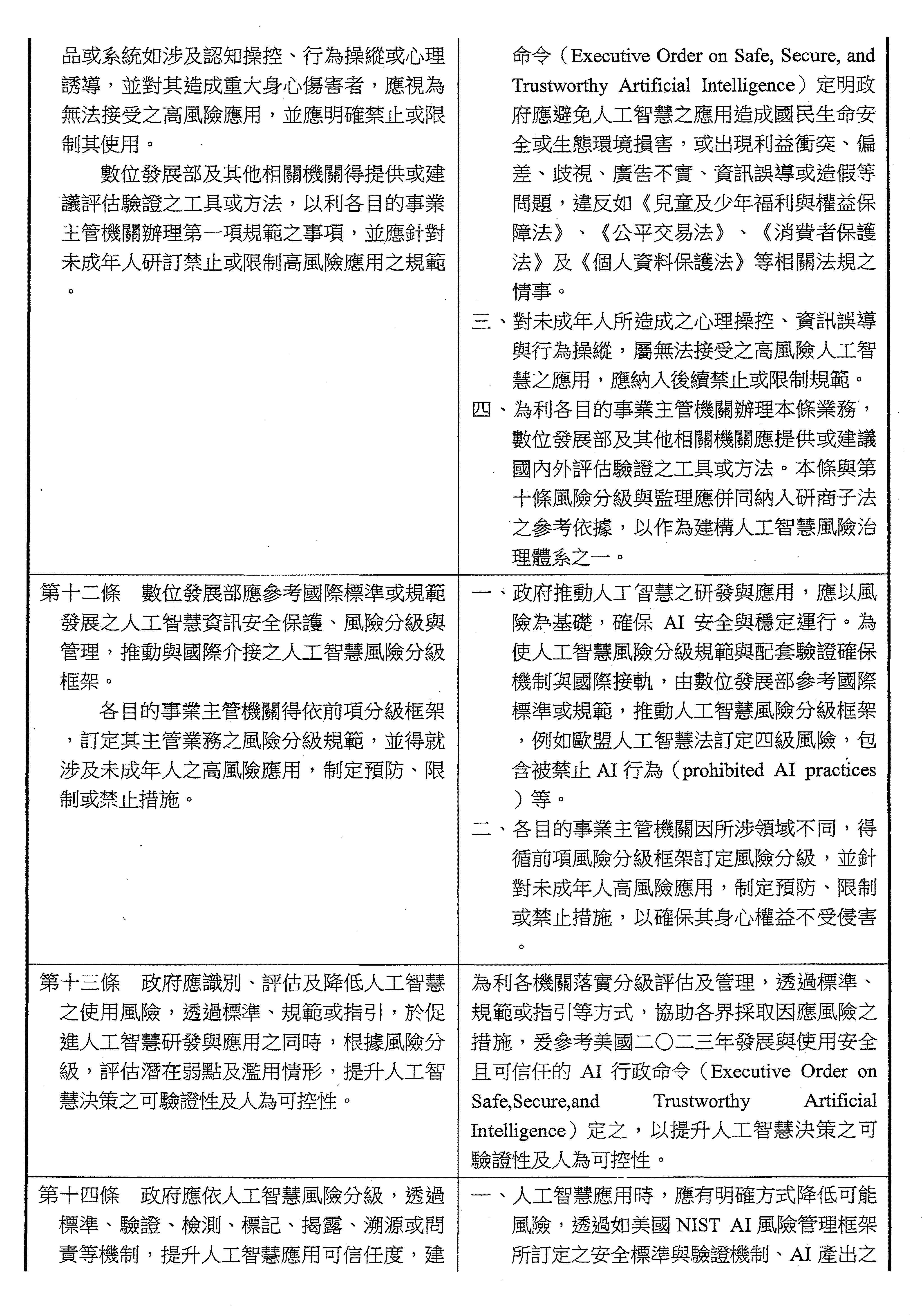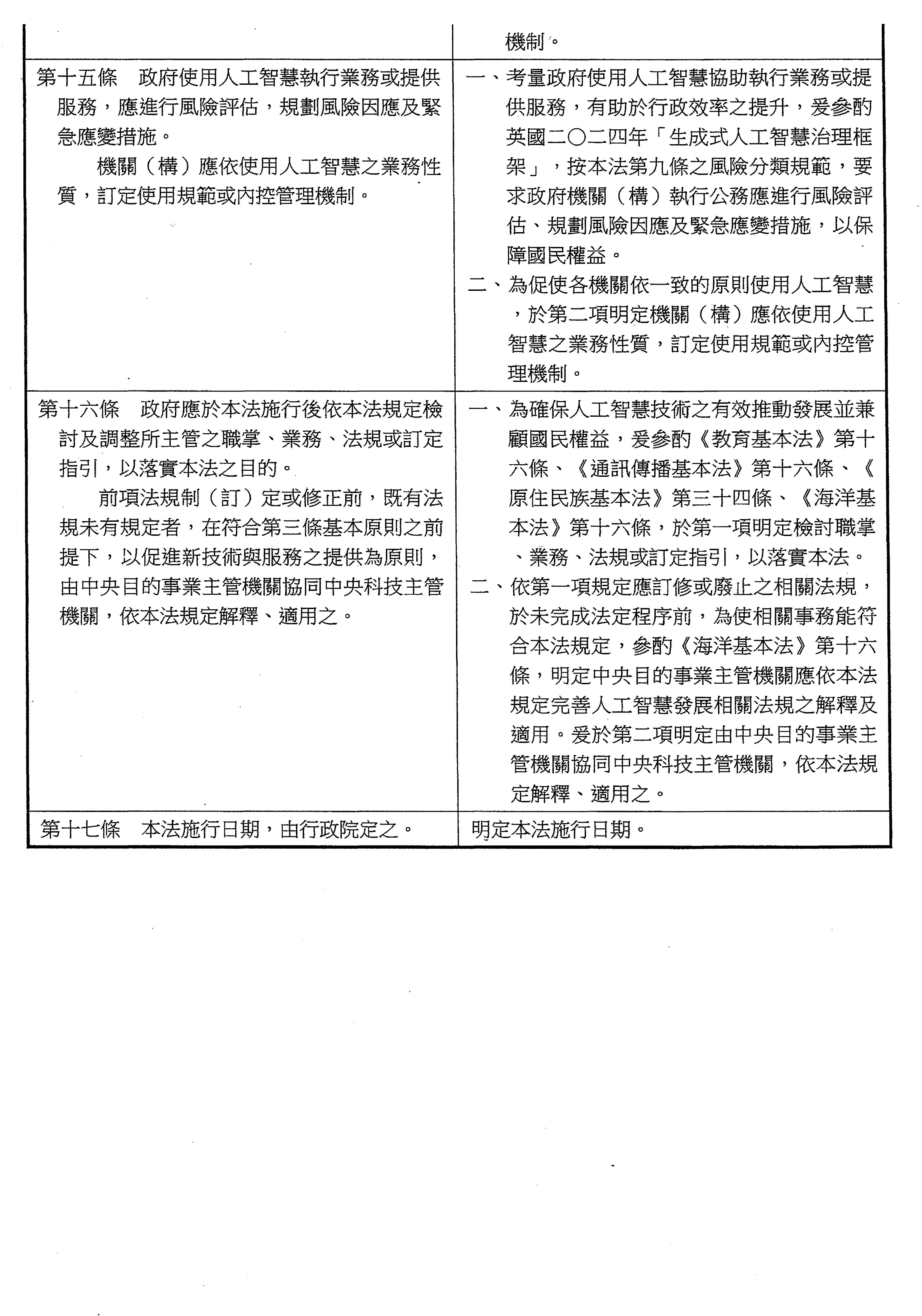 二、「人工智慧基本法草案」相關草案,另定期繼續審查。請數位發展部於114年7月15日以前提出部版建議條文,並定於114年7月21日當週排審。審查結果如下: