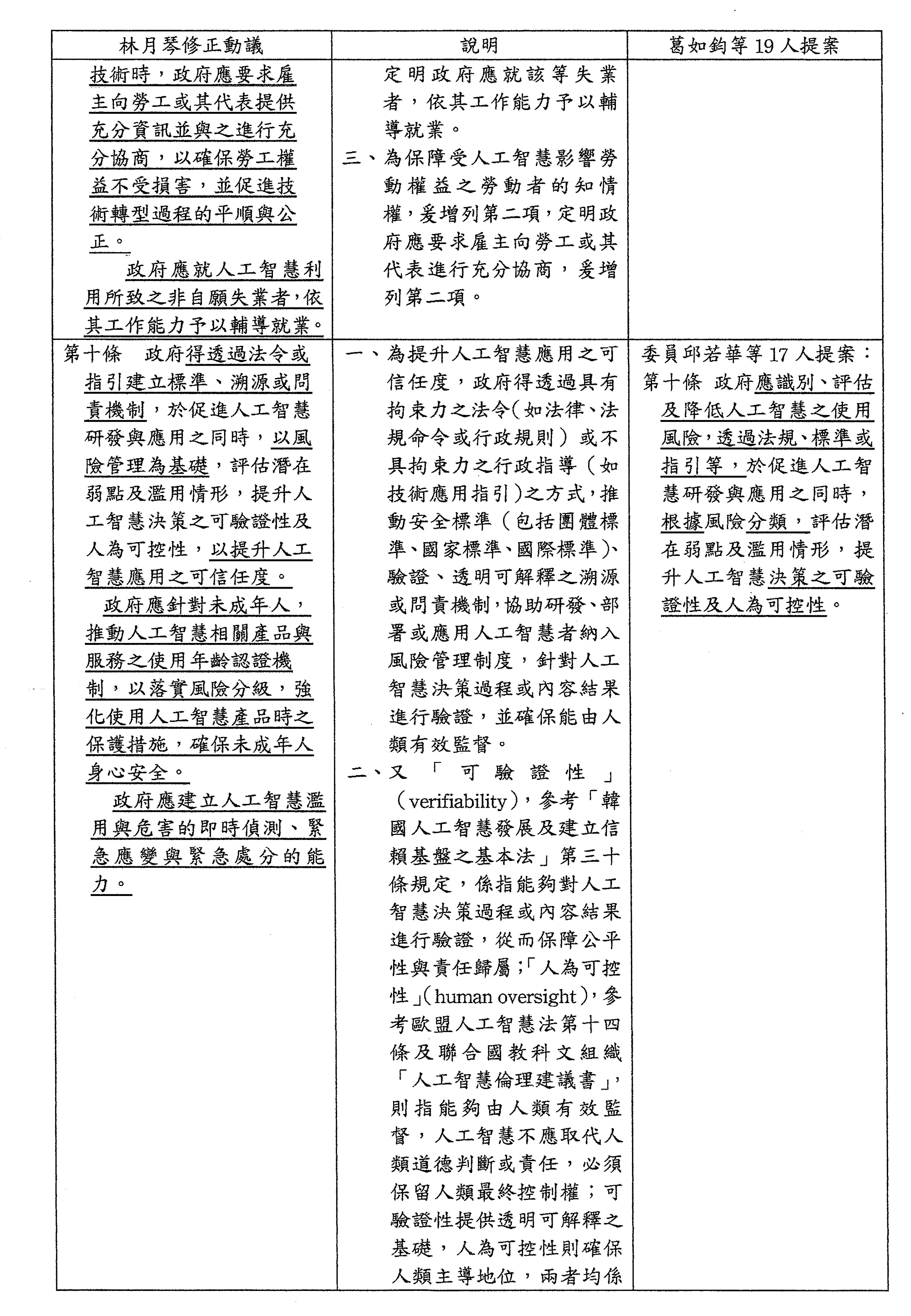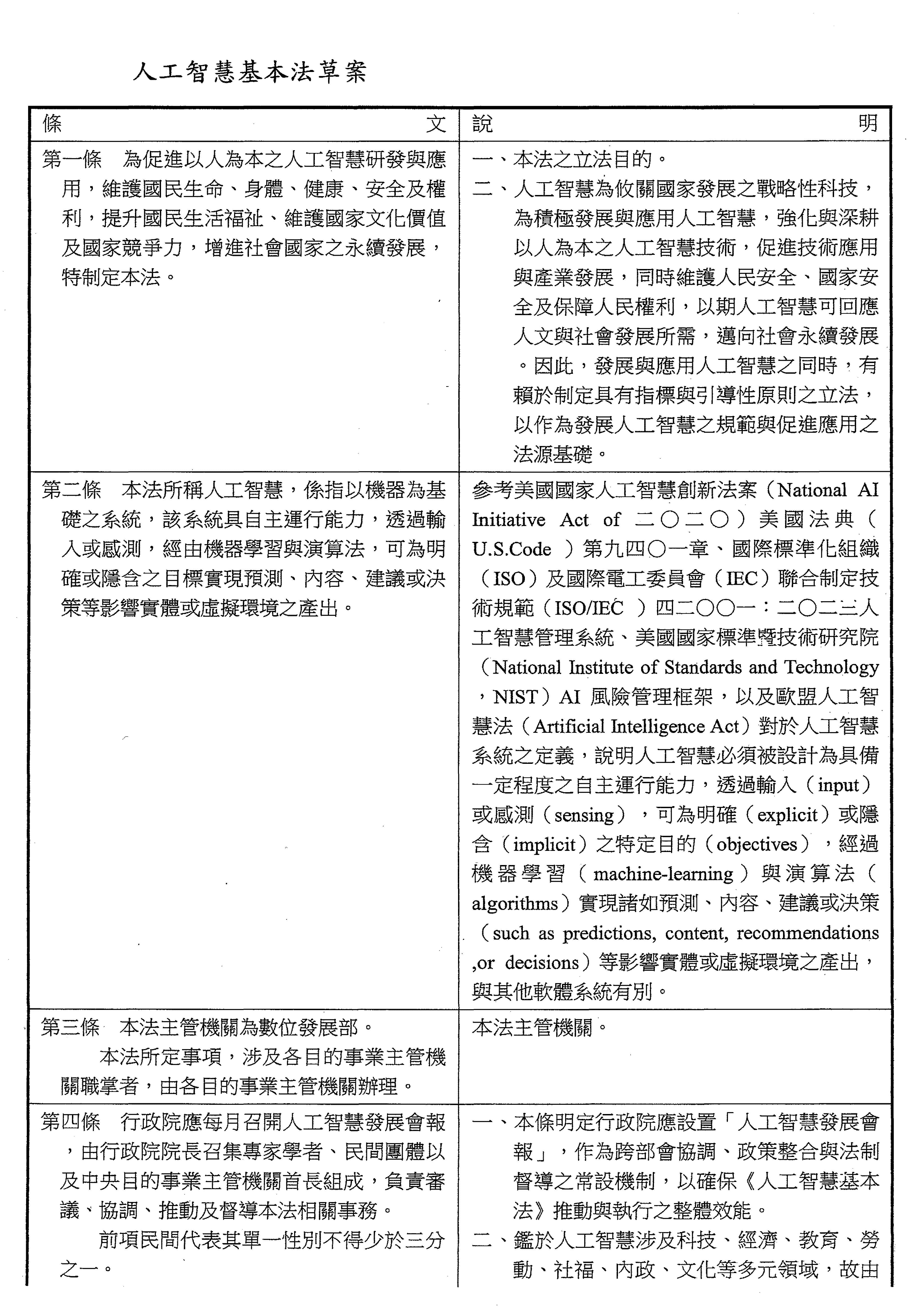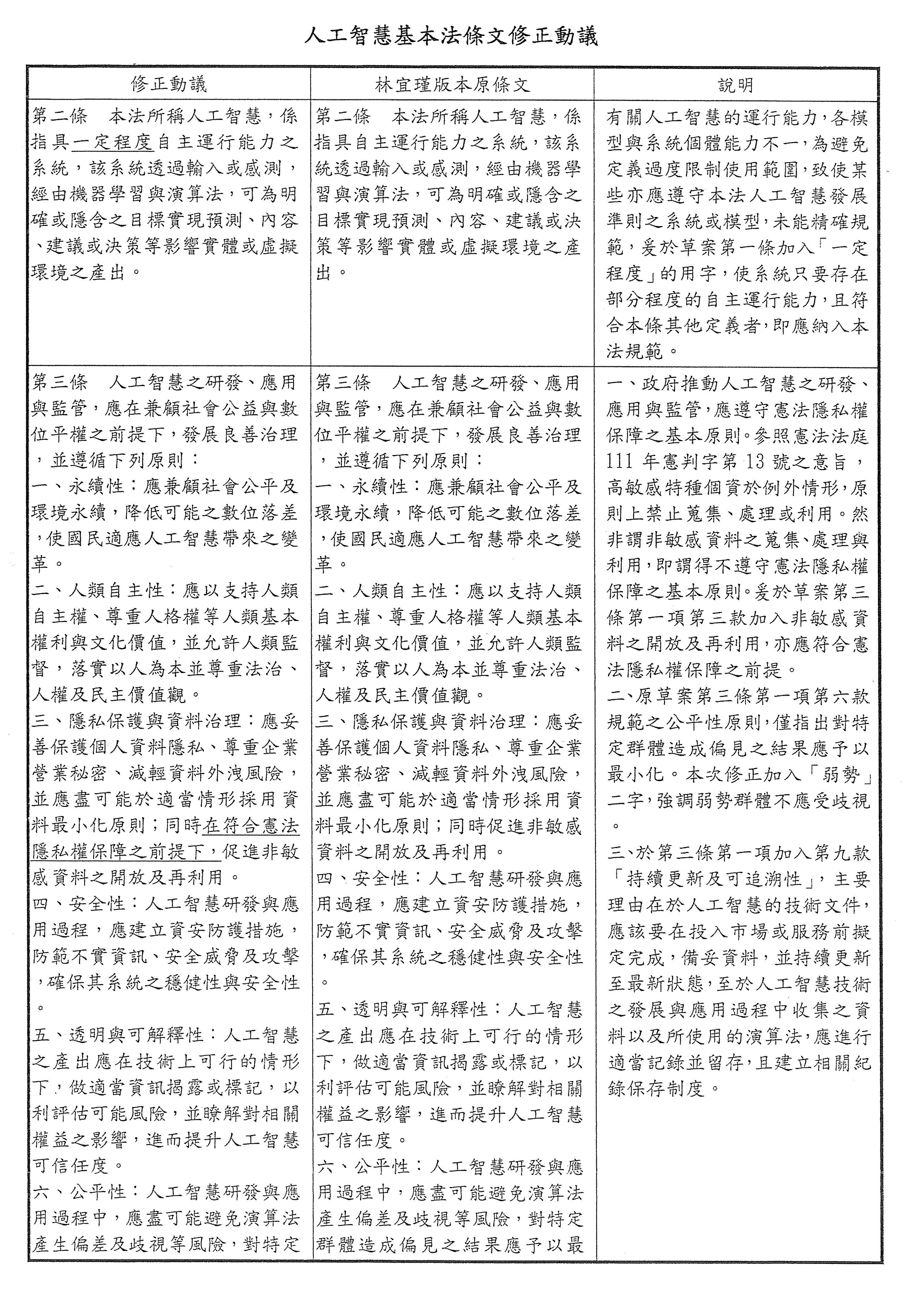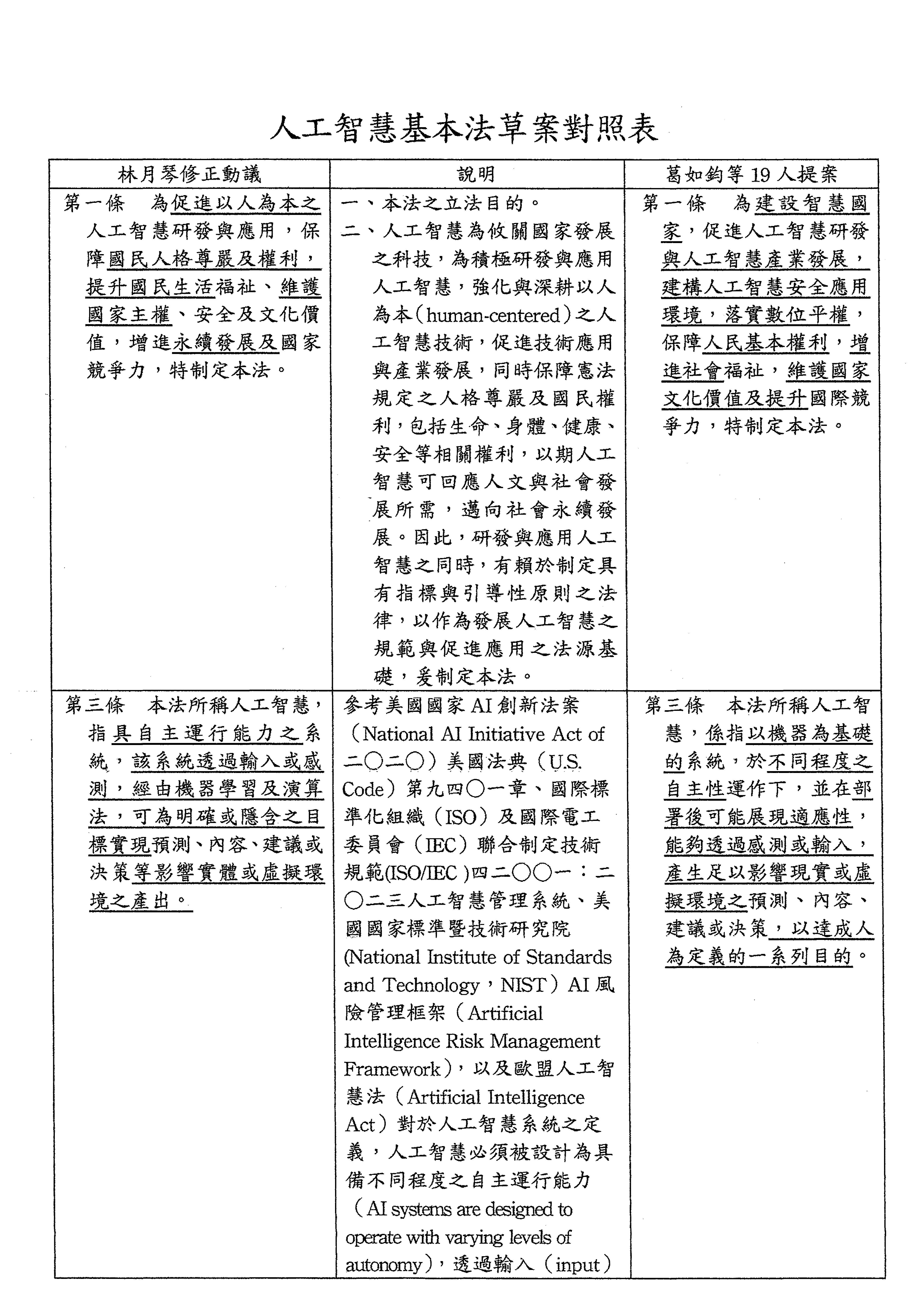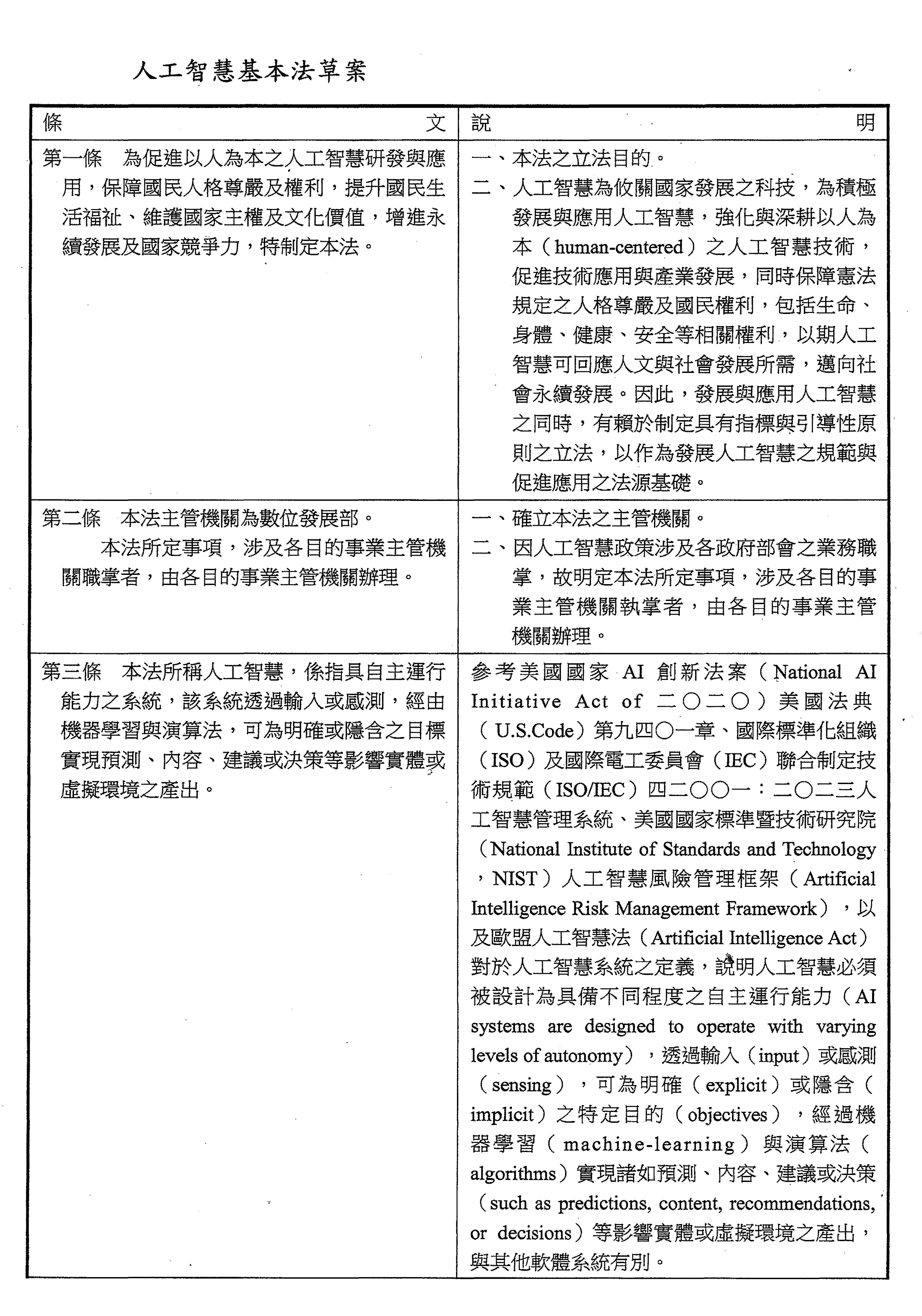 現在進行人工智慧基本法草案逐條審查,並進行討論與協商;討論時如有新增修正動議,請議事人員宣讀。