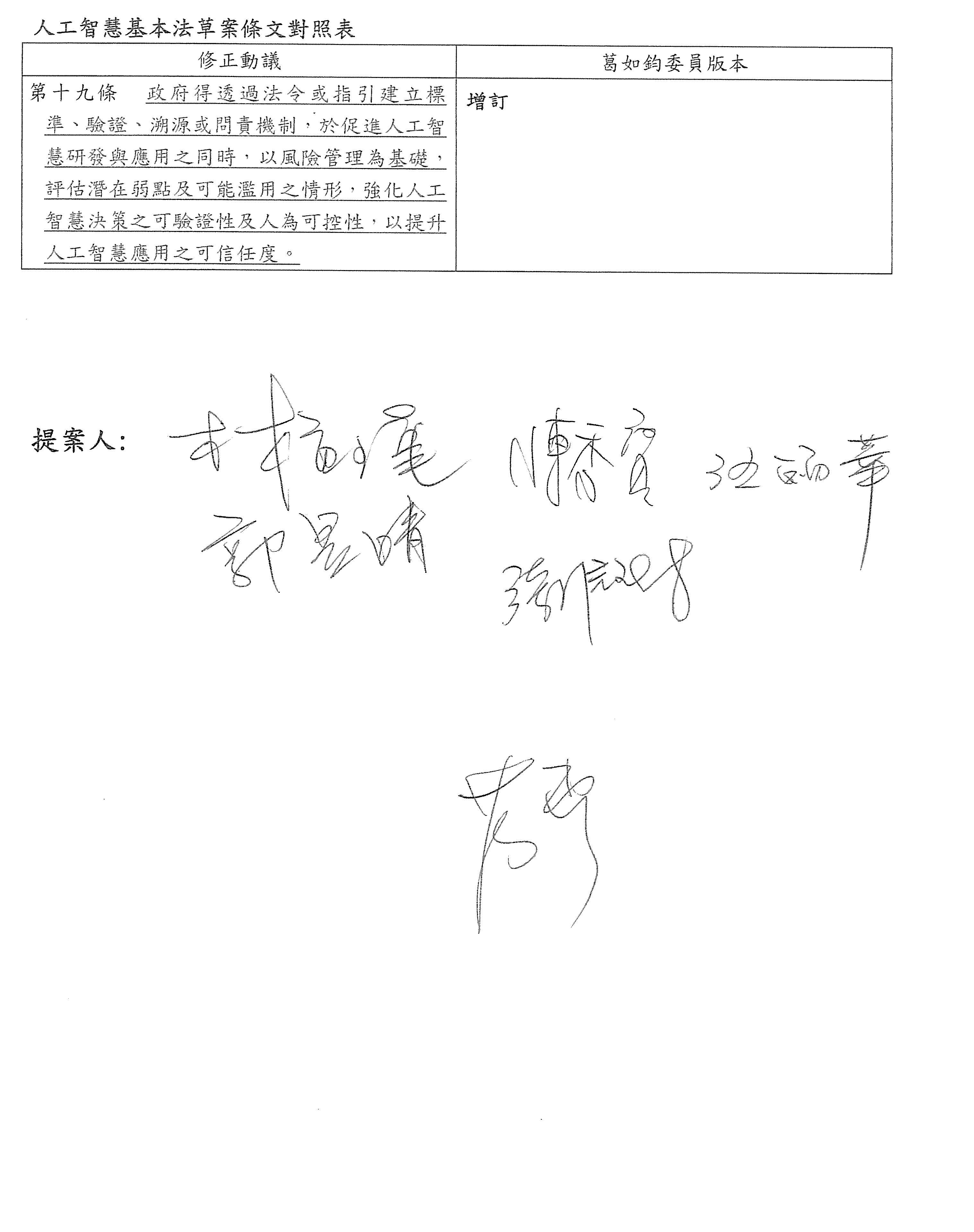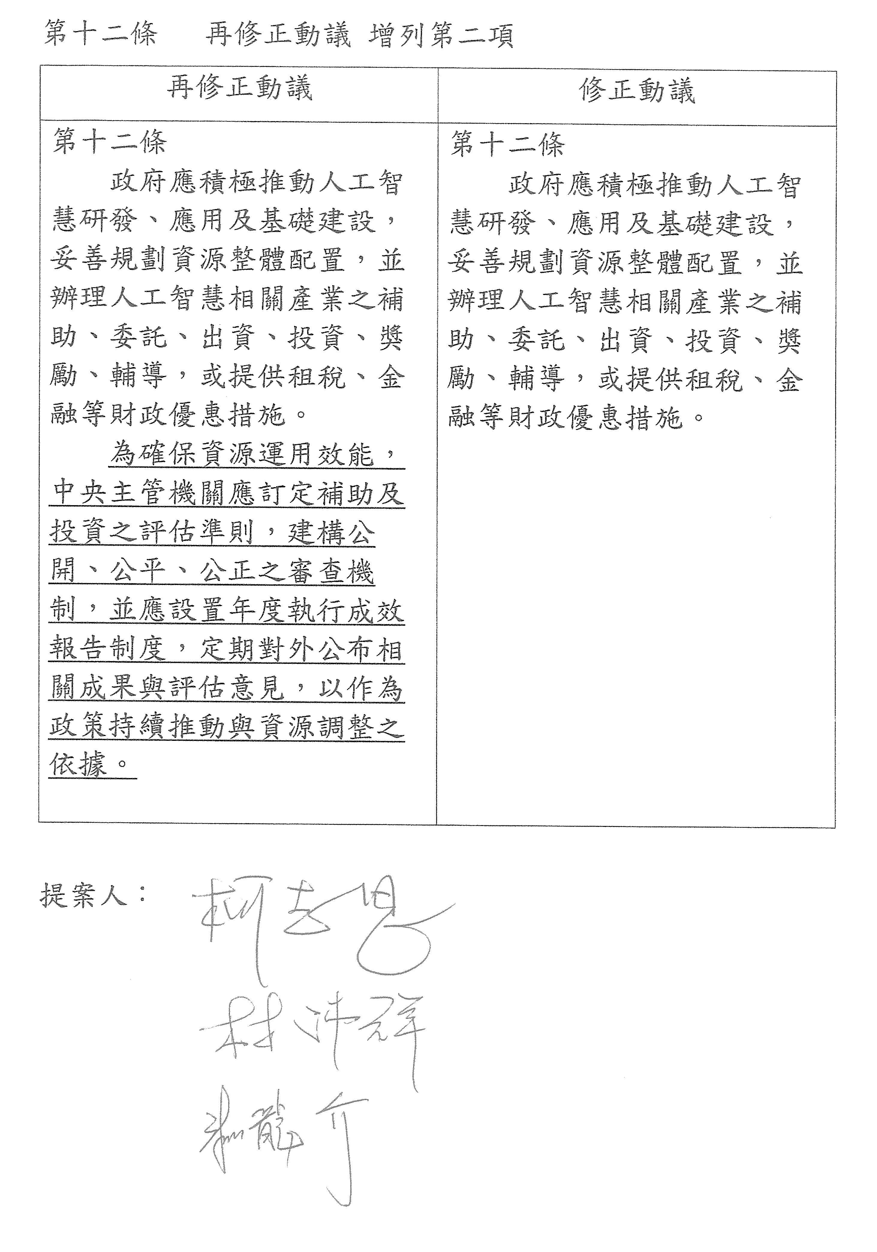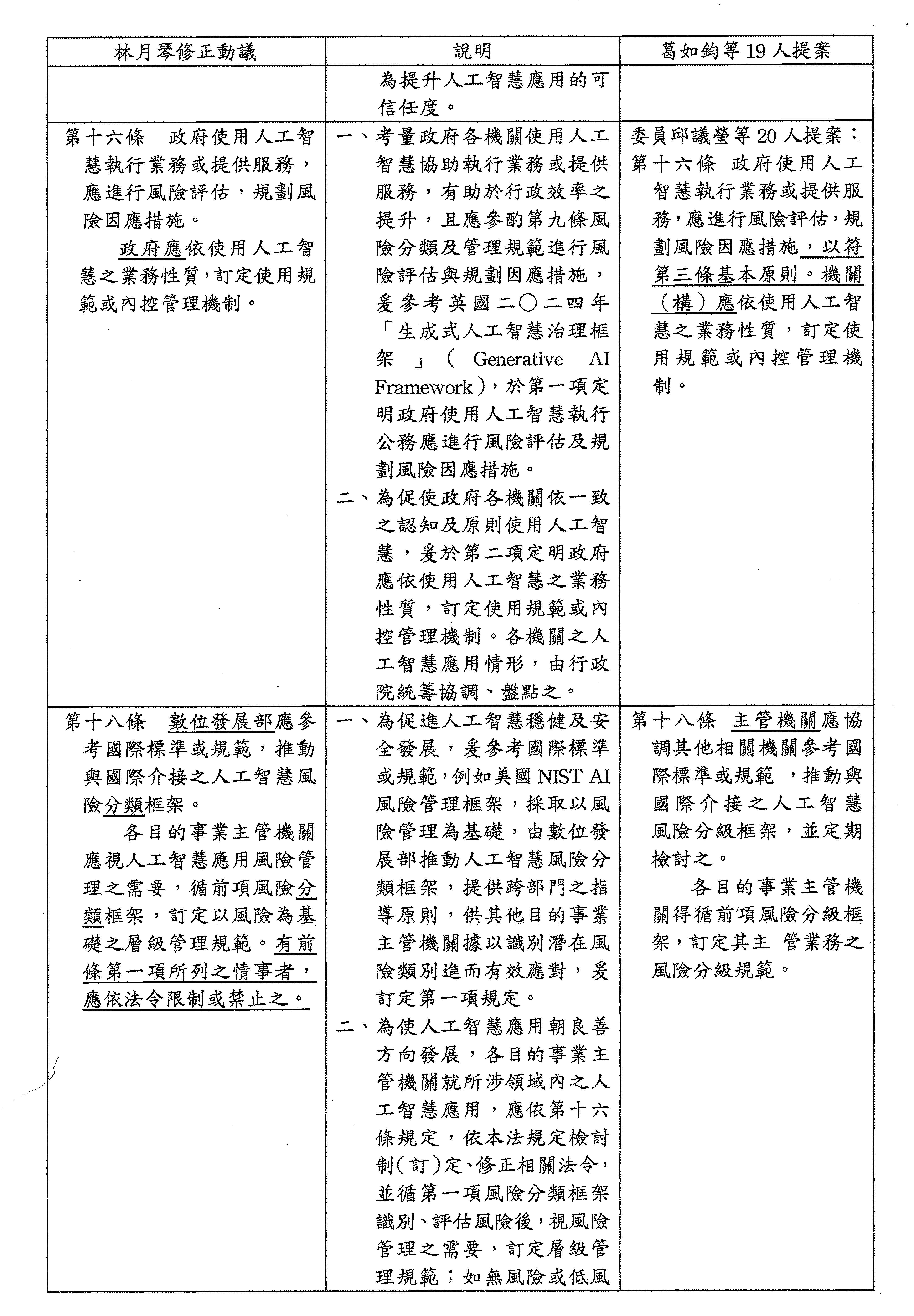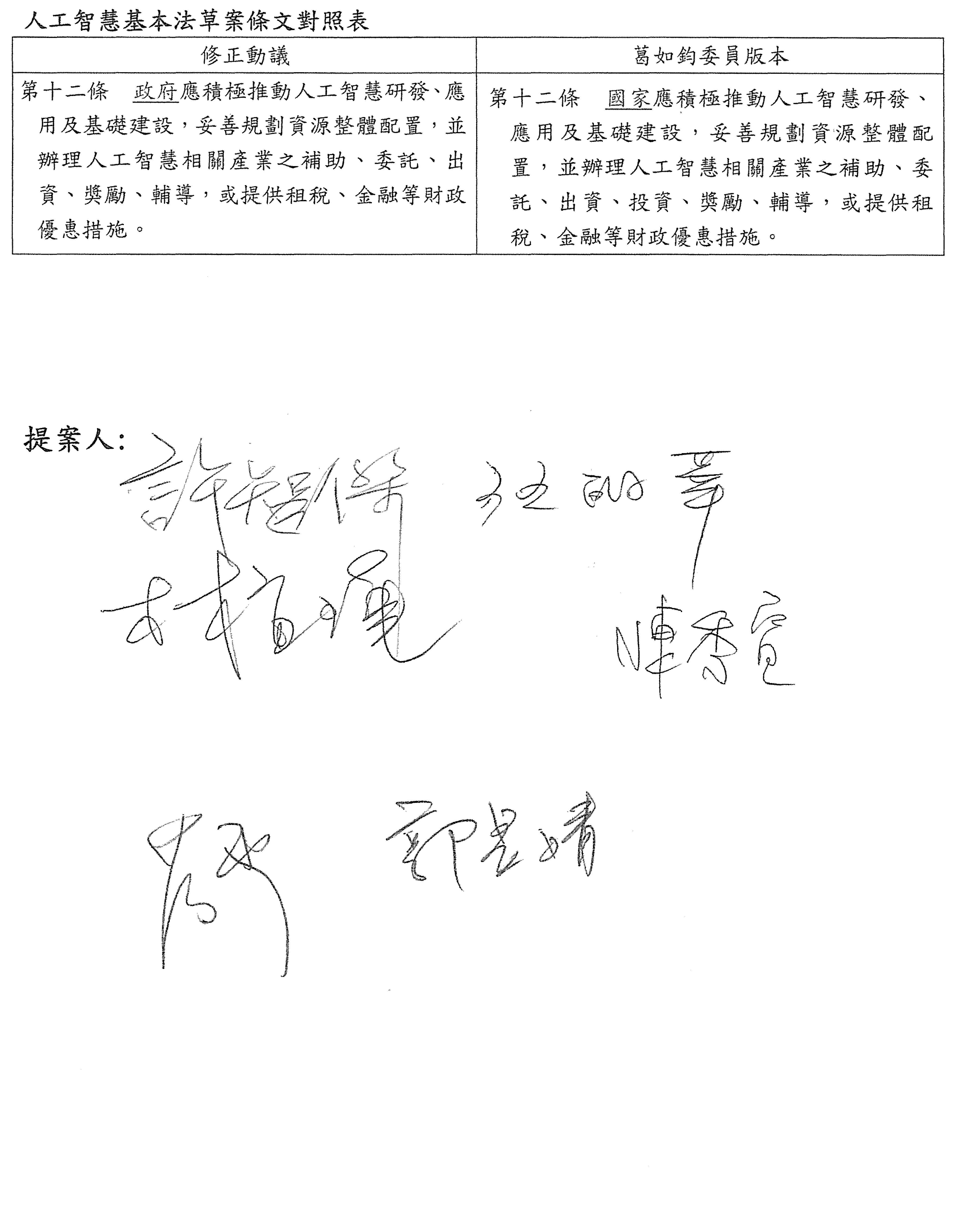 現在進行人工智慧基本法草案逐條審查,並進行討論與協商;討論時如有新增修正動議,請議事人員宣讀。