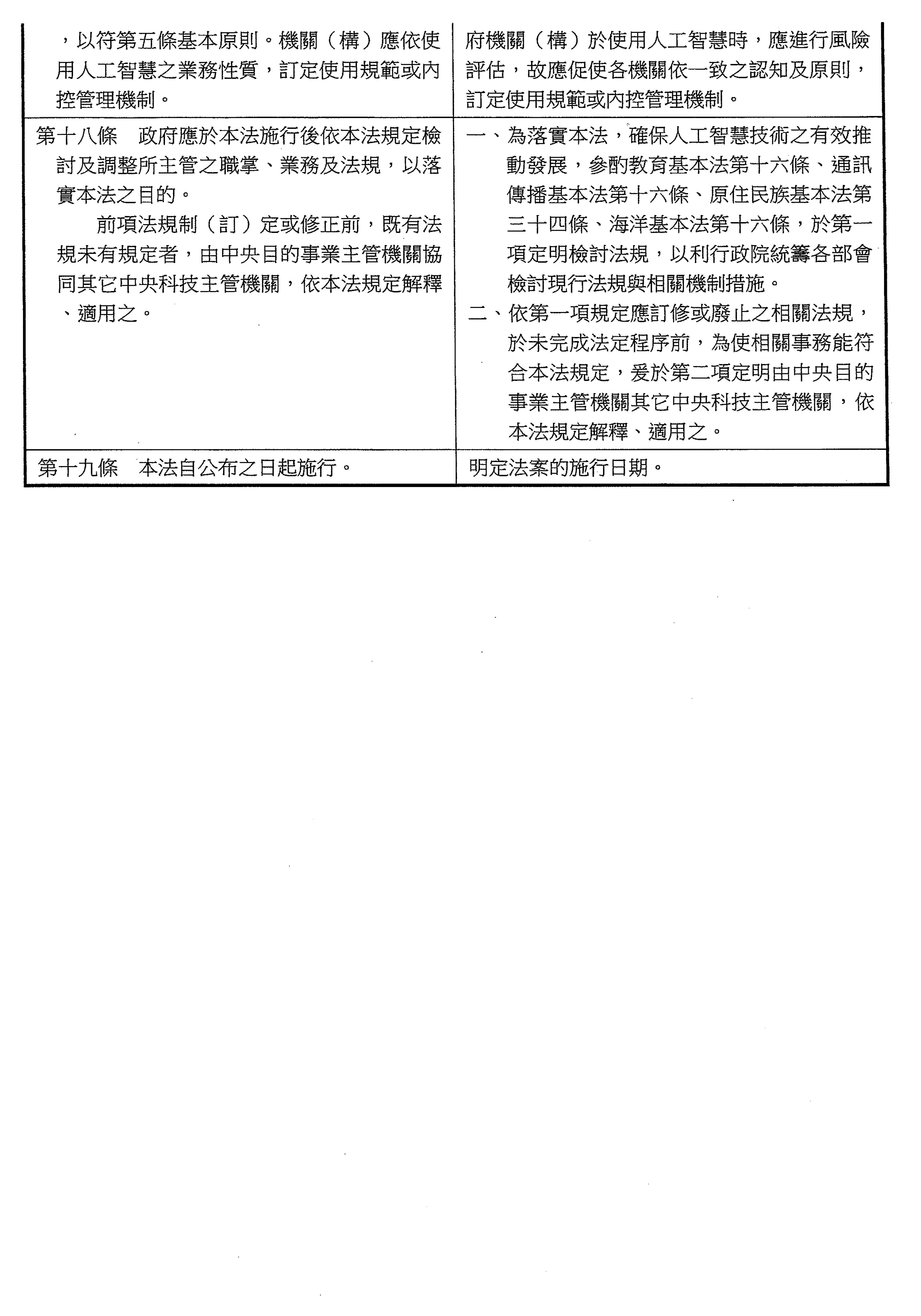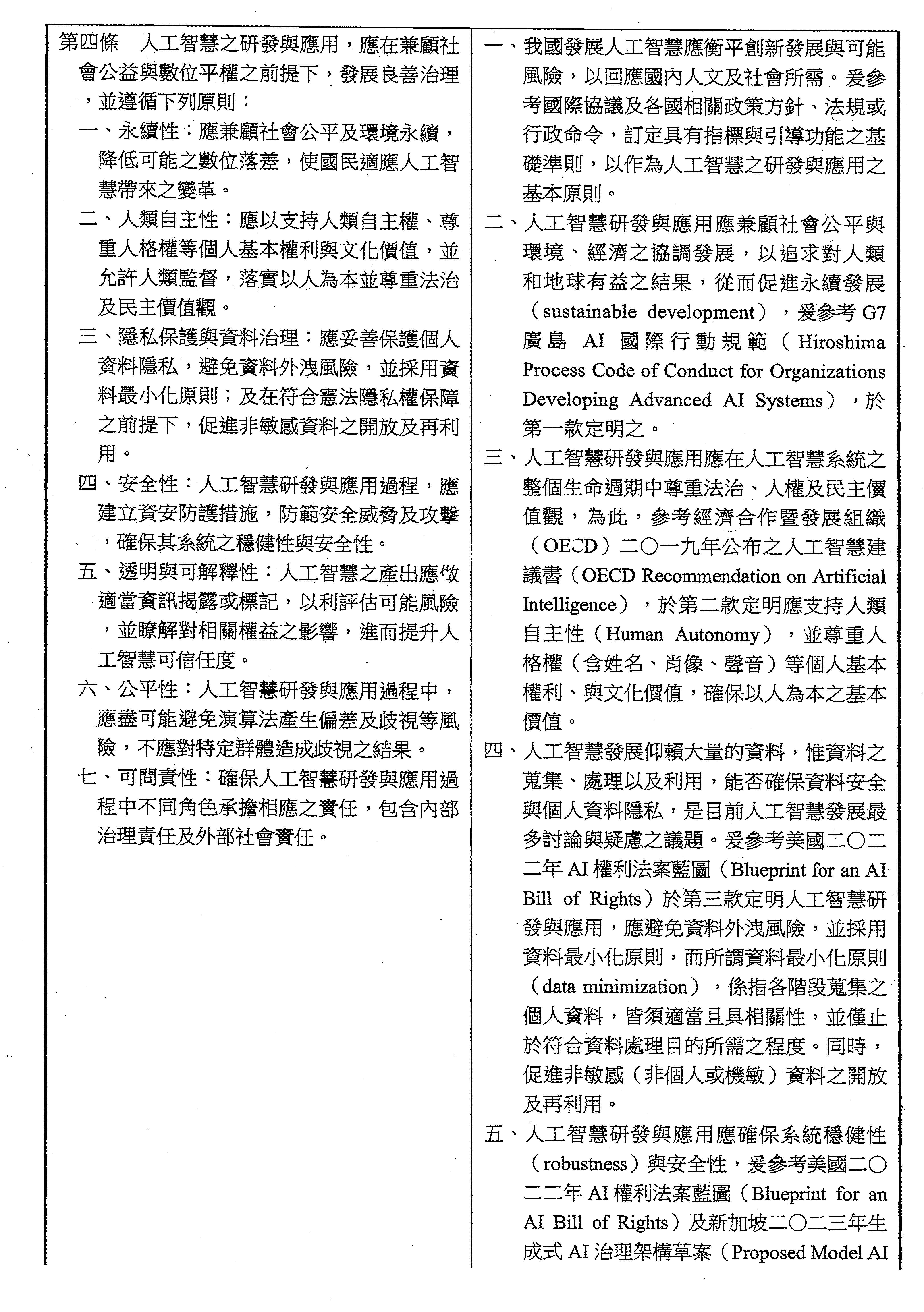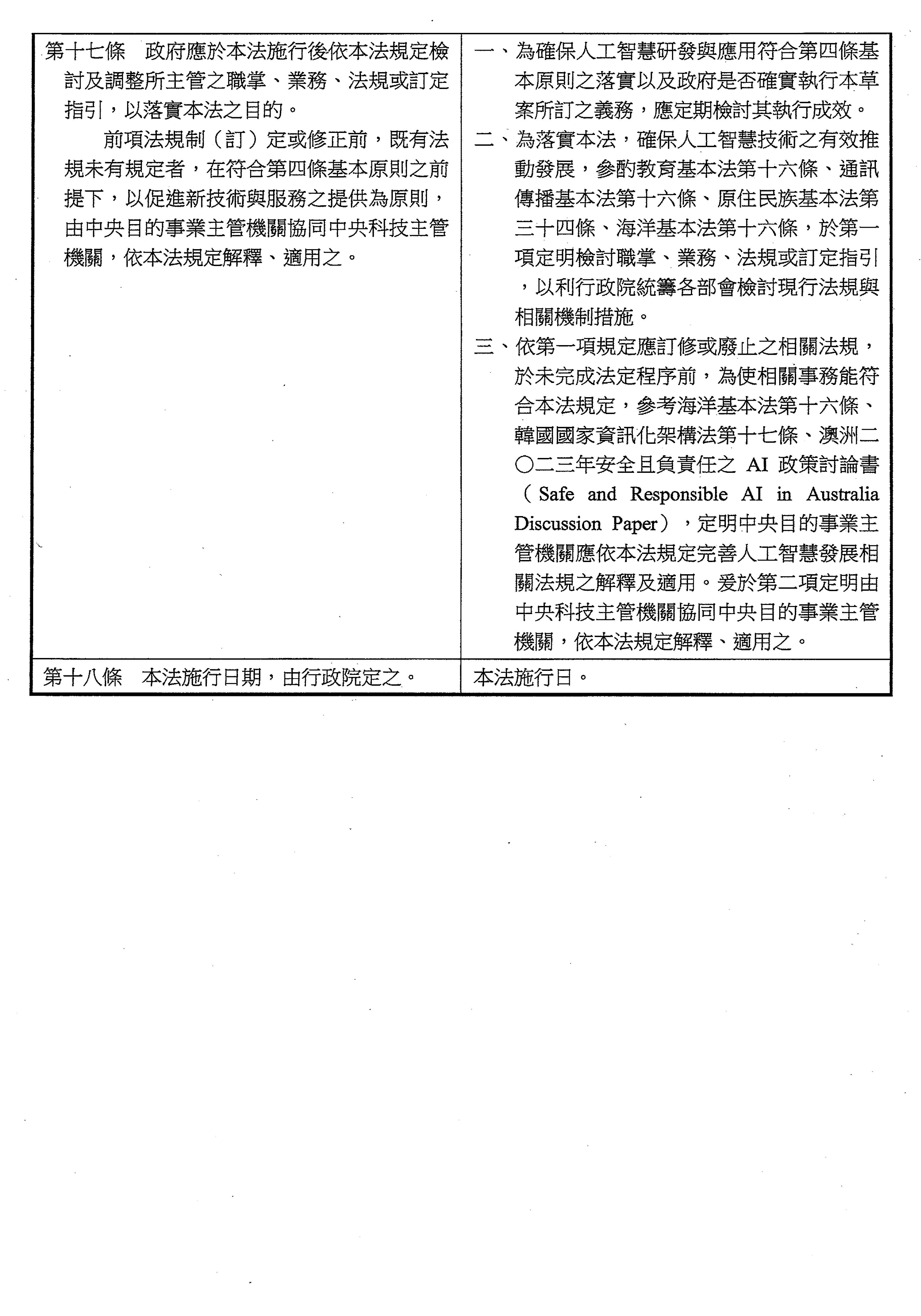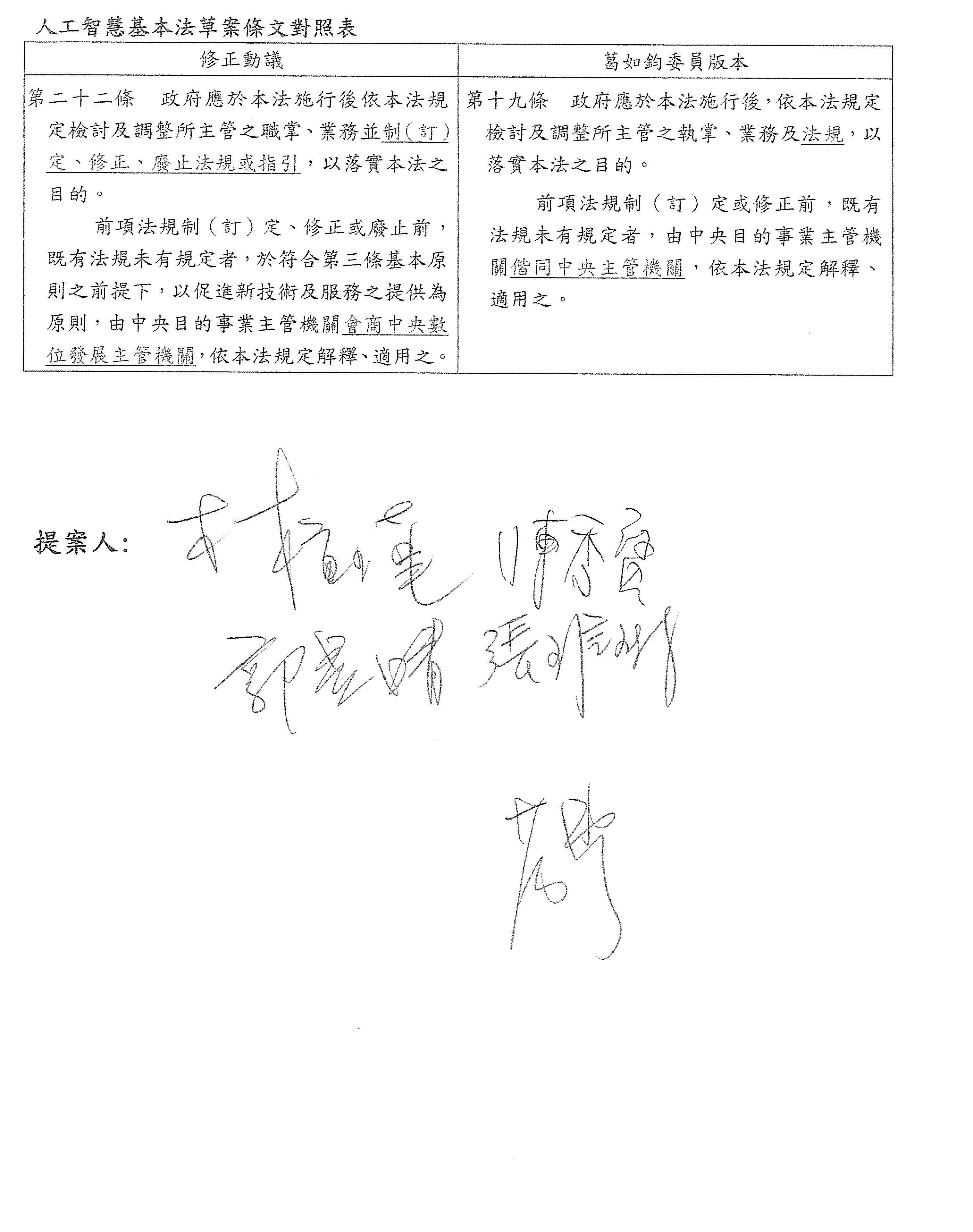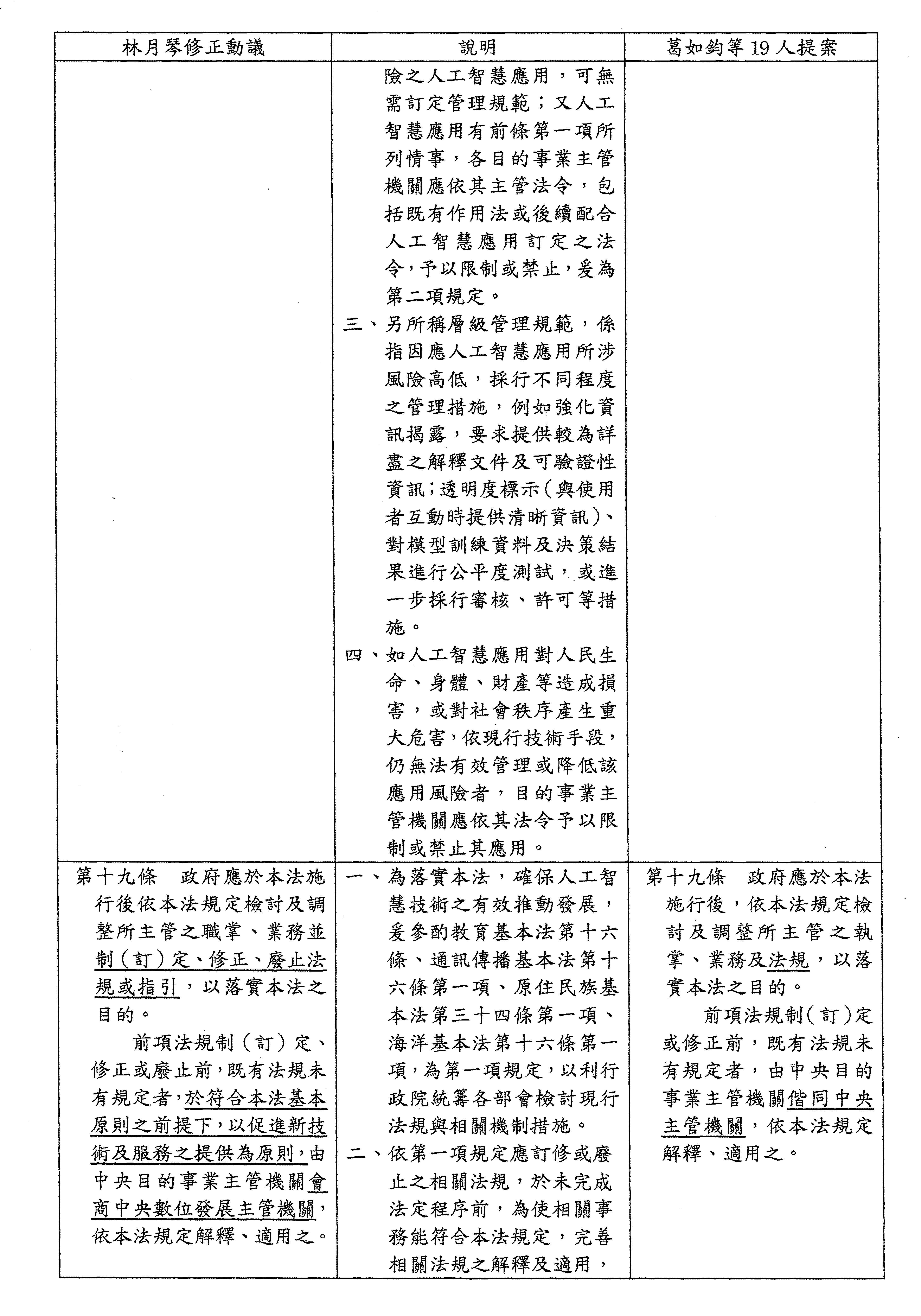 現在進行人工智慧基本法草案逐條審查,並進行討論與協商;討論時如有新增修正動議,請議事人員宣讀。