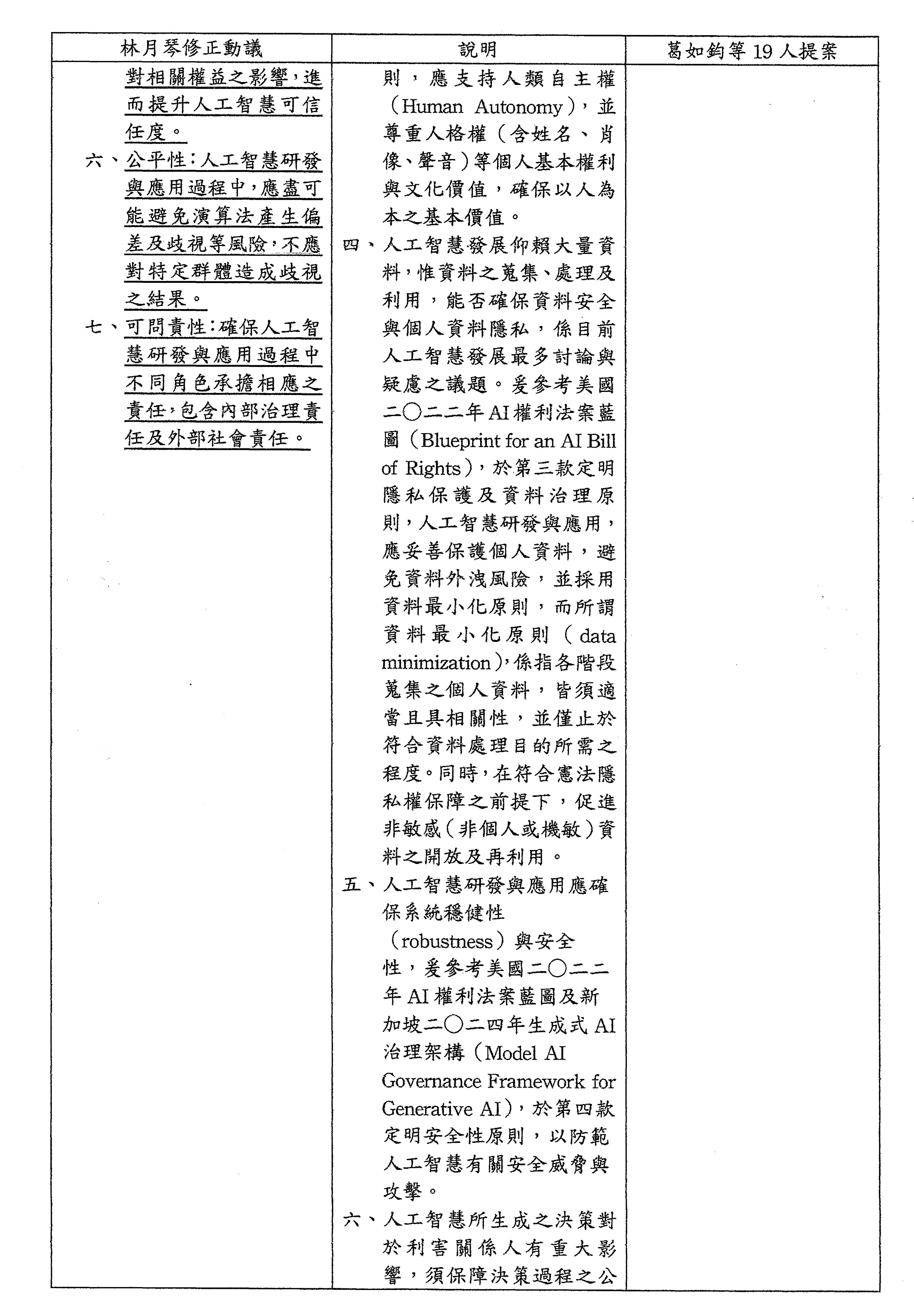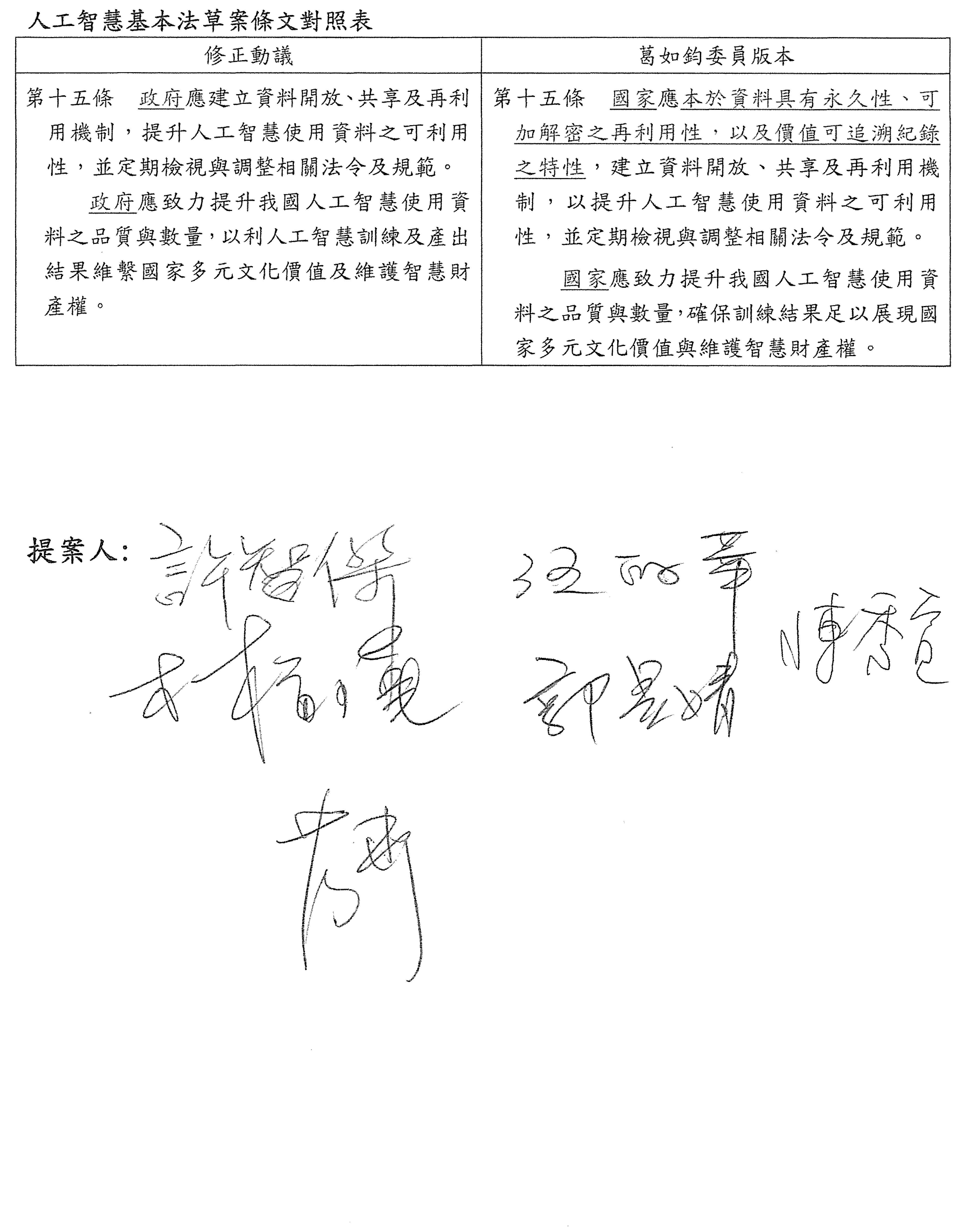 吳主任委員誠文:我們建議修正,因為國科會是負責研發,是我們的業務,而這個是在施行、應用的時候會碰到的問題,所以我們回到行政院,我希望就是以行政院科技政委的身分來督導我們的數發部、國科會、衛福部、教育部等等,就是這幾個部會要在行政院去做討論,來處理這個事情,就依照這個修正的意見。
