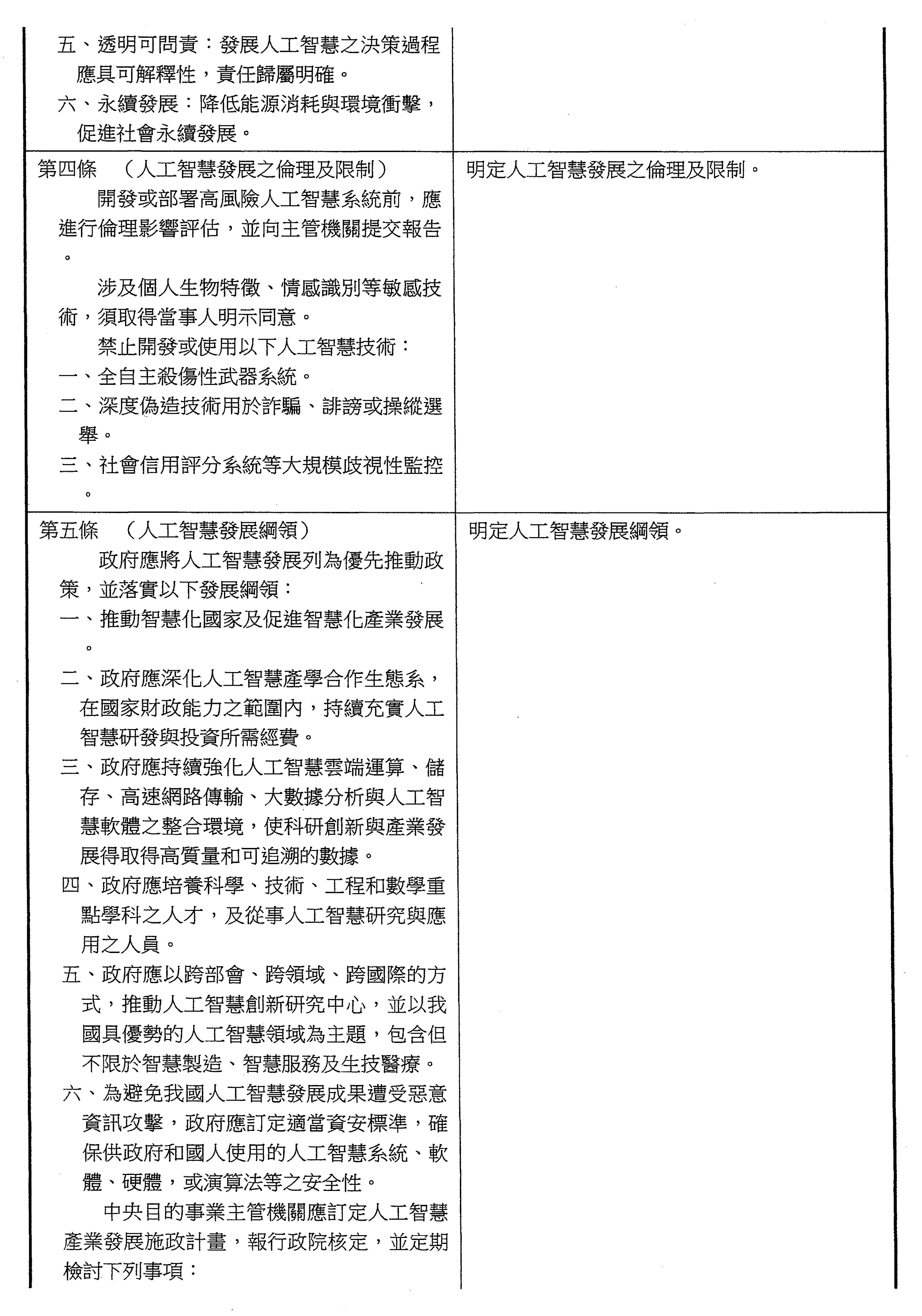 二、審查(一)委員張雅琳等18人擬具「人工智慧基本法草案」案。(二)委員謝衣鳯等17人擬具「人工智慧基本法草案」案。(三)委員陳秀寳等25人擬具「人工智慧基本法草案」案。(四)委員林思銘等17人擬具「人工智慧基本法草案」案。(五)委員范雲等18人擬具「人工智慧基本法草案」案。