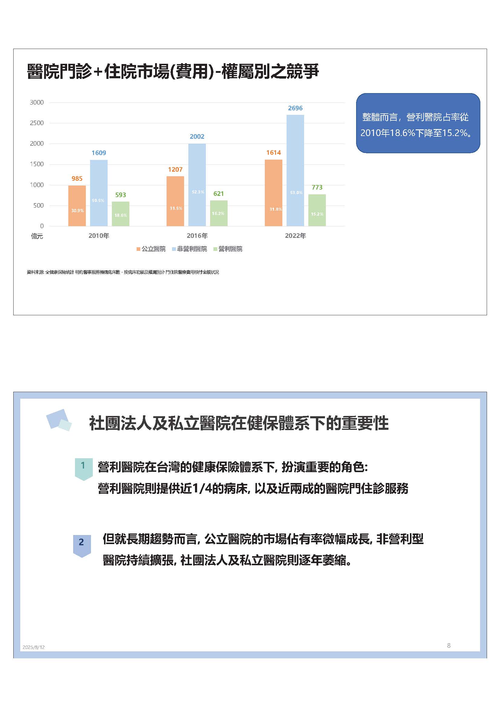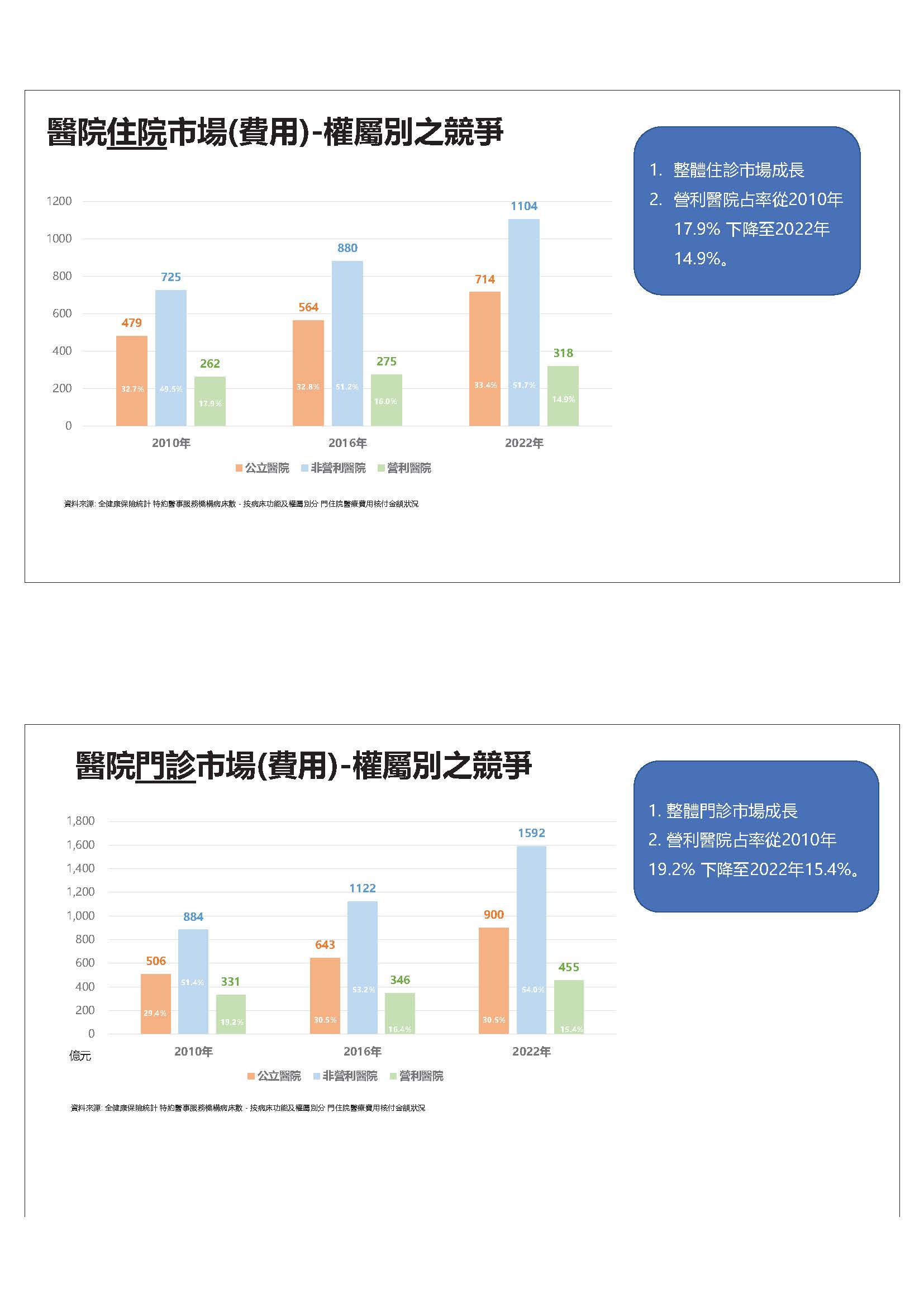 第二,醫療社團法人的公益與營利是相輔相成,事實的現況就是醫療社團法人除了謹守醫療法第五十三條的研究發展、人才培訓、社會服務事項,以及營運資金的規範外,同時我們也是營利事業單位課稅的對象,並且我們可以對我們的社員發配盈餘,所以對醫療社團法人來講,公益與營利本身就是共同存在的一個事實。剛剛邱會也提到了,所以未來醫療社團法人會繼續保有公益性、資金彈性跟醫療體系的運用,也會強化對大眾的醫療照顧。