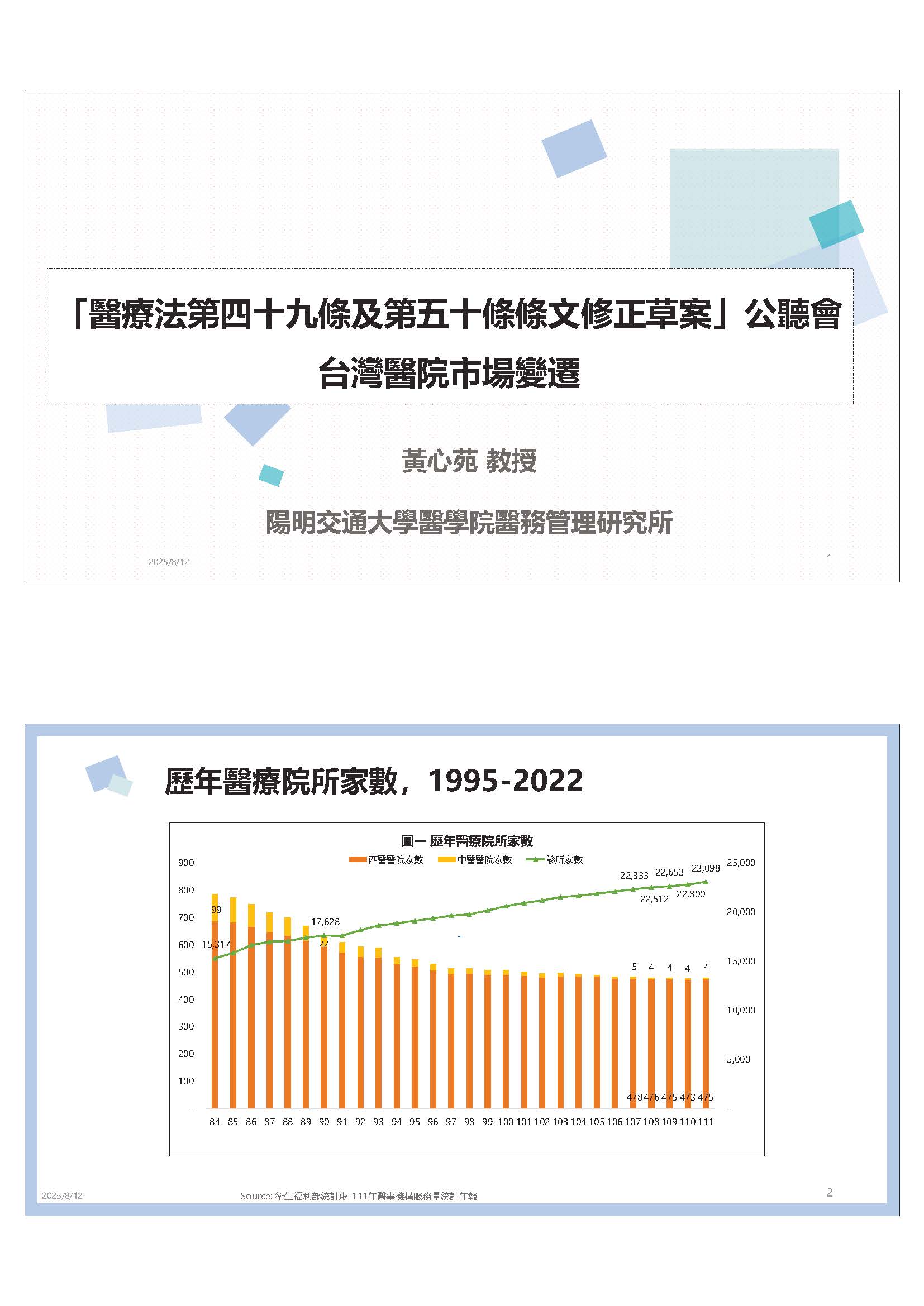 黃理事長靖媛:主席、各位委員以及先進,大家好,我是台灣醫療社團法人協會理事長。謝謝剛剛主席的介紹,也謝謝主席安排今天這個公聽會,讓我們有機會參與討論。台灣醫療社團法人協會是今年初才成立的協會,所以我們相當年輕,也很感謝我們社員的參加。