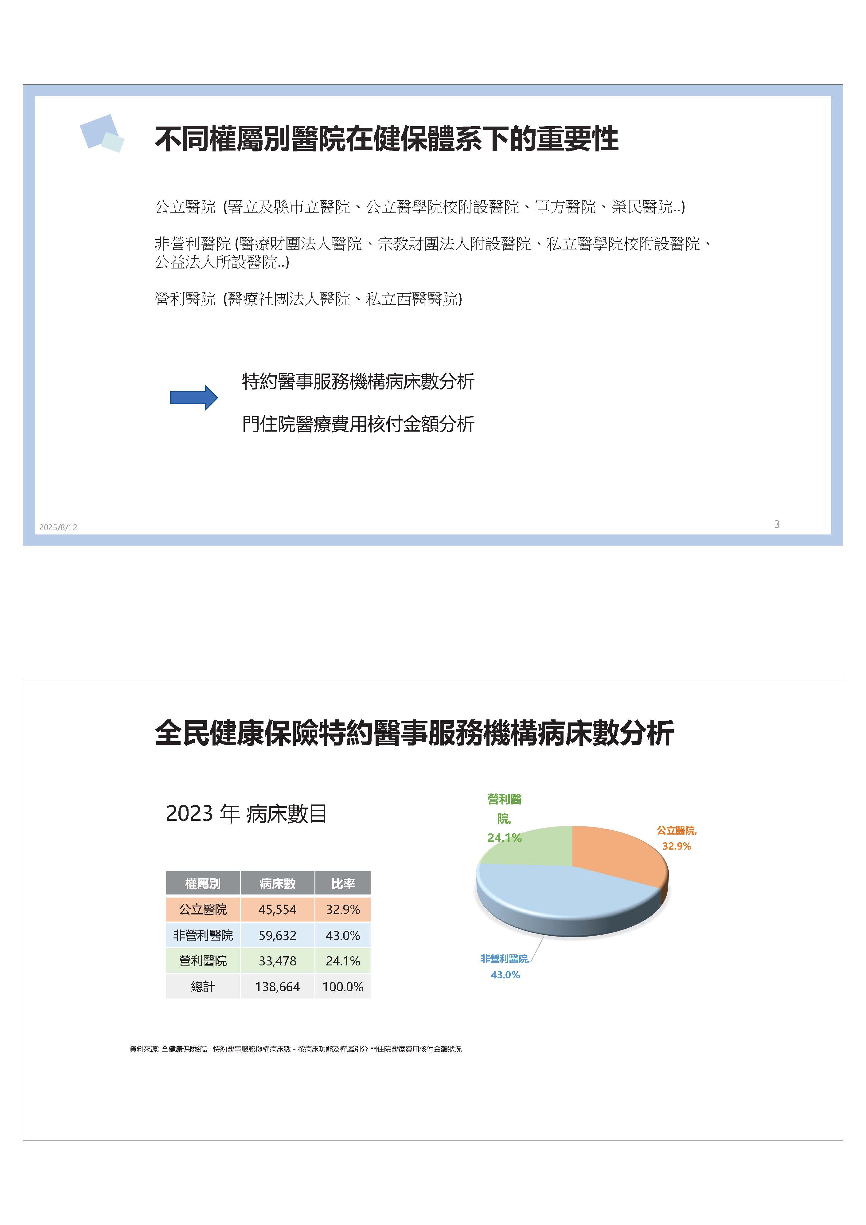 在屬性跟定位上,也就是權屬上公立醫院有公務預算挹注,財團法人有捐助的資源跟稅務的優惠等等,所以我想這個要監督管理沒有疑義。社團法人主要資金是來自於社員、私人投資,所以它就像一個公司的性質,在主管機關的管理思維上,我覺得重點應該放在輔導協助。社團法人本身有內控機制,它有董事會、社員總會,應該要讓它有一些公司治理的空間。