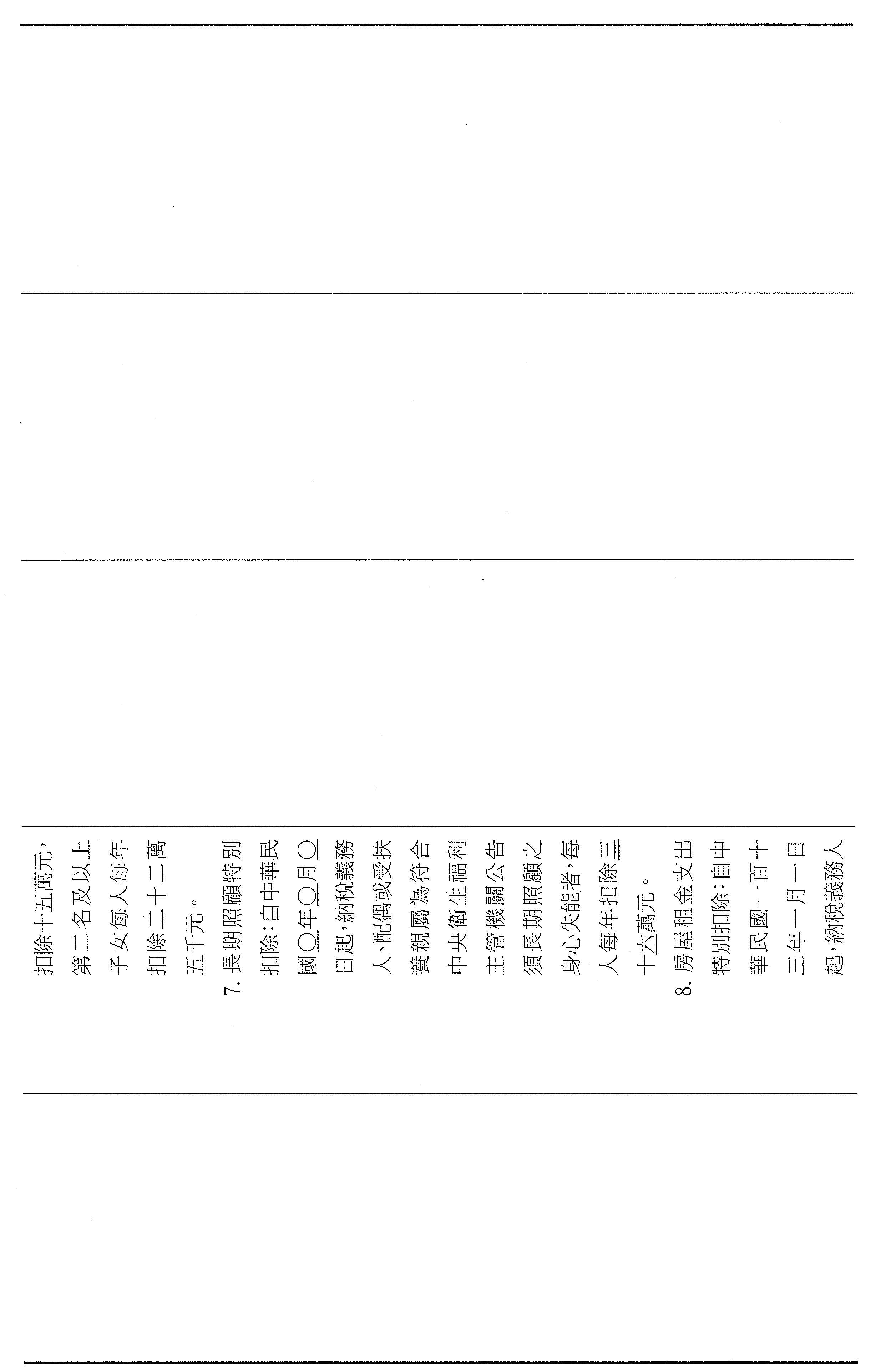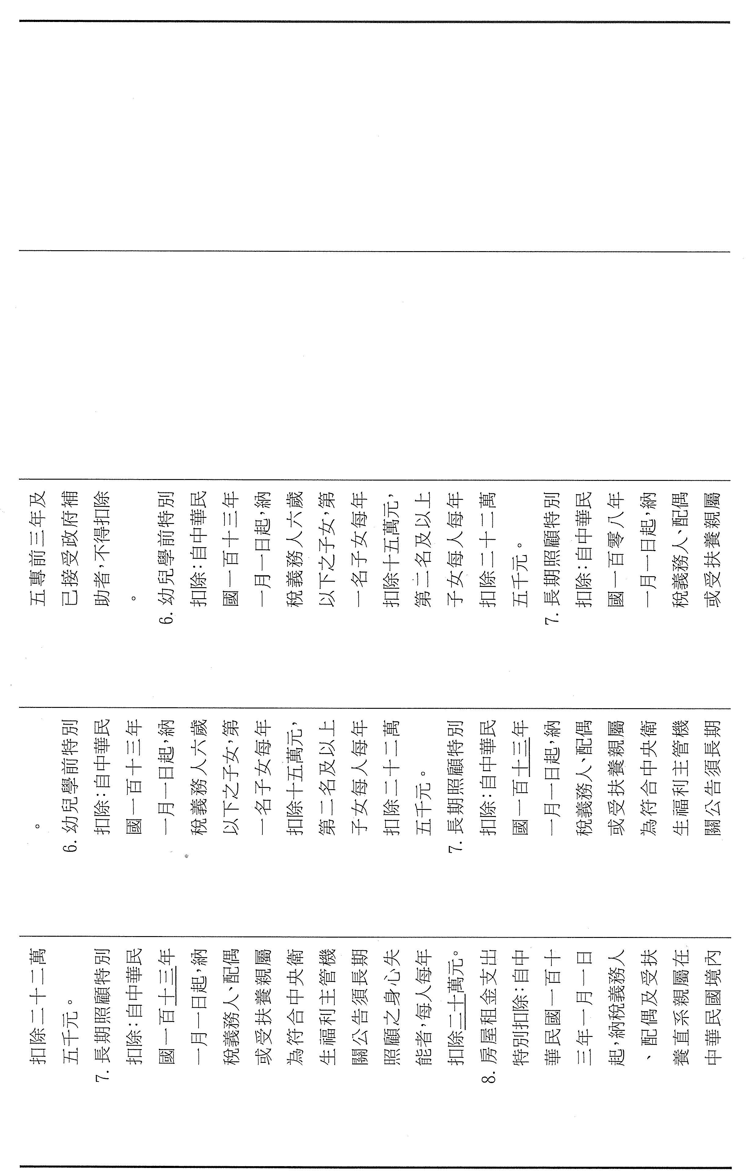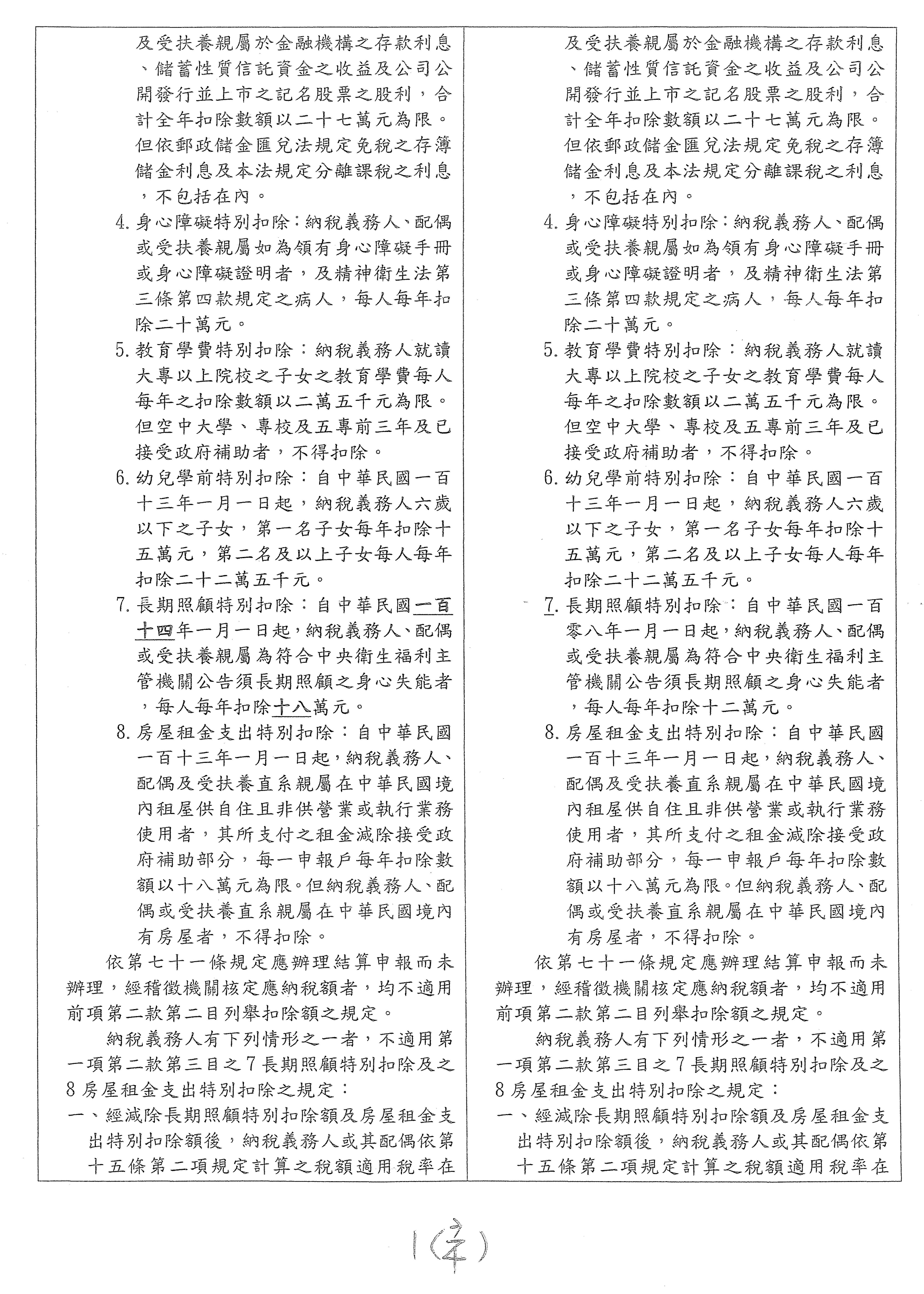 第十七條修正通過;修正第一項第二款第三目之七「長期照顧特別扣除:自中華民國一百十四年一月一日起,納稅義務人、配偶或受扶養親屬為符合中央衛生福利主管機關公告須長期照顧之身心失能者,每人每年扣除十八萬元。」
