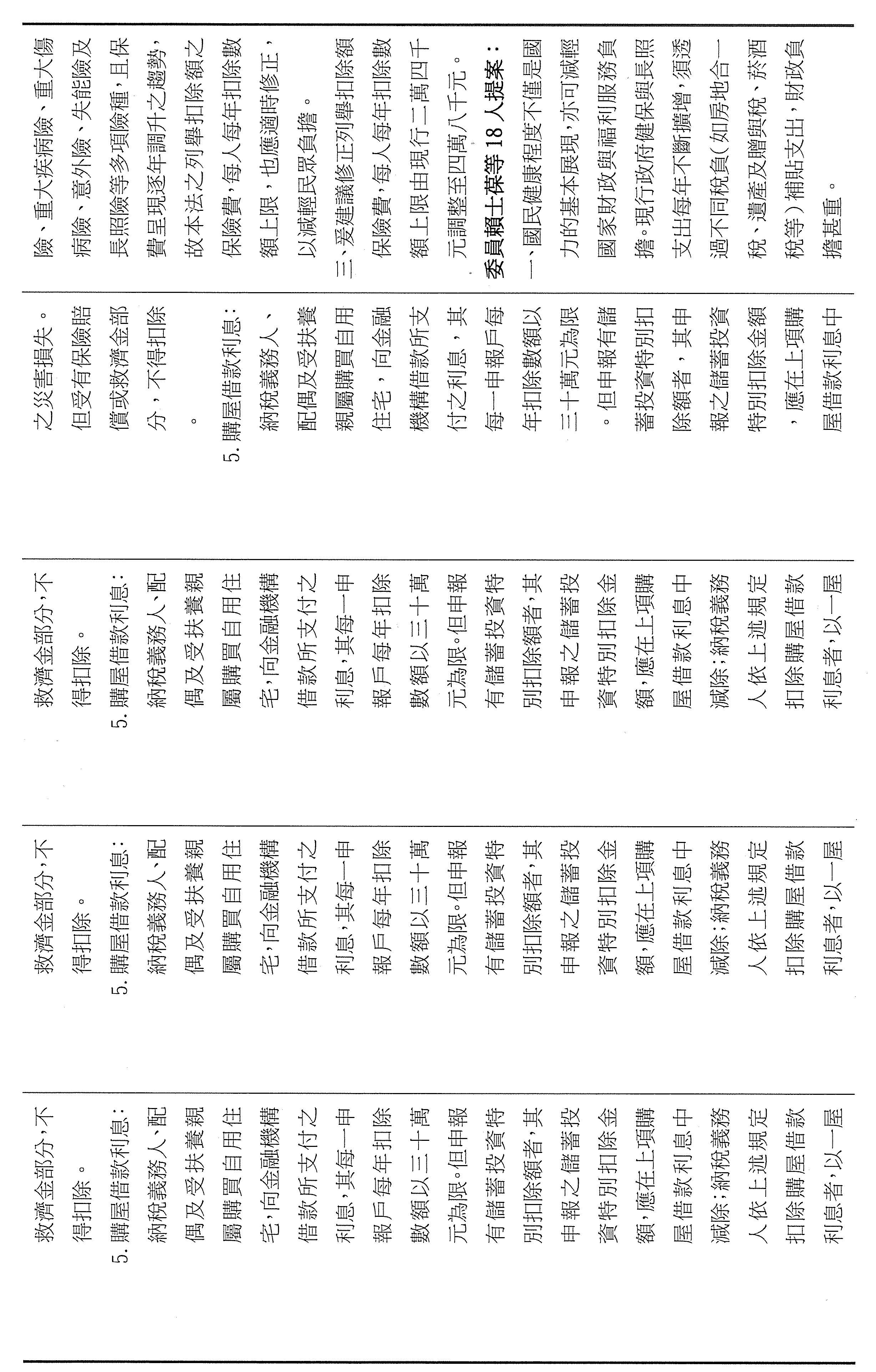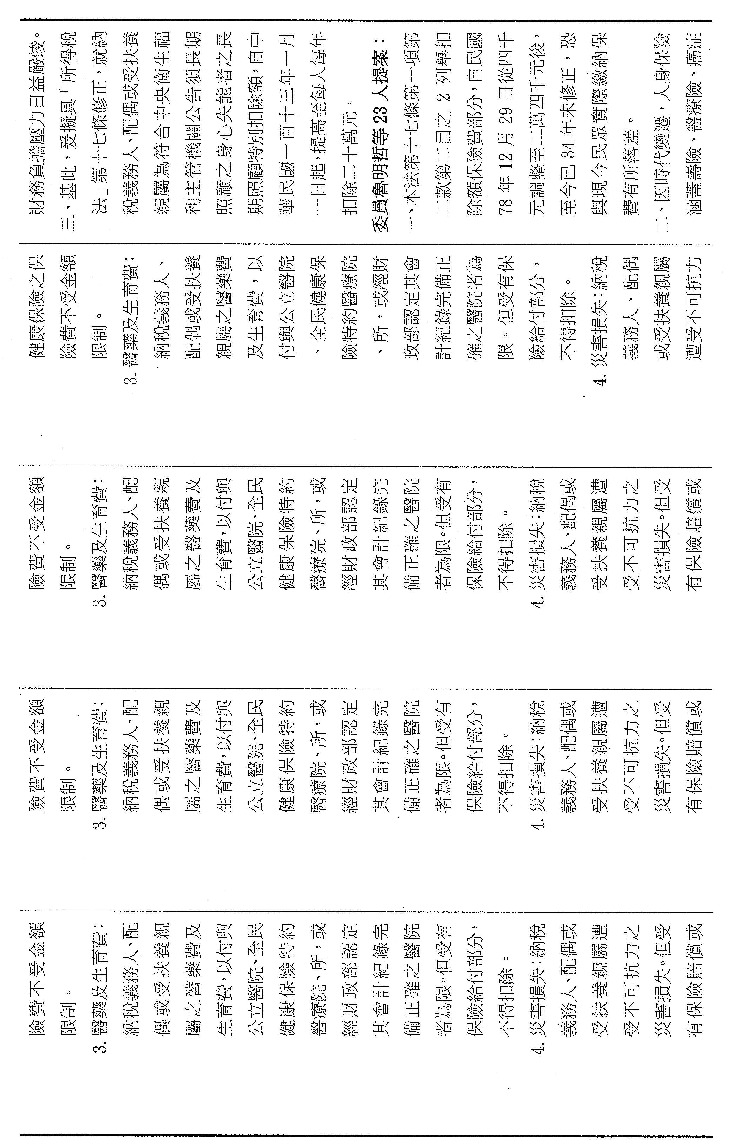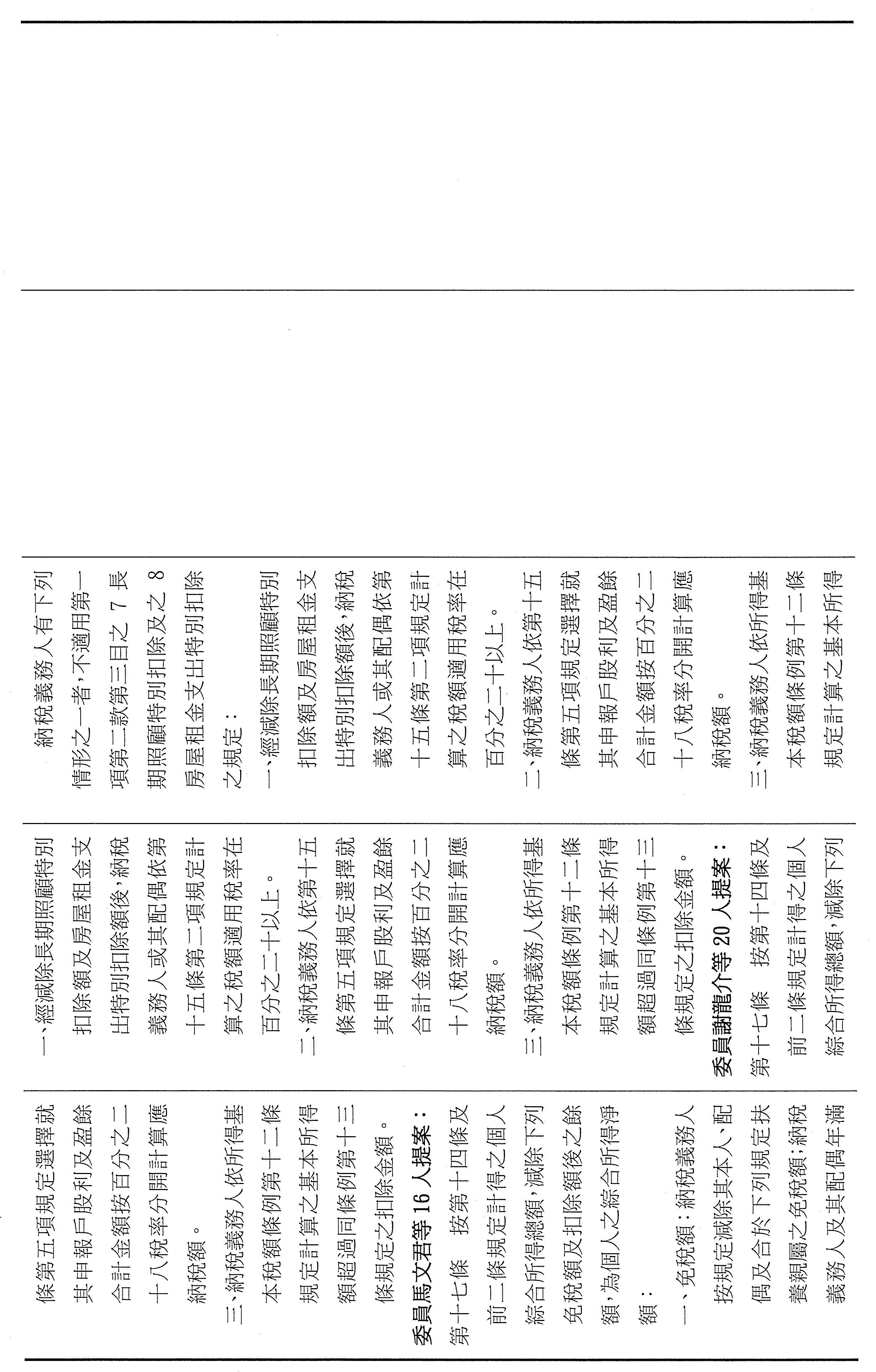 在今天的提案當中,召委主席排了包括第十五條以及第十七條等10個案子,坦白說,這11個案子要在今天全部加以討論,恐怕有實質上的困難,因為這當中包括第十五條所提到的要將股利可抵減稅額提高。第十七條的部分,包括對於子女的免稅額要提高,也包括對於保險費的列舉扣除額提高。還有對於健康檢查分別有兩個提案,一個是在列舉扣除額,一個是特別扣除額提高。另外包括有投資支出的列舉扣除額要提高,以及最後以國民黨為主有多達6個委員提案,都是針對長照特別扣除額。
