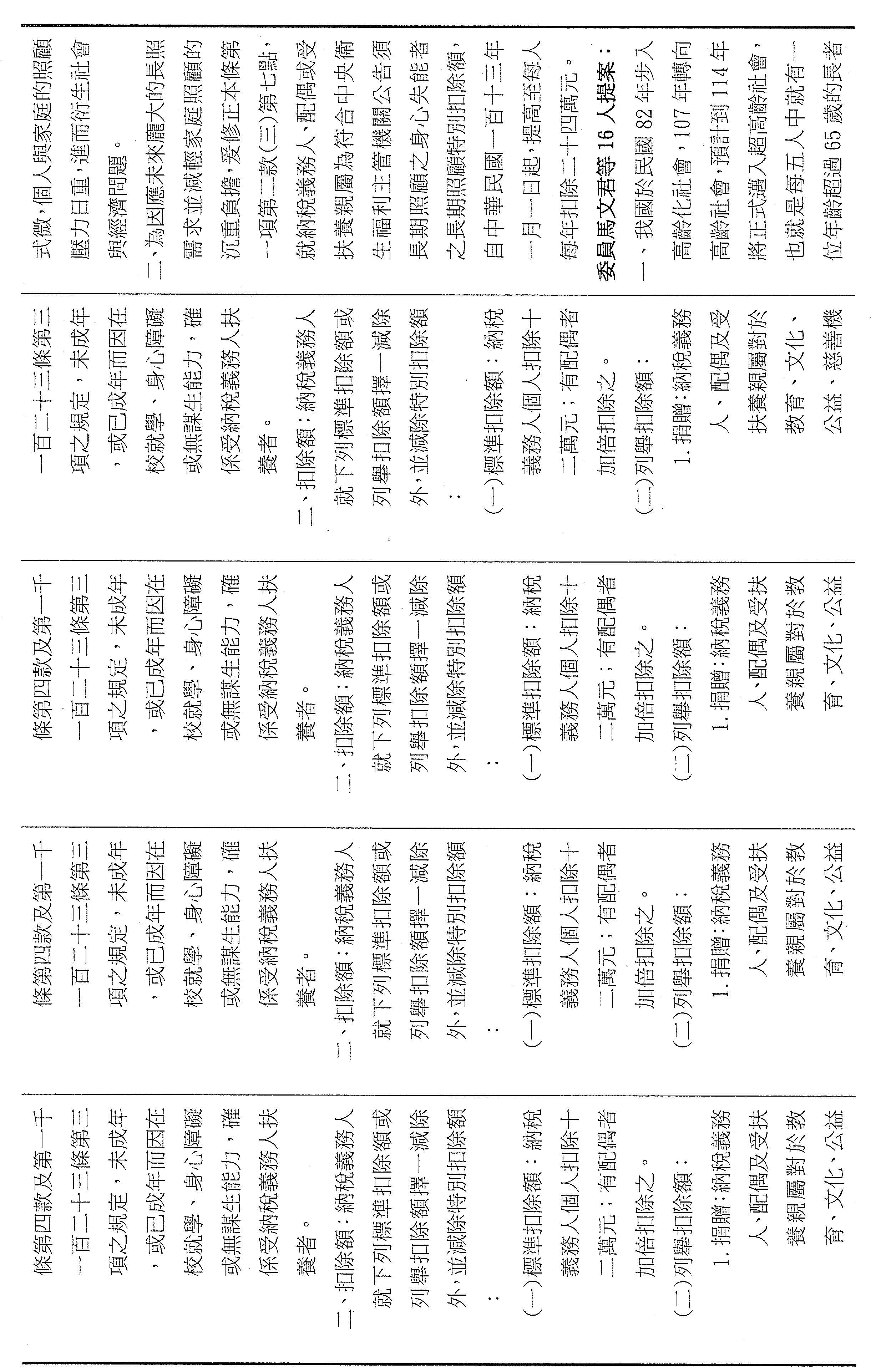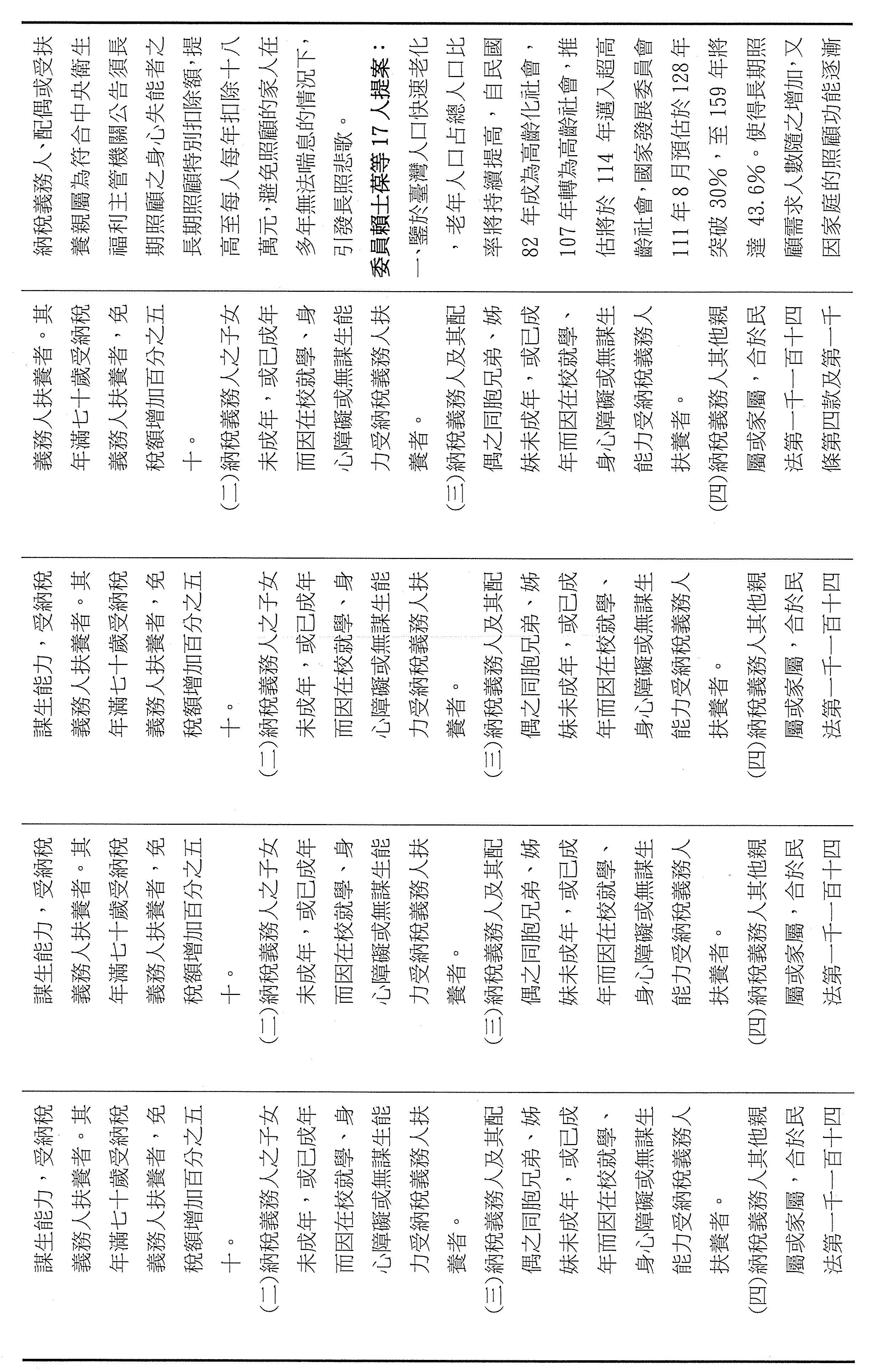 莊部長翠雲:剛剛我們也看了委員們的提案、黨團提案,還有民進黨及民眾黨的提案,都是對於長照的部分,長照特別扣除額是在107年法案修正了以後增加的,我們也知道人口結構的變動,老人化是現在的情況,家庭如果有需要照顧的人的話,確實是辛苦,當然支出也會增加,所以當時就有一個特別扣除額12萬,也經過一段時間,委員們都非常理解家庭的需求而提案,提案內容都是以18萬為主,所以我們還是建議18萬的額度,因為這個稅損未來可能會超過10億以上,目前只是以現在的金額來算就至少有10億,我想這個部分是不是請委員都能夠理解,在稅損可控的情況下做調整?以上。