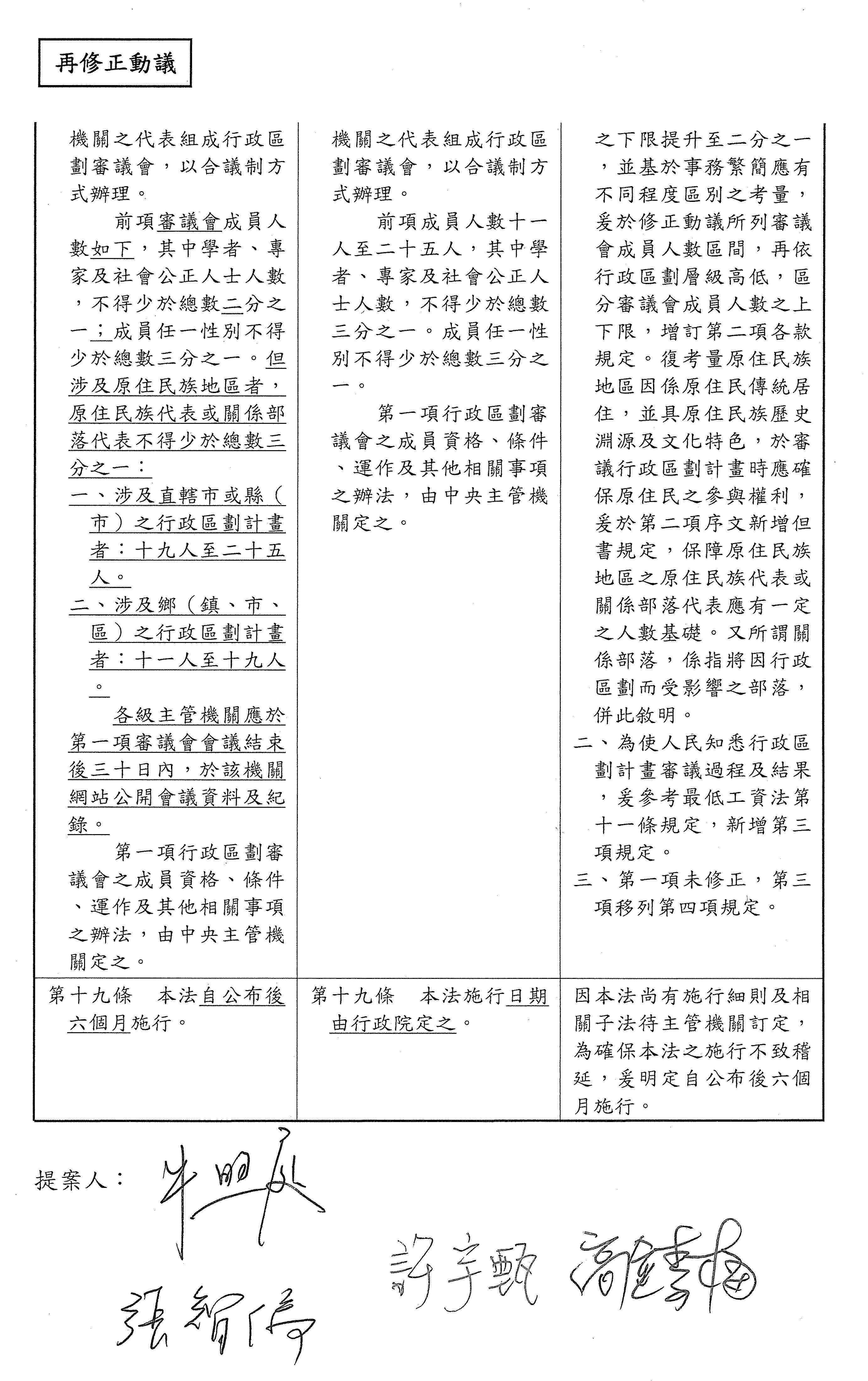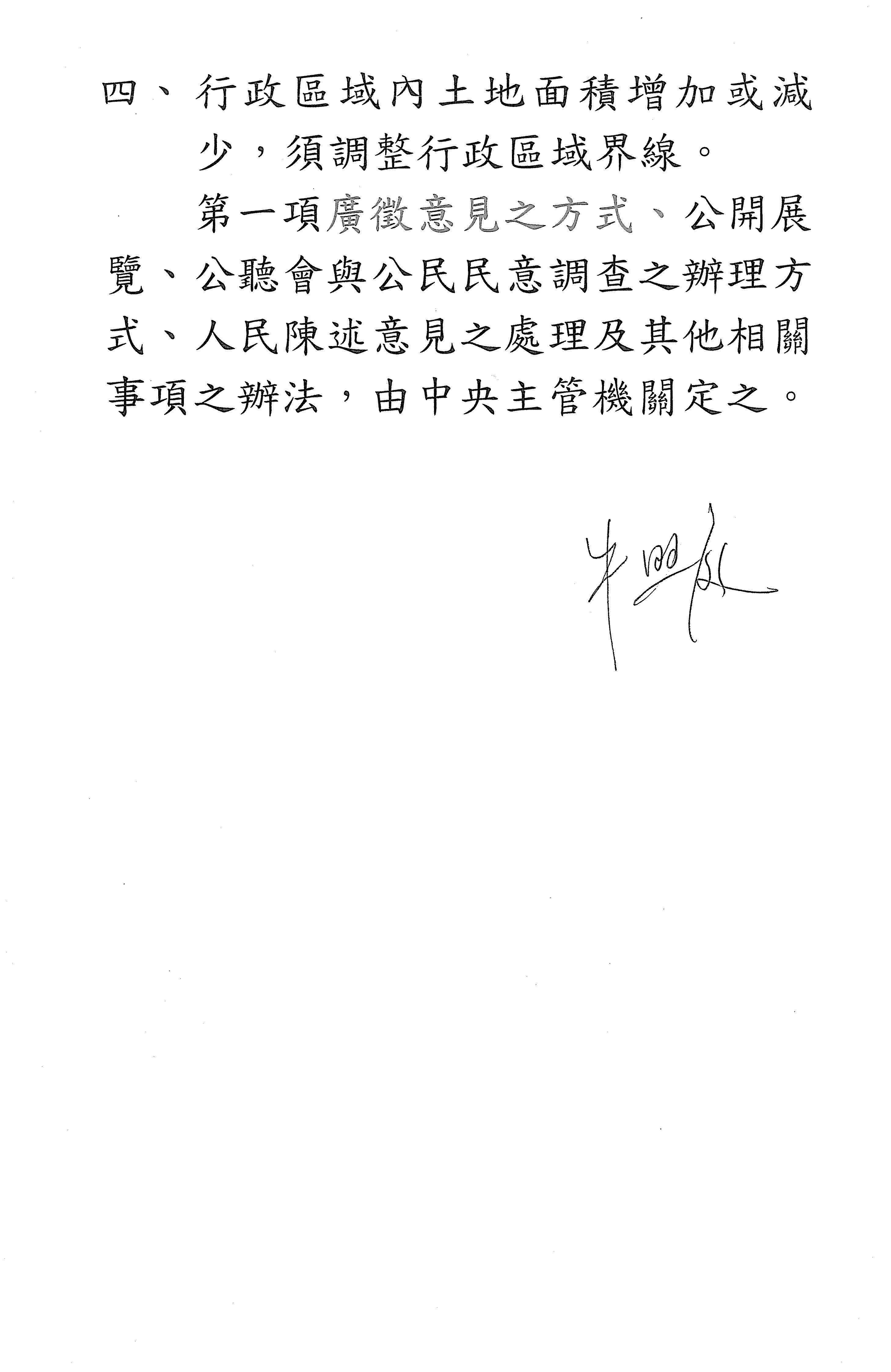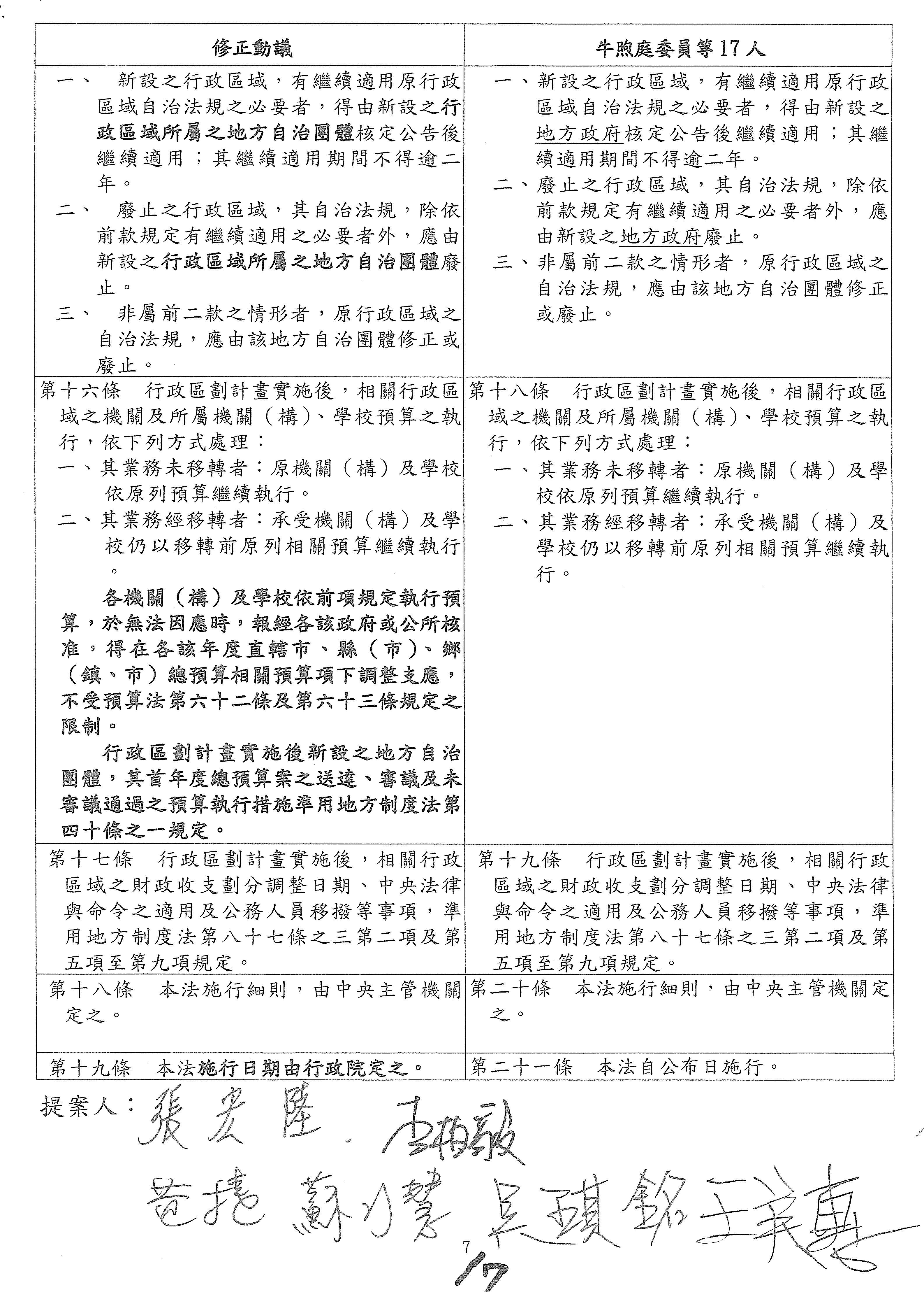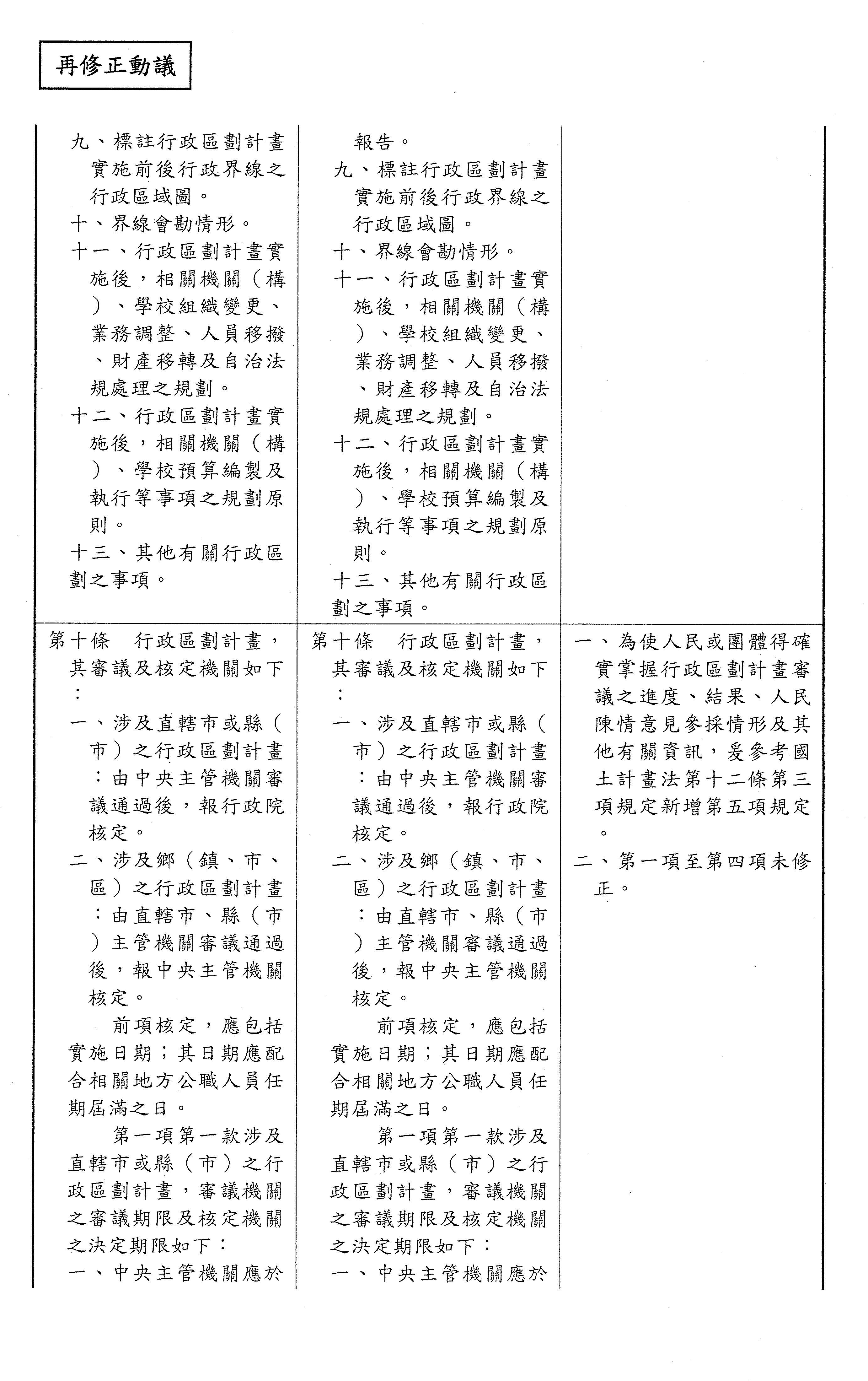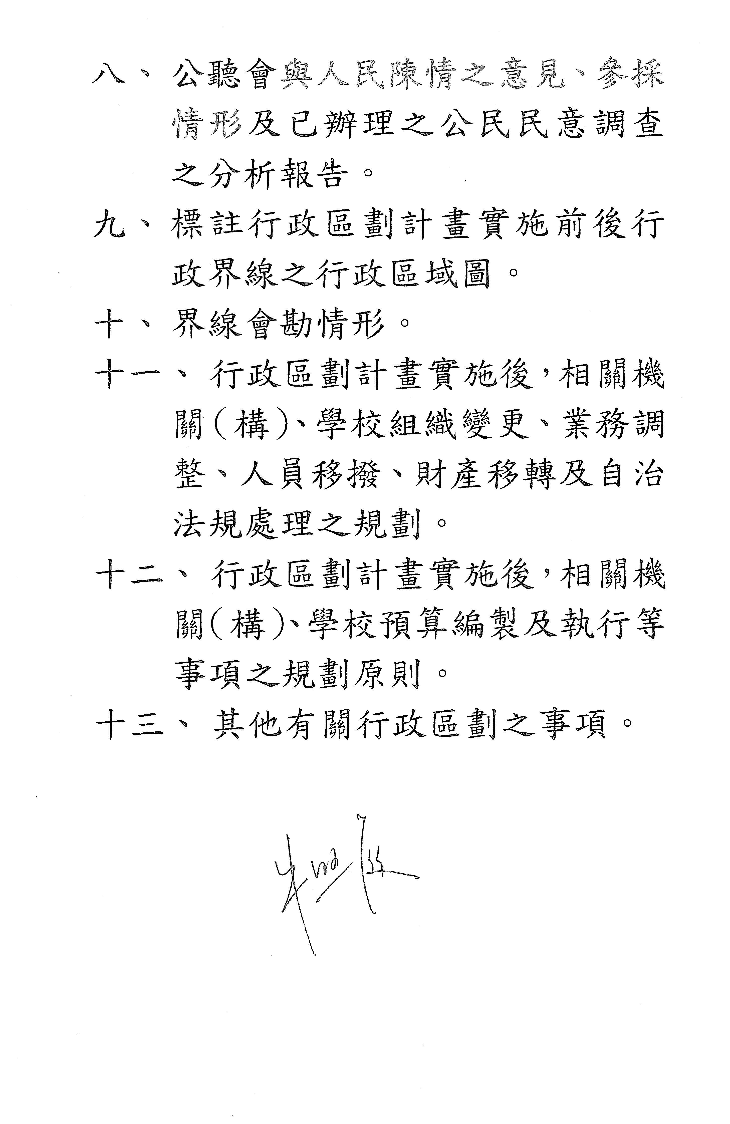報告委員會,現在針對「行政區劃法」的保留條文進行處理,請宣讀新增的修正動議以及相關附帶決議。
