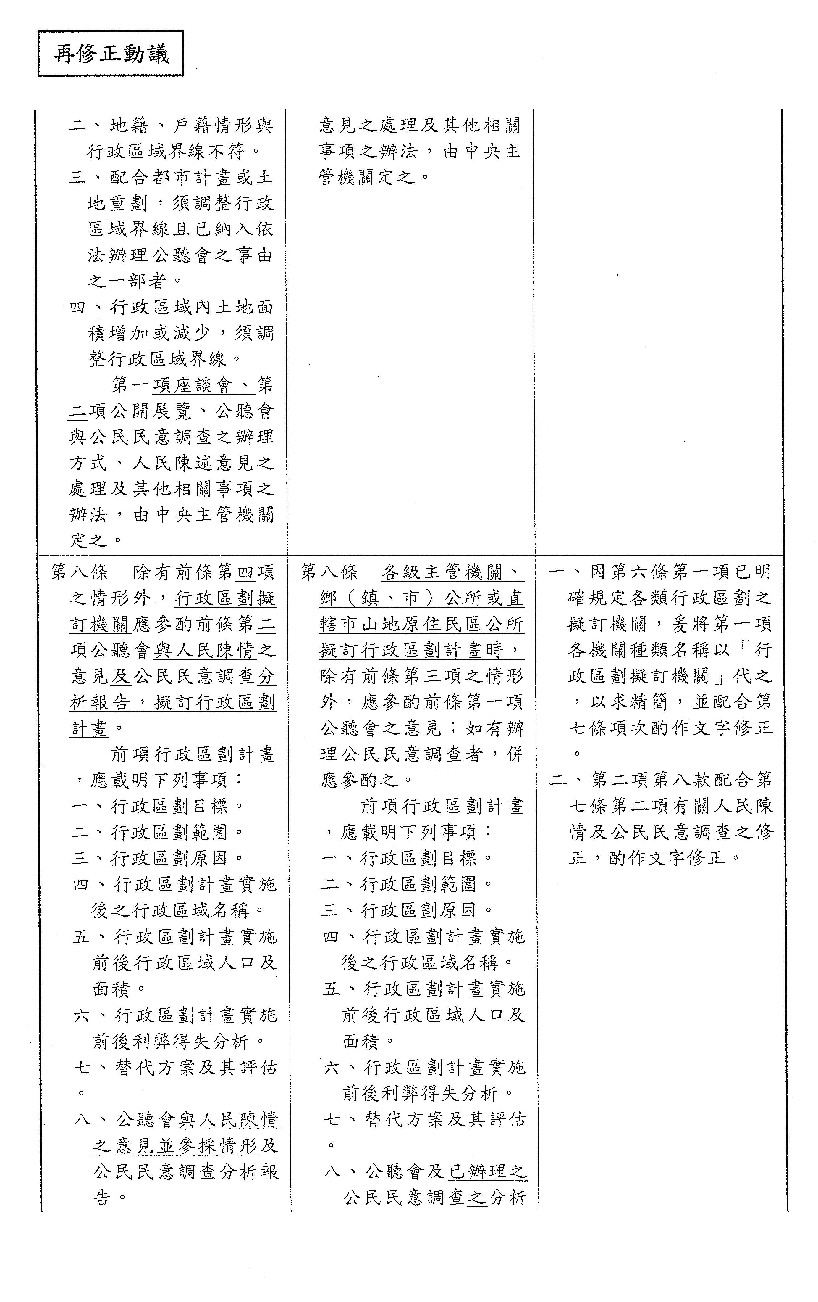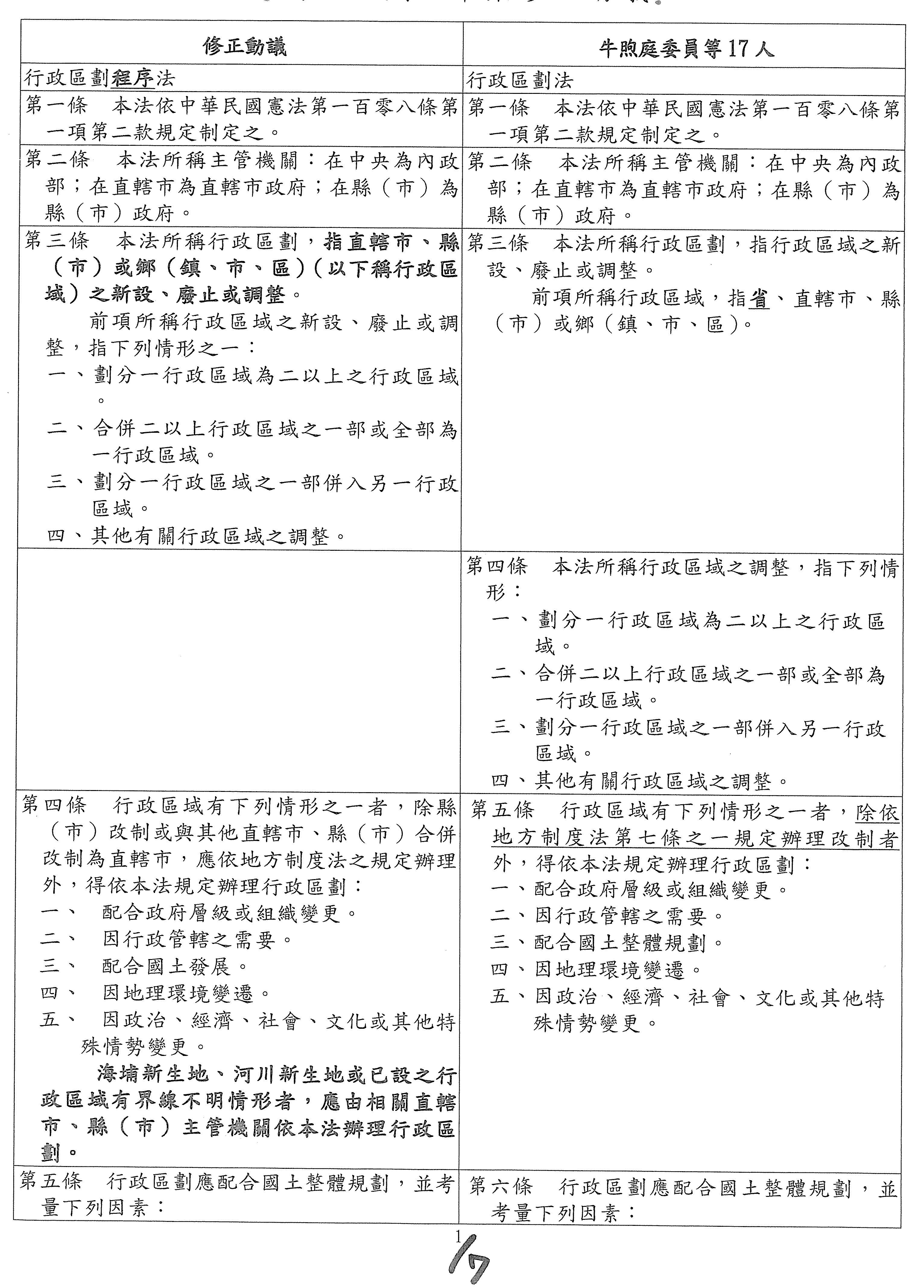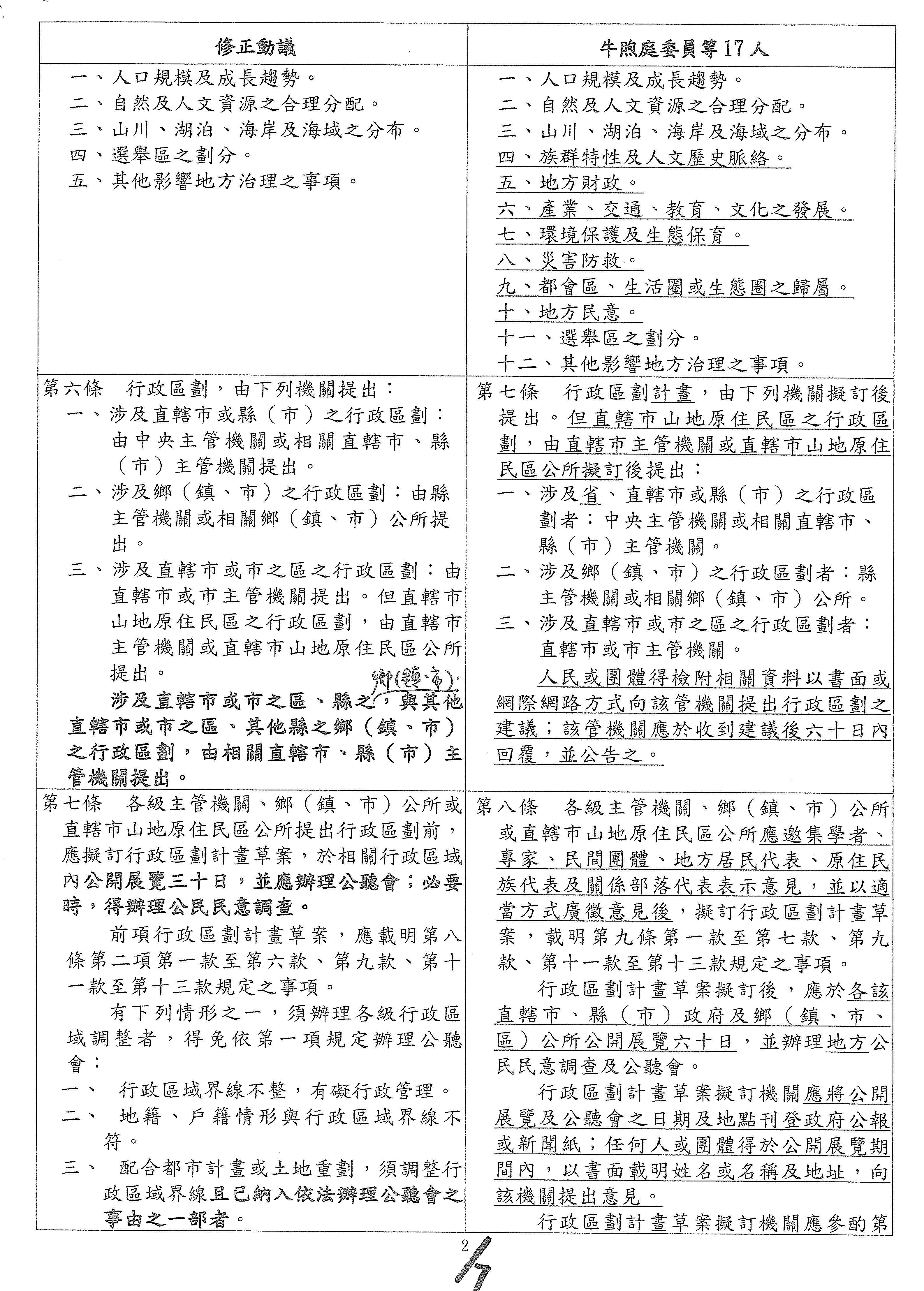主席:各位委員辛苦了,張宏陸委員的第五條修正動議及本席提案條文的第六條是有關於啟動行政區劃之前的考量因素,本席的提案是寫得比較多,修正動議的部分是比較少,上次的部分討論到一半,看看各位委員對於這個條文還有沒有什麼補充的意見?我們來進行討論。還有嗎?還是我先講?大家手上有條文對照表嗎?為了方便,剩下7個條文的對照表,大家應該有吧?