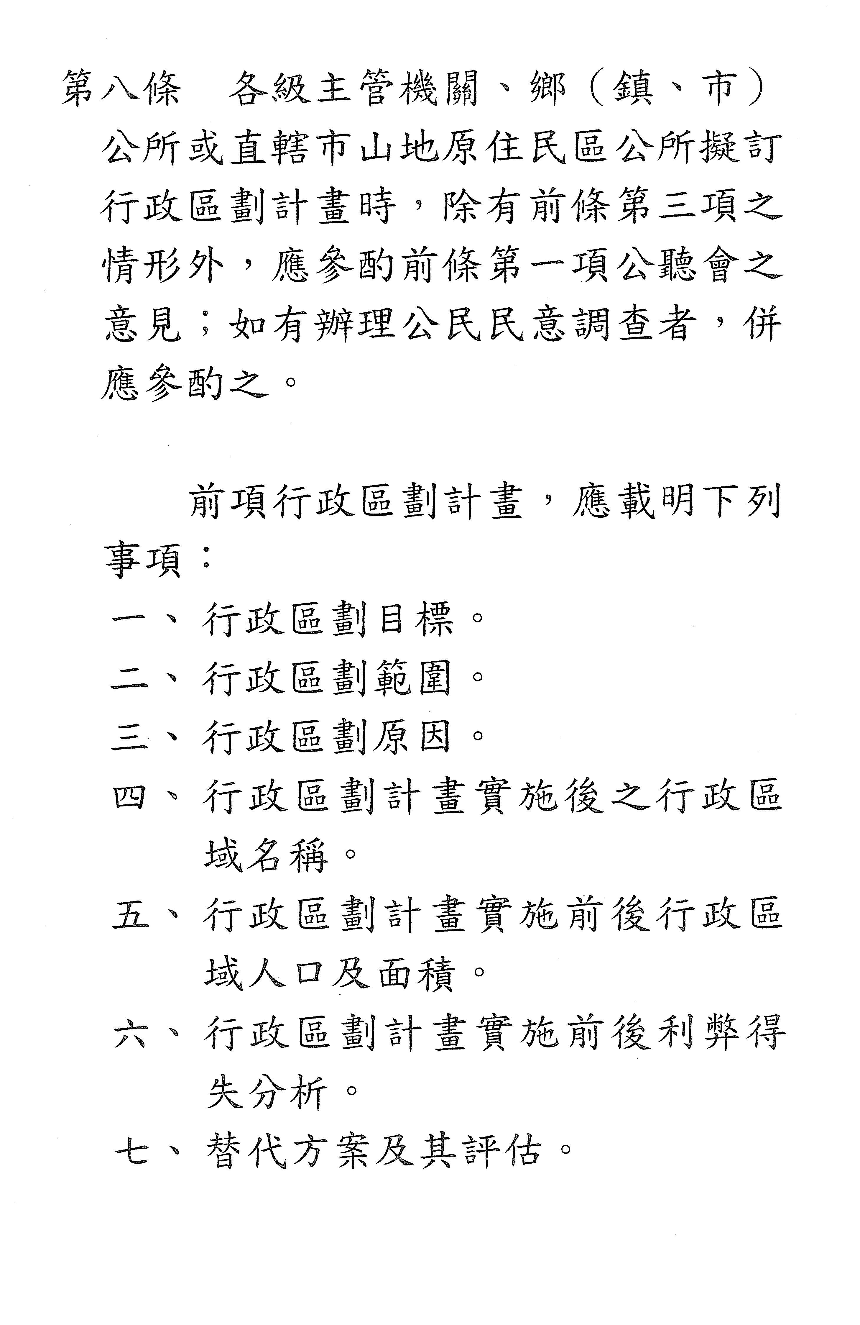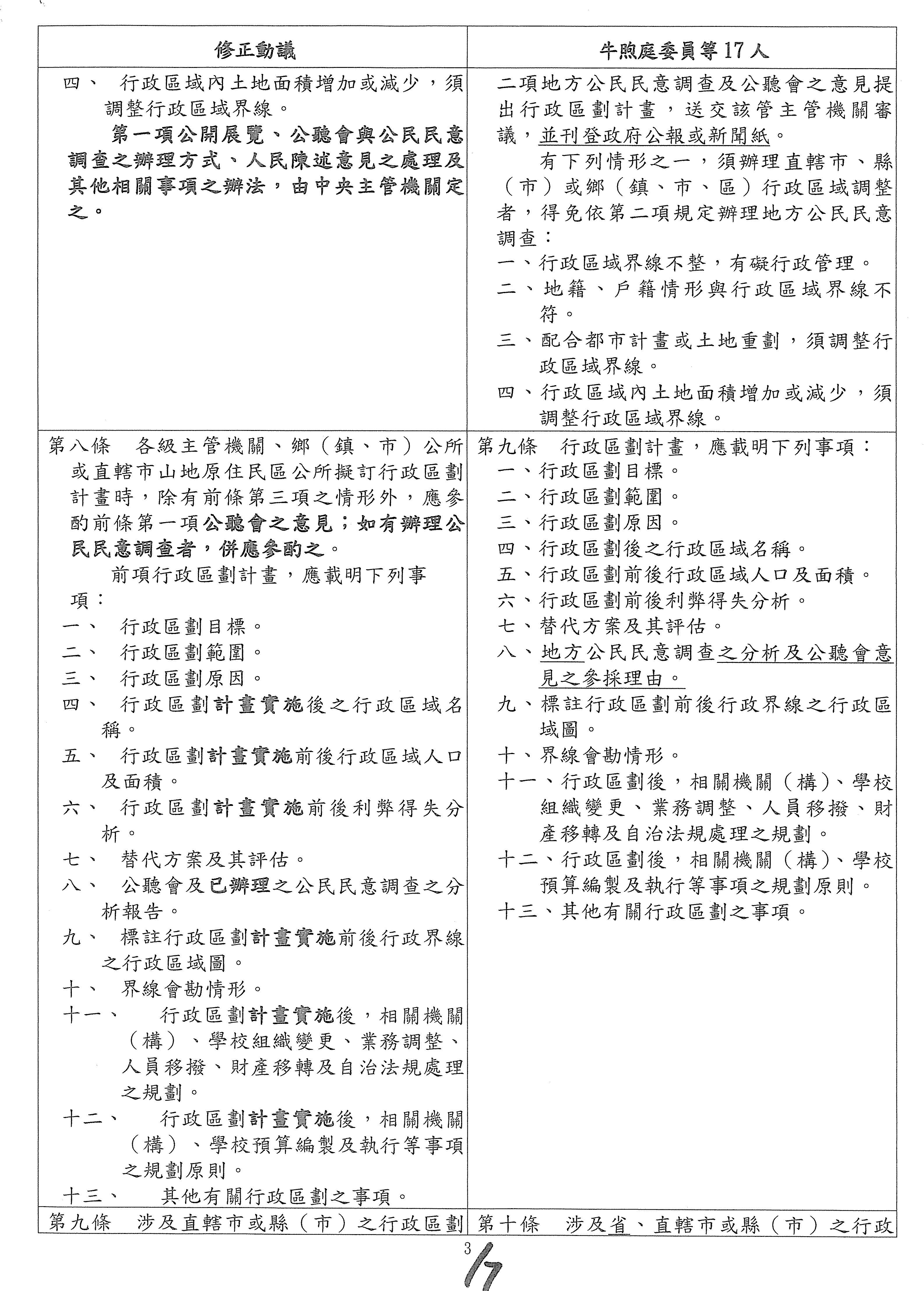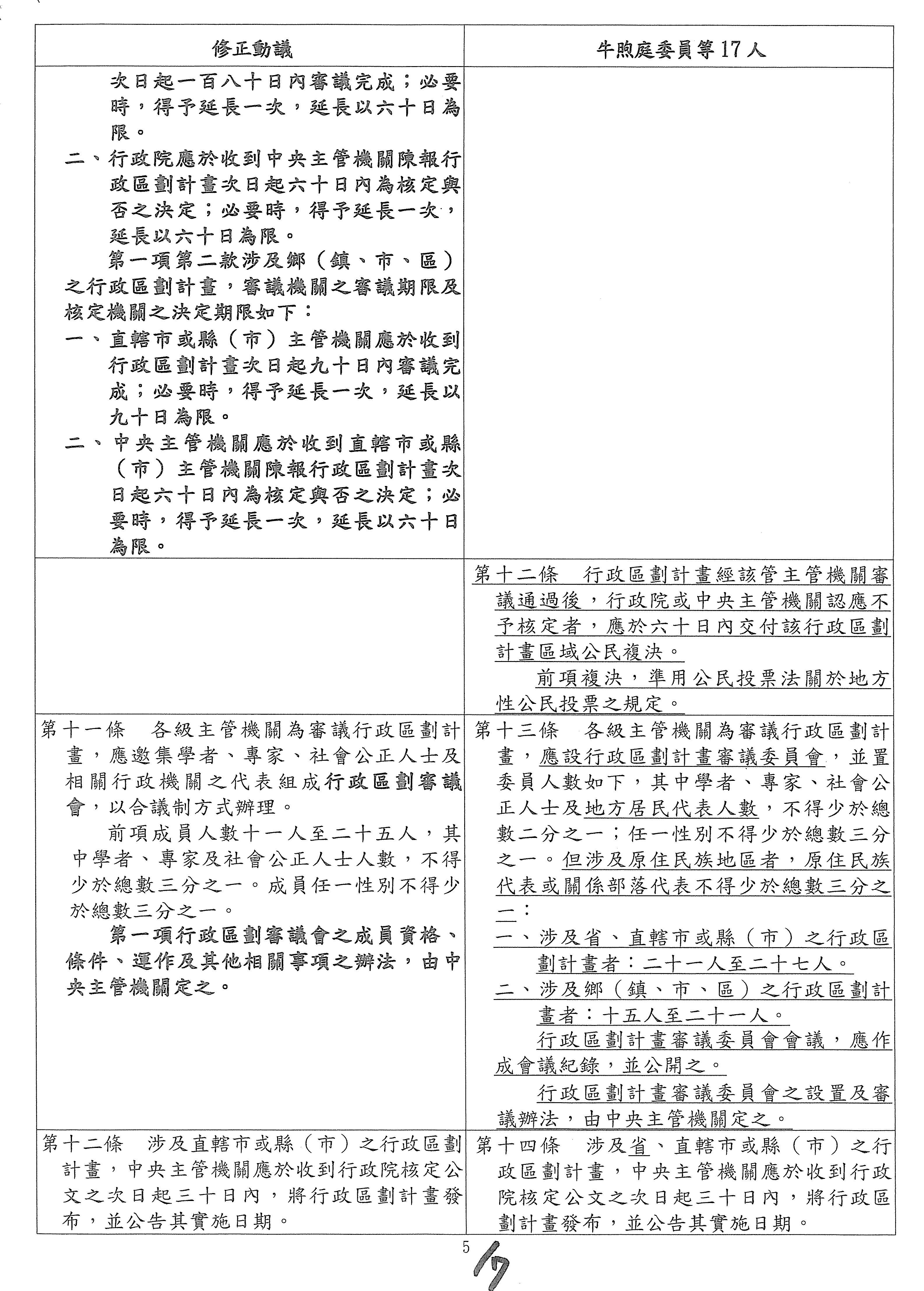 主席:各位委員辛苦了,張宏陸委員的第五條修正動議及本席提案條文的第六條是有關於啟動行政區劃之前的考量因素,本席的提案是寫得比較多,修正動議的部分是比較少,上次的部分討論到一半,看看各位委員對於這個條文還有沒有什麼補充的意見?我們來進行討論。還有嗎?還是我先講?大家手上有條文對照表嗎?為了方便,剩下7個條文的對照表,大家應該有吧?