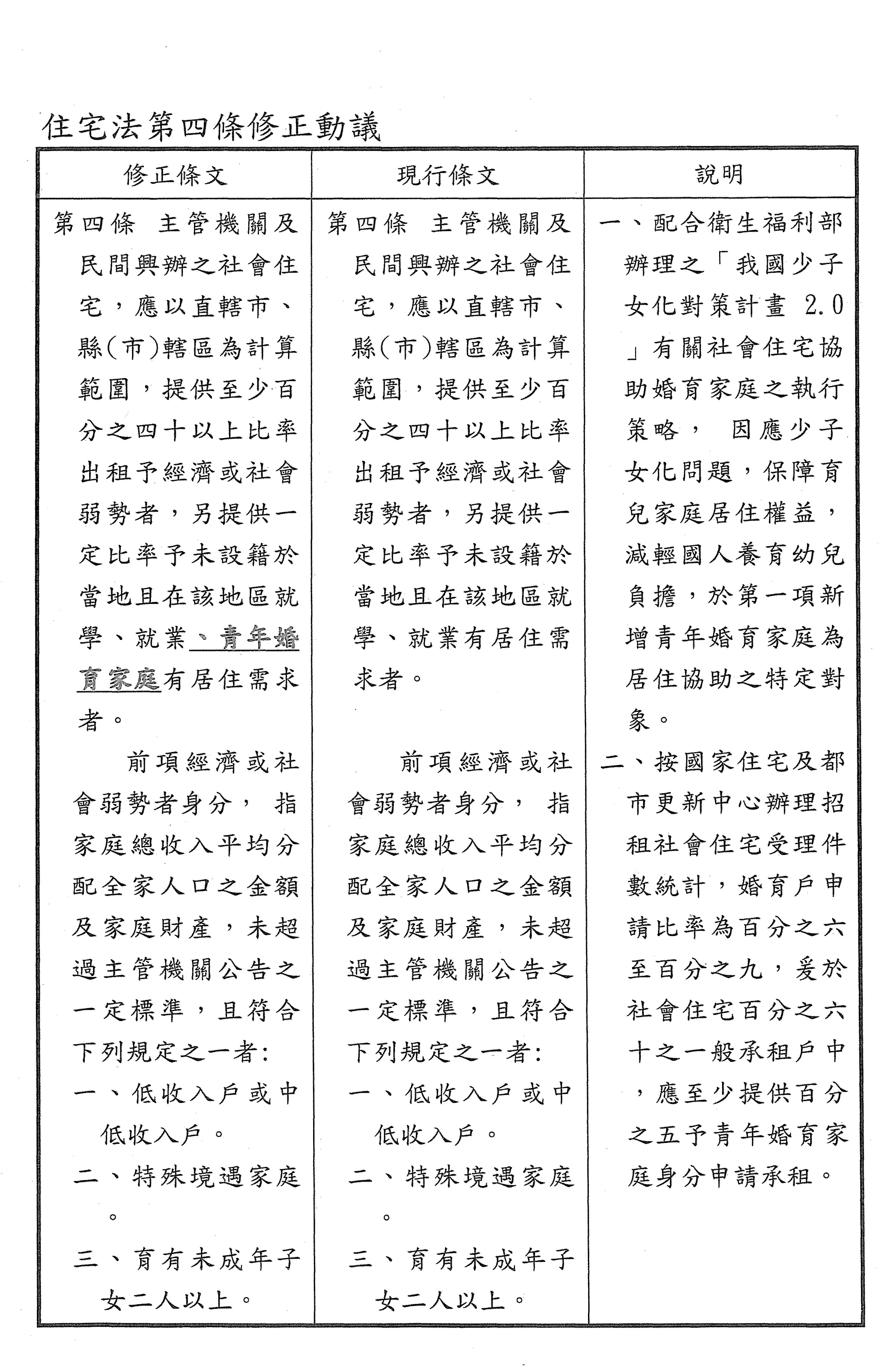 王委員美惠:謝謝主席,第四條本席也有提出修正案,不過我覺得其中有不足的地方,所以我今天又提出修正動議,增加青年婚育家庭,就是為了減輕國內要生小孩國民的負擔。我覺得應該在第一項加入這個規定,協助特定的對象,讓年輕人敢生小孩,減輕他們的負擔。這段時間我們都看到年輕人不敢生,或者想生但要住在一個比較好的地方,是不是我們政府可以幫忙協助?本席在修正動議中提出的意見是不是可以納入?