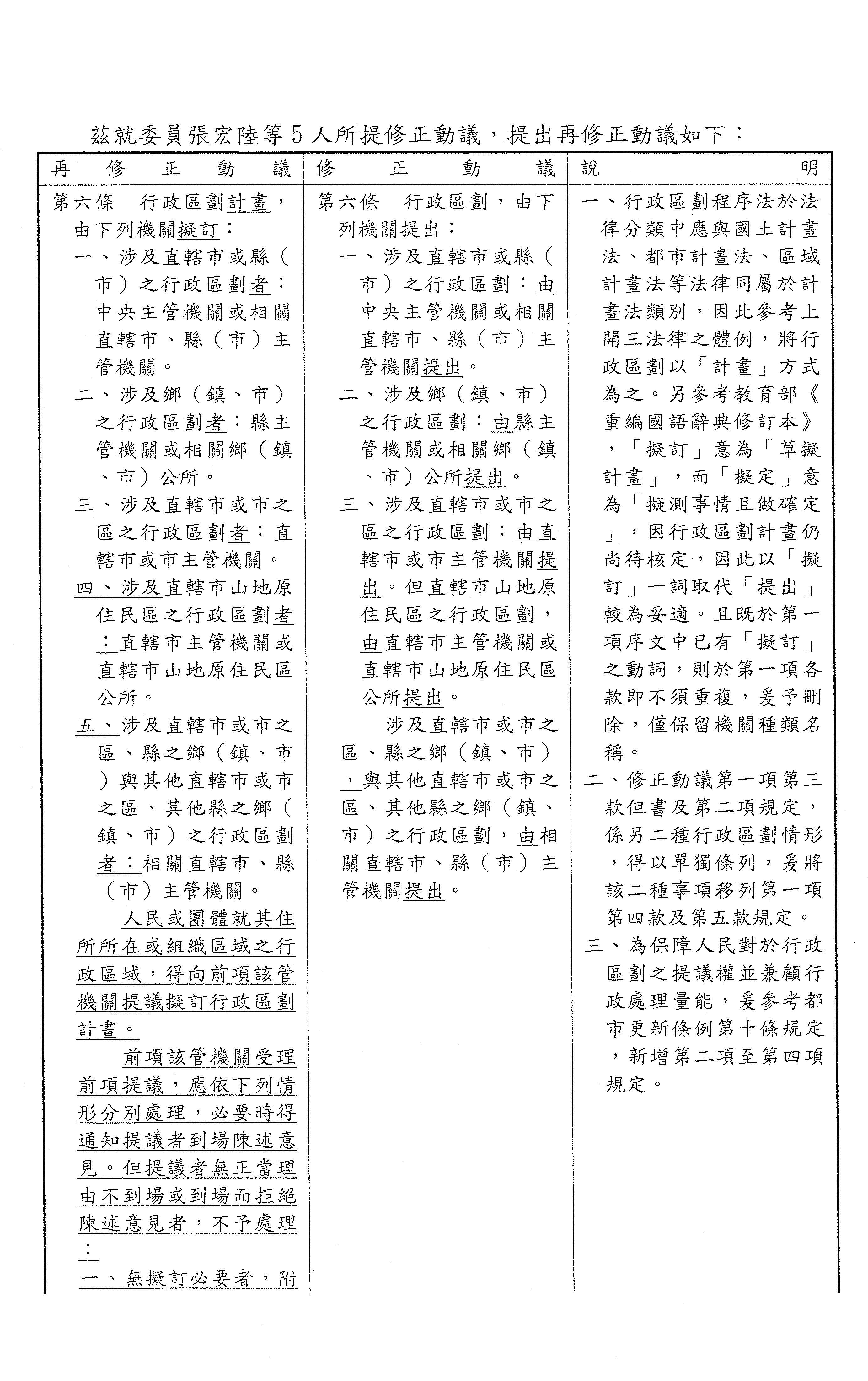 主席:第六條的部分,上一次討論的差異我跟大家報告一下,行政區劃的提出當然是由政府機關為主,這我想我們大家都已經有充分的共識,但本席的提案裡面其實是滿強調公民參與的部分,所以我希望人民有相關建議的權利部分可以列入法條,當然這個建議的回復跟准駁都還是在政府機關,避免因為個人的許願造成勞師動眾的情況,所以只有建議之權,但政府有審核跟回應的責任,我們有提再修正動議,希望大家稍作參考。其實前面的部分只是文字上跟法律用語上的調整而已,內容上是沒有差的,只是多一段「人民或團體就其住所所在或組織區域之行政區域,得向前項該管機關提議擬訂行政區劃計畫。」主管機關受理之後,依下列要件分別處理,可以邀請提議者到場陳述意見,但如果你不到場、不陳述意見、不把理由交代清楚,當然就不予處理。大家看一下文字的部分,也聽一聽大家的意見。先問官方意見好了,來,內政部。