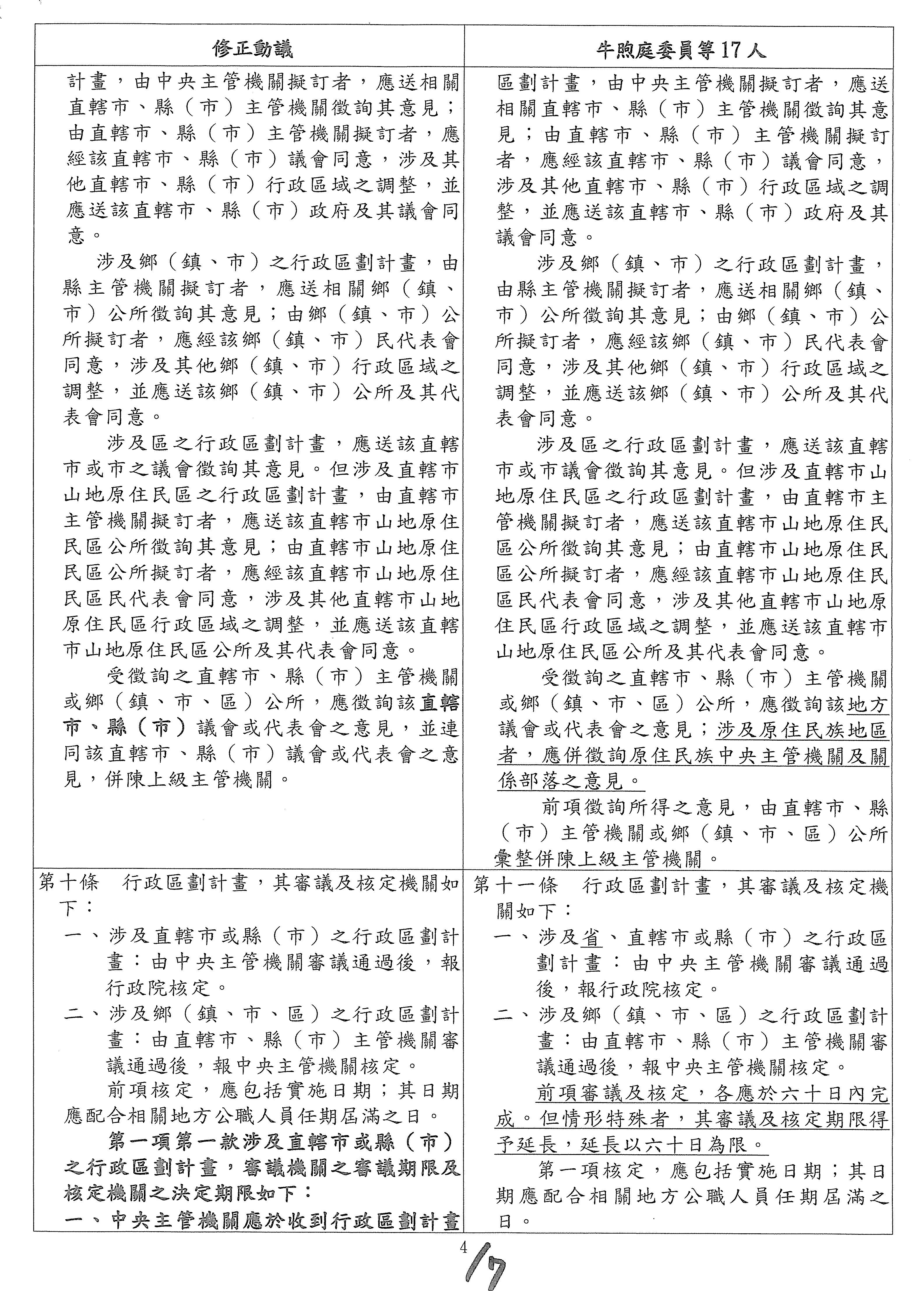 (一)繼續審查委員牛煦庭等17人擬具「行政區劃法草案」案。