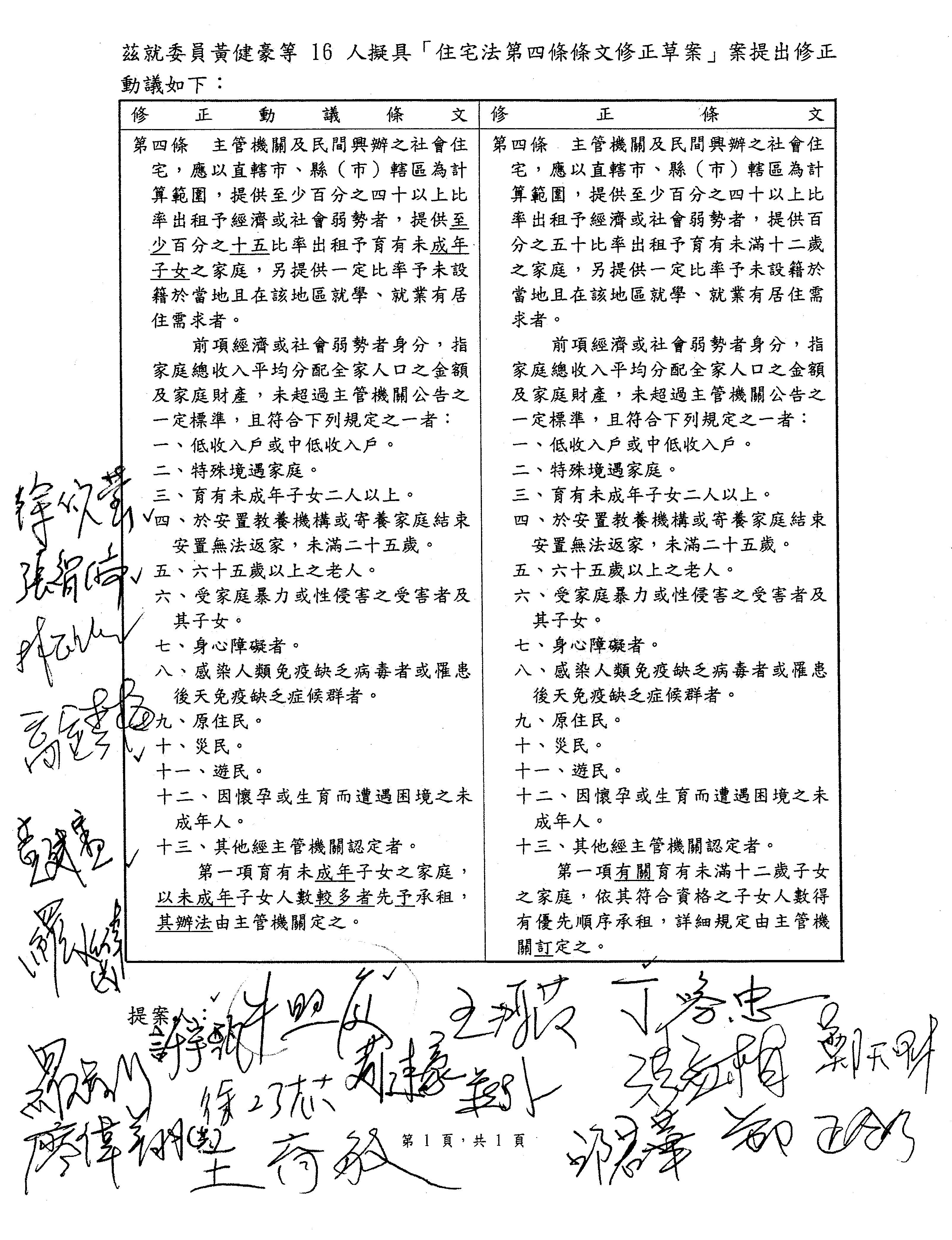 李委員柏毅:我跟各位委員說明一下,我的提案是增列第四條之一,原本是沒有第四條之一。第四條主要是在講社會住宅大概有百分之多少包含下面這些身分者可以入住,現行的版本是40%,那也有提出要50%,或者增訂哪一些身分的人可以入住社會住宅,但是我是想要幫地方政府來提出一個意見,因為都市在快速的成長,需要完整的安置配套,尤其是面臨區段徵收、市地重劃、都市更新等這些案例,通常還是會有一些漏掉的居民沒有辦法有居住正義,我舉我的選區為例,就是舊左宗、右昌宿舍還有崇實新村為例,附近相關的社會住宅已經開始建造,有一定基礎的數量,但是還是有相關的居民沒有辦法入住他原本居住的這個環境,所以我針對住宅遭徵收或拆除,而且因應政策變遷,導致原定的補償跟安置方案無法落實的住戶,主管機關應提供社會住宅予以安置,且不受住宅法第四條第二項家庭總收入的限制。這個提案的目的主要是這個地方都市更新了,樣貌雖然變了,但是原本居住的人還可以住在那裡,它是一個活文化,它也是一個情感;另外,我還是要增訂,為了防止不當利益交換,核定入住者的資格不得轉讓、繼承,以確保公共資源可以最大化,以上我的提案說明給各位參考,謝謝。