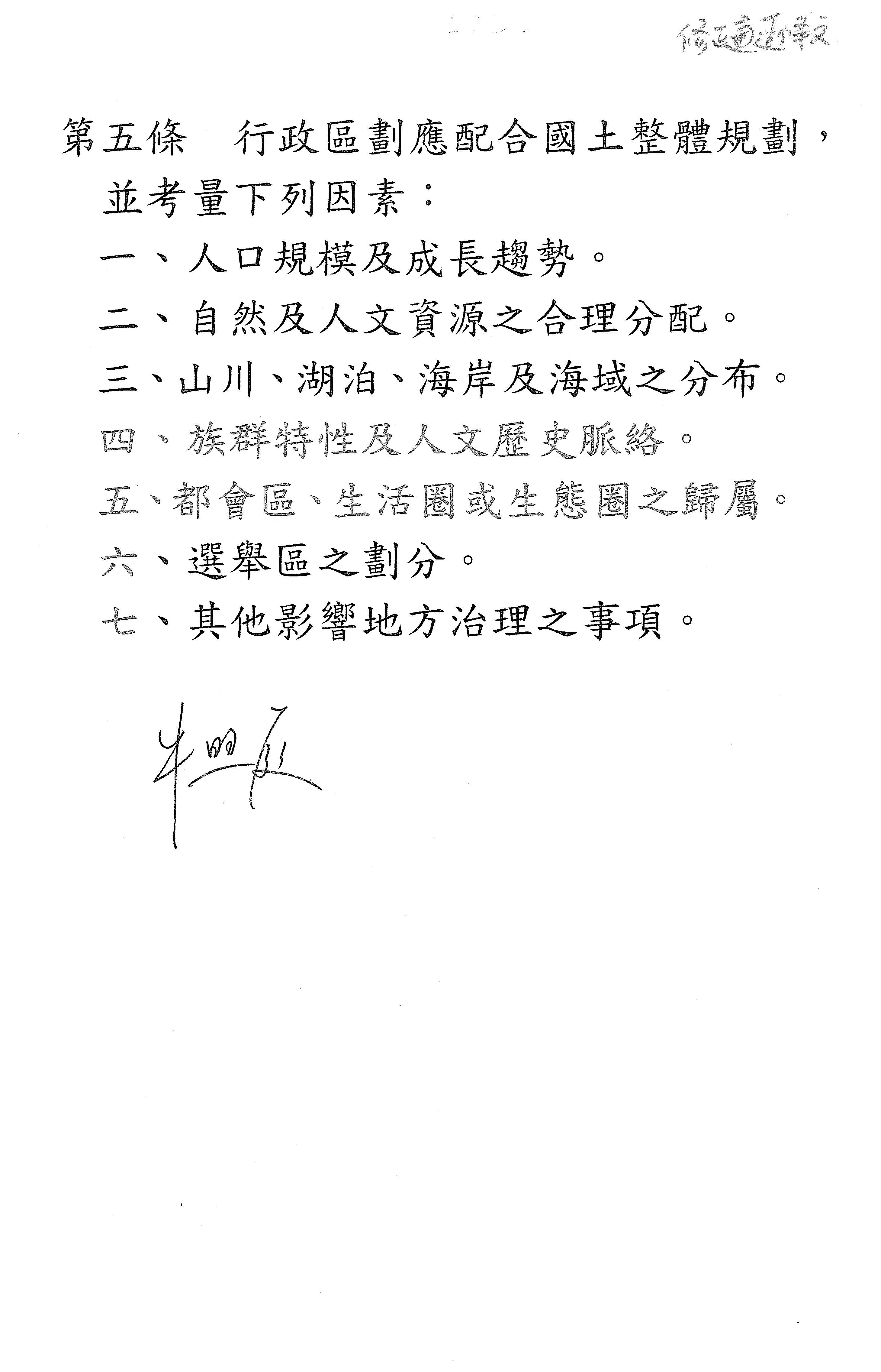 主席:我們把修正動議再做討論,變委員會修正版本,我唸一下:「行政區劃應配合國土整體規劃,並考量下列因素:一、人口規模及成長趨勢。二、自然及人文資源之合理分配。三、山川、湖泊、海岸及海域之分布。四、族群特性及人文歷史脈絡。五、都會區、生活圈或生態圈之歸屬。」四是「族群特性及人文歷史脈絡」,五是「都會區、生活圈或生態圈之歸屬」,六是「選舉區之劃分」,七是「其他影響地方治理之事項」,這樣好不好?這樣應該比較平衡一點,這樣調整一下,內政部應該OK?好,謝謝吳堂安次長。大家再看一下,四是「族群特性及人文歷史脈絡」,五不是「地方財政」,是「都會區、生活圈或生態圈之歸屬」,六是「選舉區之劃分」。好,就這樣。因為這個大概是比較積極的要件,所以我們抓比較重要的,就是做行政區劃之前一定要考量的一些事項,其他比較細項的我們就併在其他條款裡面。好,那我們就印出來,就照委員會審查通過,可以嗎?