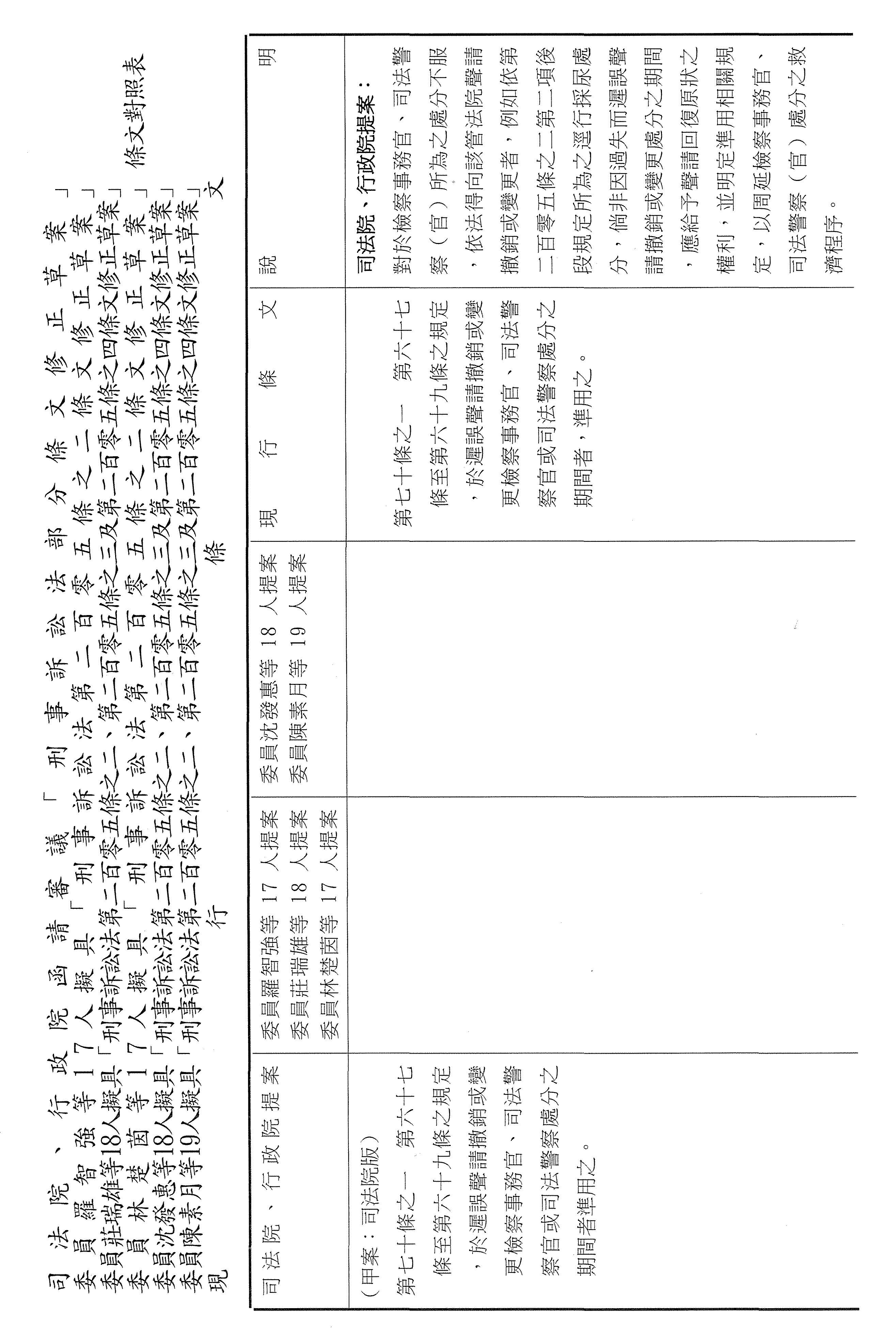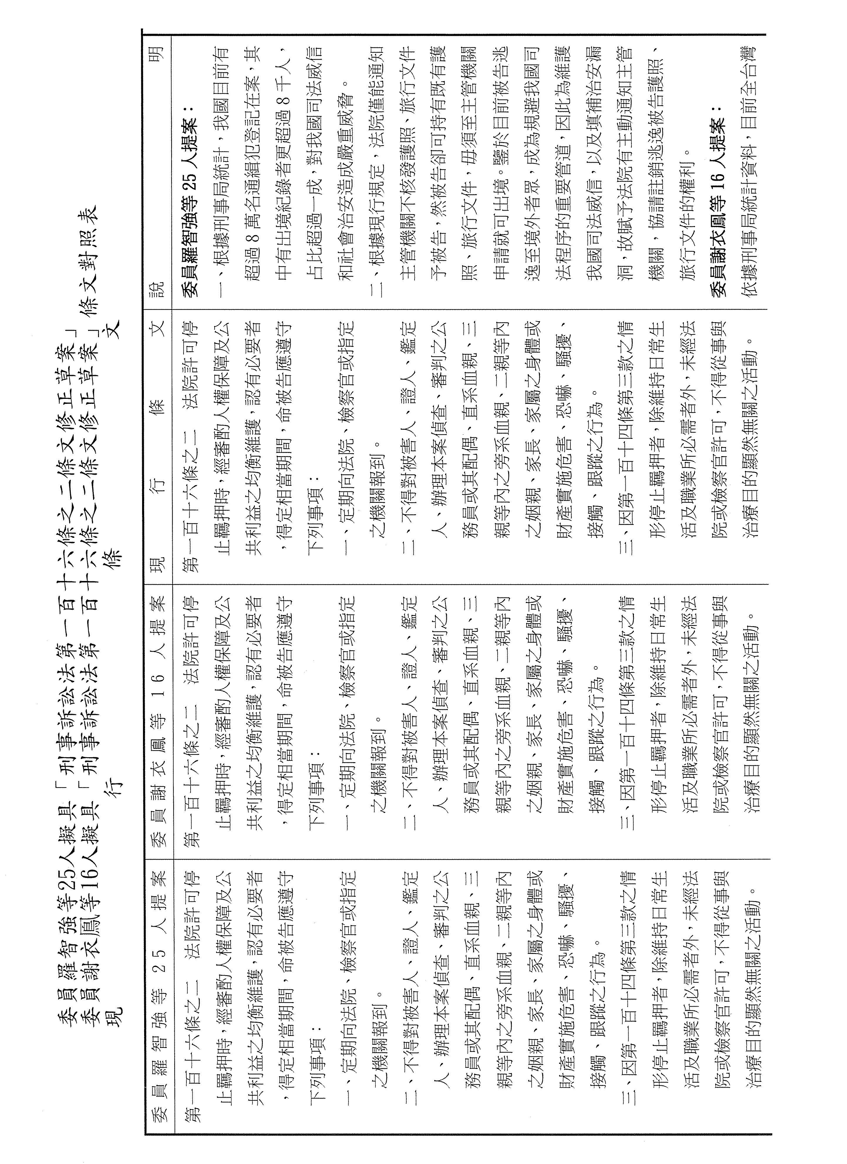一、繼續併案審查(一)委員羅智強等25人、(二)委員謝衣鳯等16人分別擬具「刑事訴訟法第一百十六條之二條文修正草案」案。