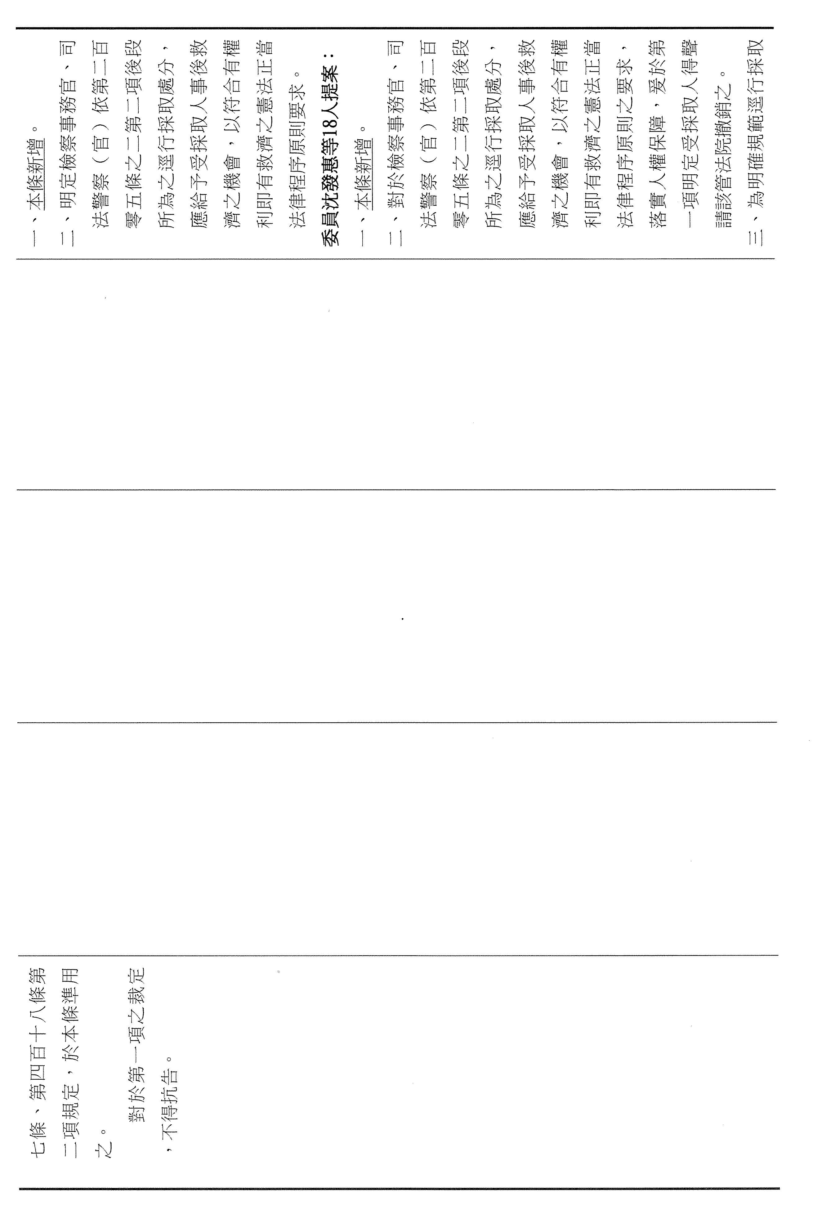 現在進行討論事項第二案,繼續併案審查司法院、行政院函請審議「刑事訴訟法部分條文修正草案」等6案,請問各位要不要進行大體討論?不用?那我們就直接進入逐條審查。