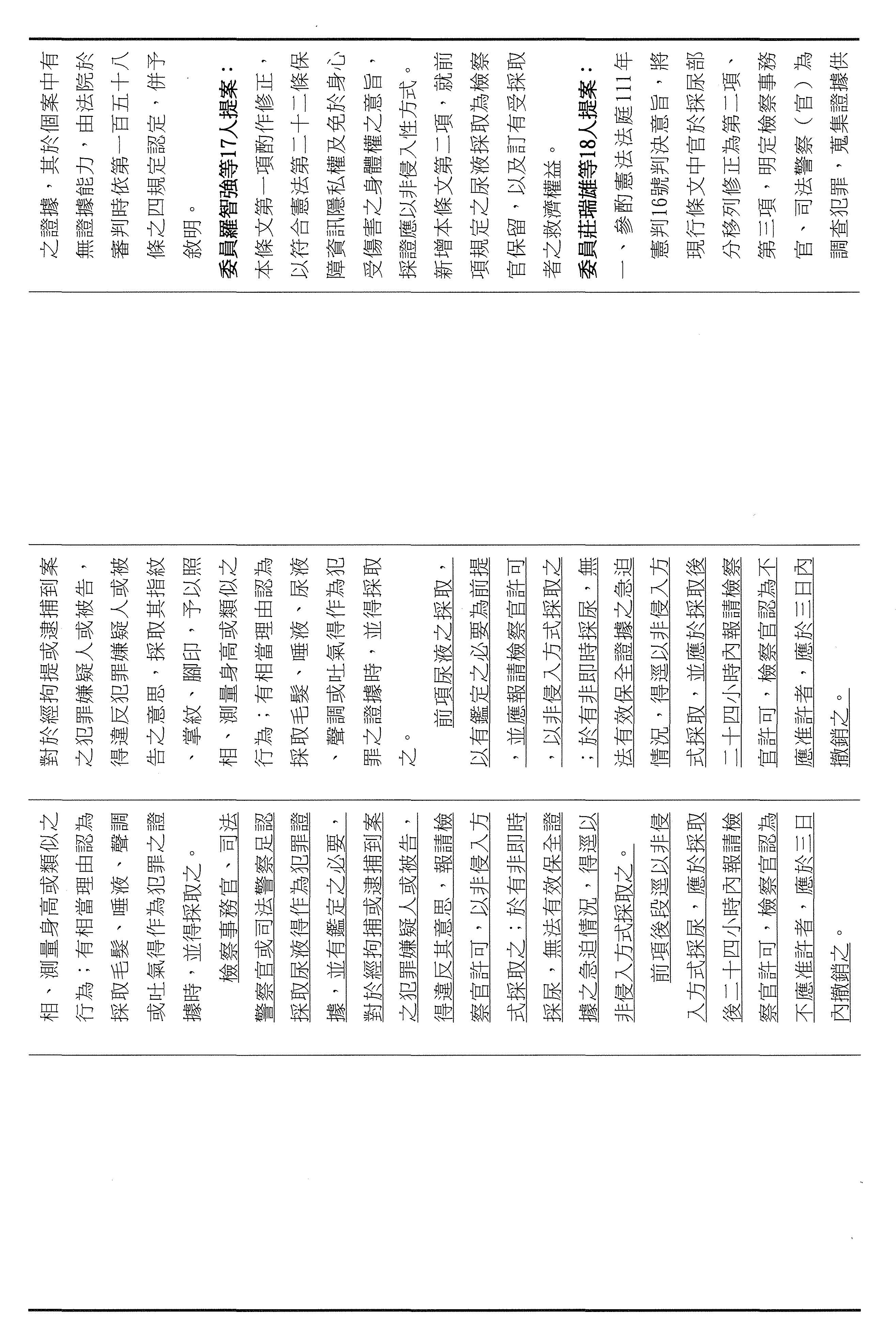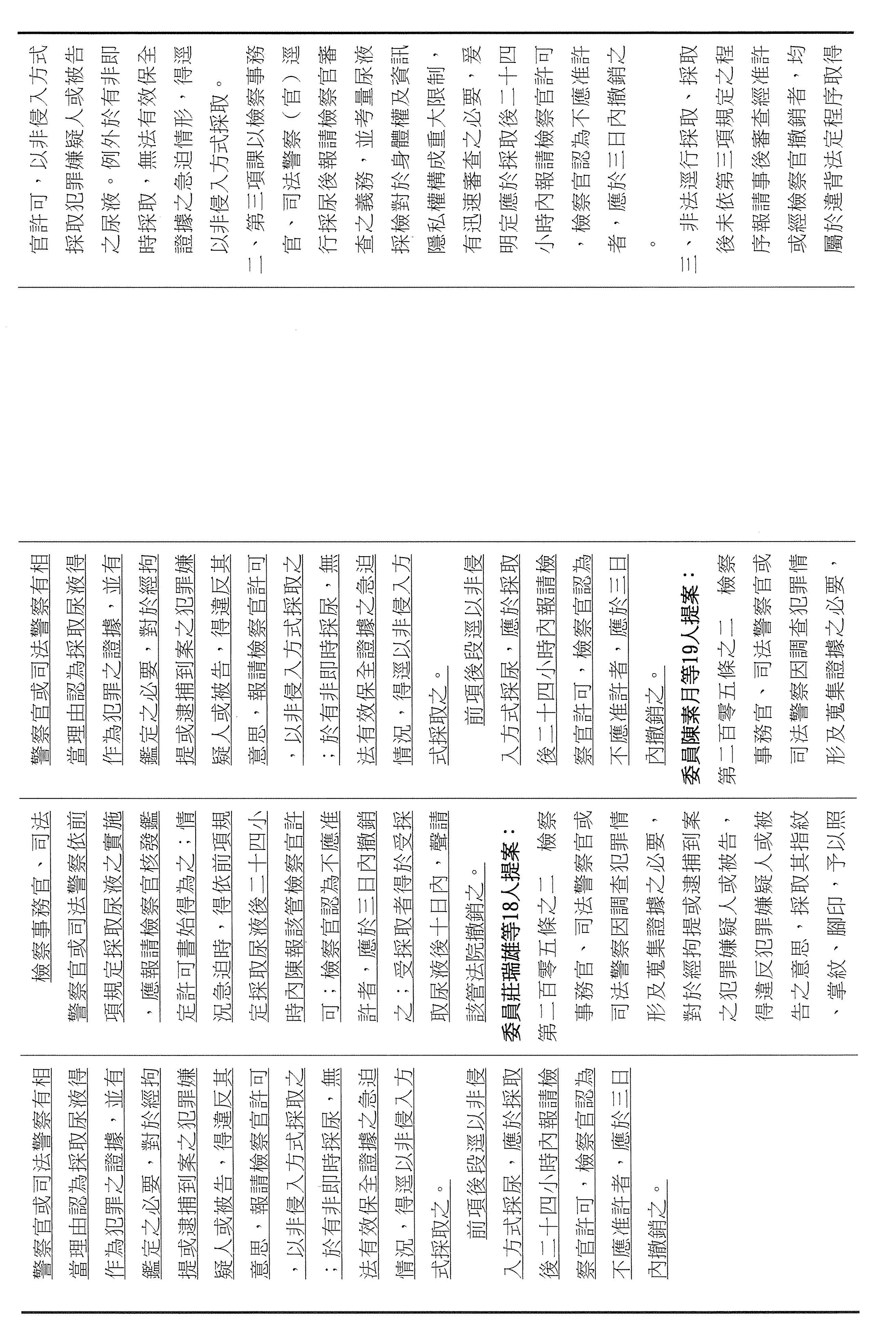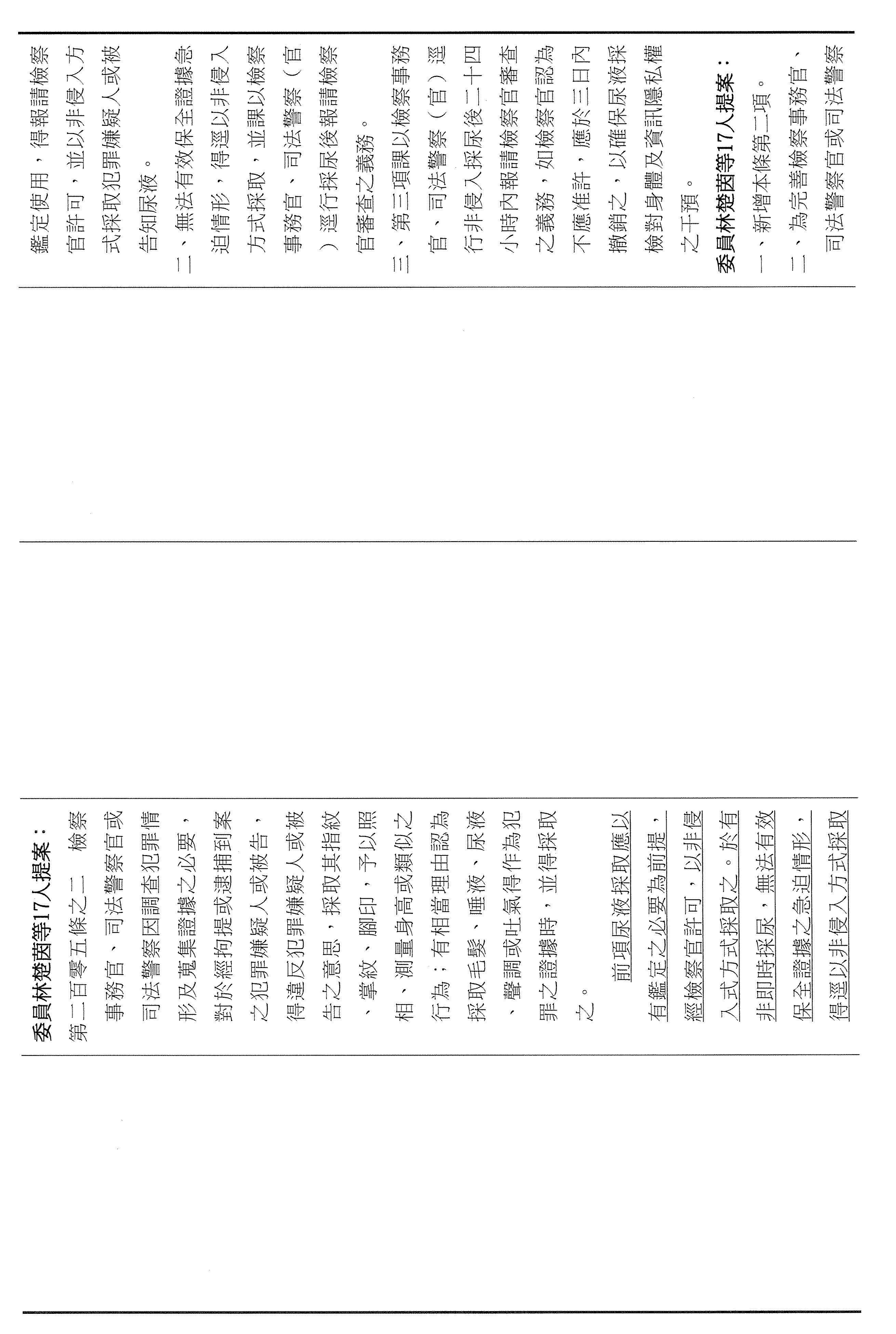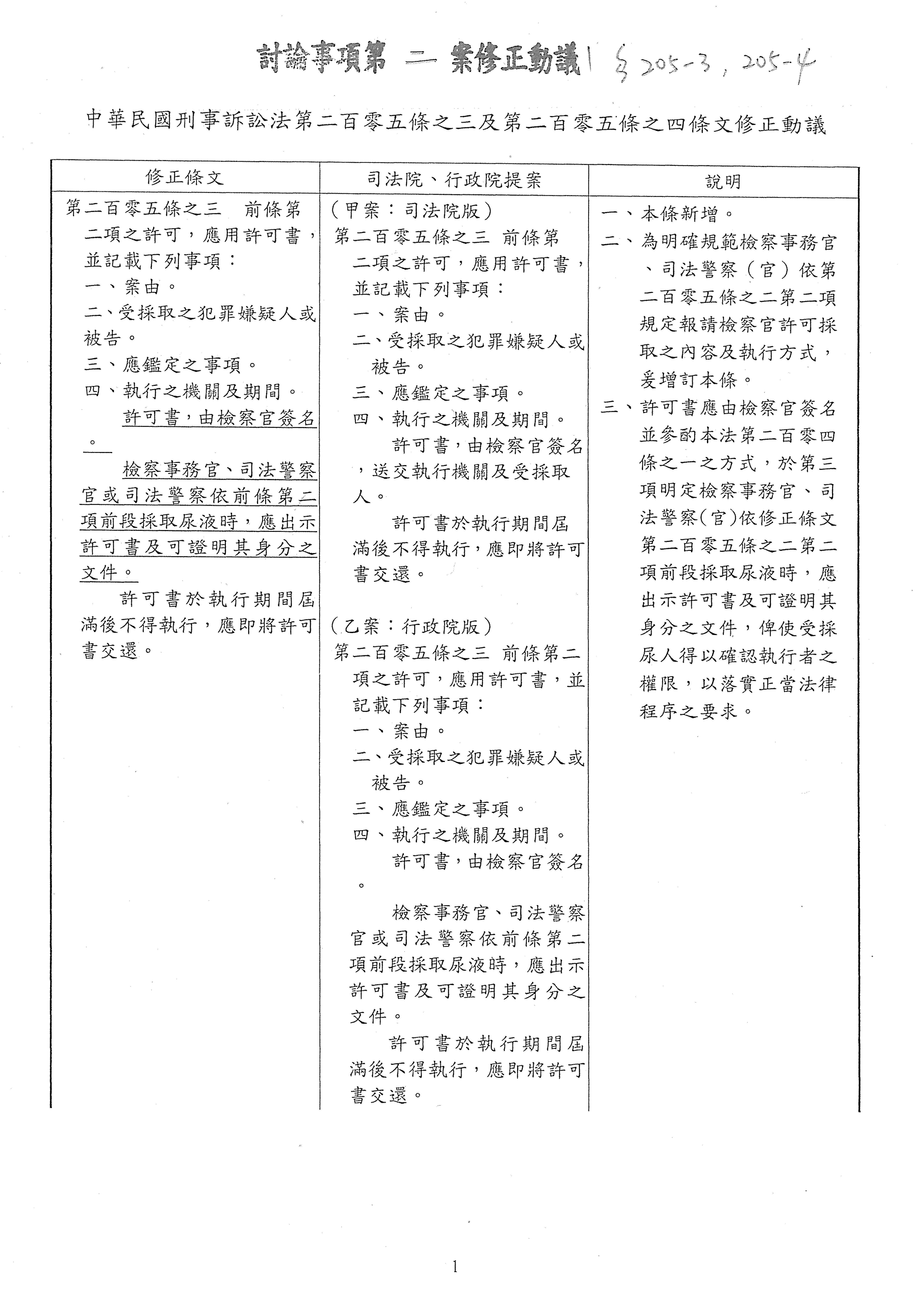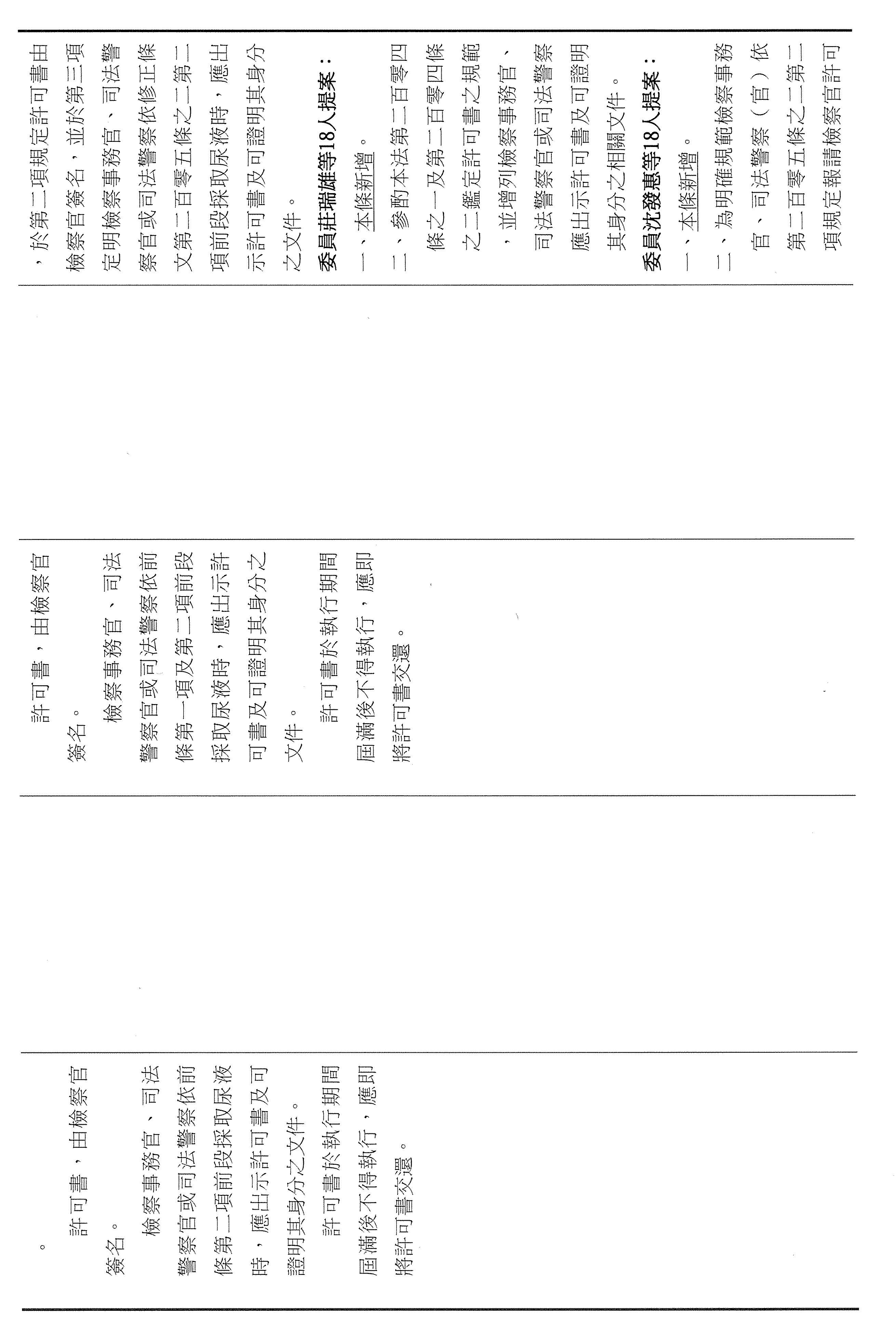 第三個,許可書送達的目的其實主要是在於起算救濟時間,我想何時起算救濟時間才是一個最重點,但是從我的修訂版本來看,警察出示證件告知要採尿的時候就可以起算了,所以我的版本反而更有利於當事人,能夠更保障訴訟時候的救濟權,因為我的起算時間點更早,比所謂的送達許可書更早,而且這個出示動作都是有時間點,譬如筆錄的記載、搜索時的錄影都可以看到到底什麼時候起算,所以我想在實務上面這個絕對就已經足夠了,而且對於當事人更保障。至於第二百零五條之四,我是參考行政院版本,我改了一個「及」字,這大概可以從修正動議上看到,讓可否抗告、救濟加以明確化,避免實務上適用的混淆,以上是我修正動議的說明。