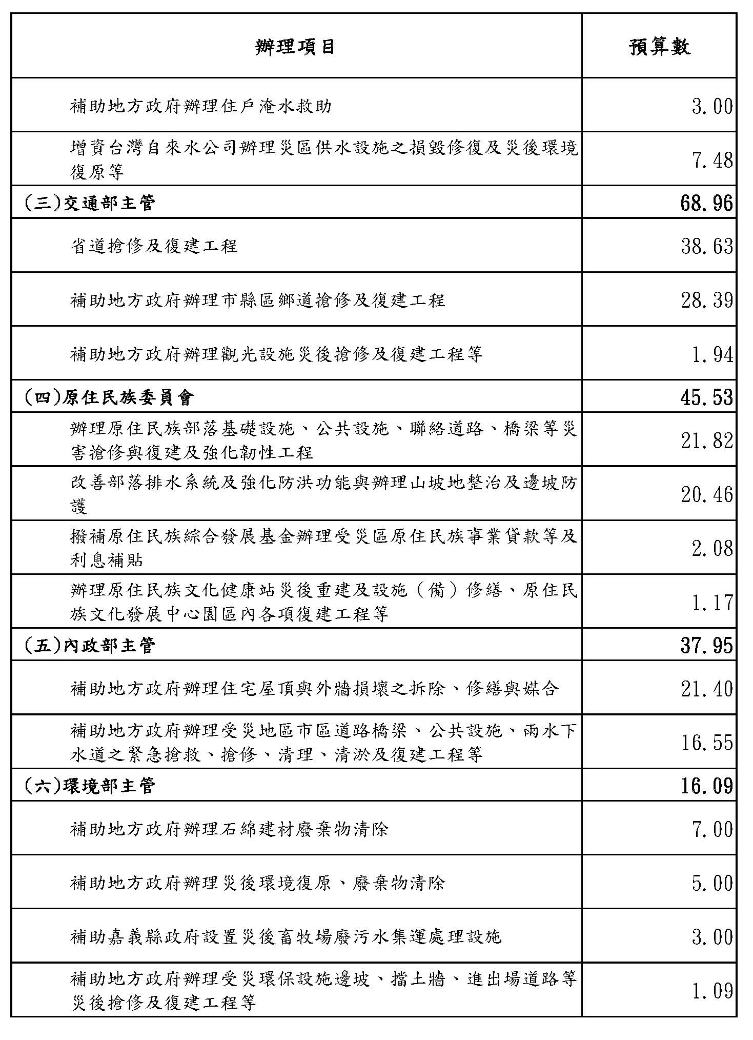 1.農業部主管編列203億元,主要係撥補農業天然災害救助基金辦理農業損失現金救助及低利貸款利息補貼;補助地方政府辦理上下邊坡穩定、排水改善與道路安全等農水路公共設施災後搶修及復建工程等。