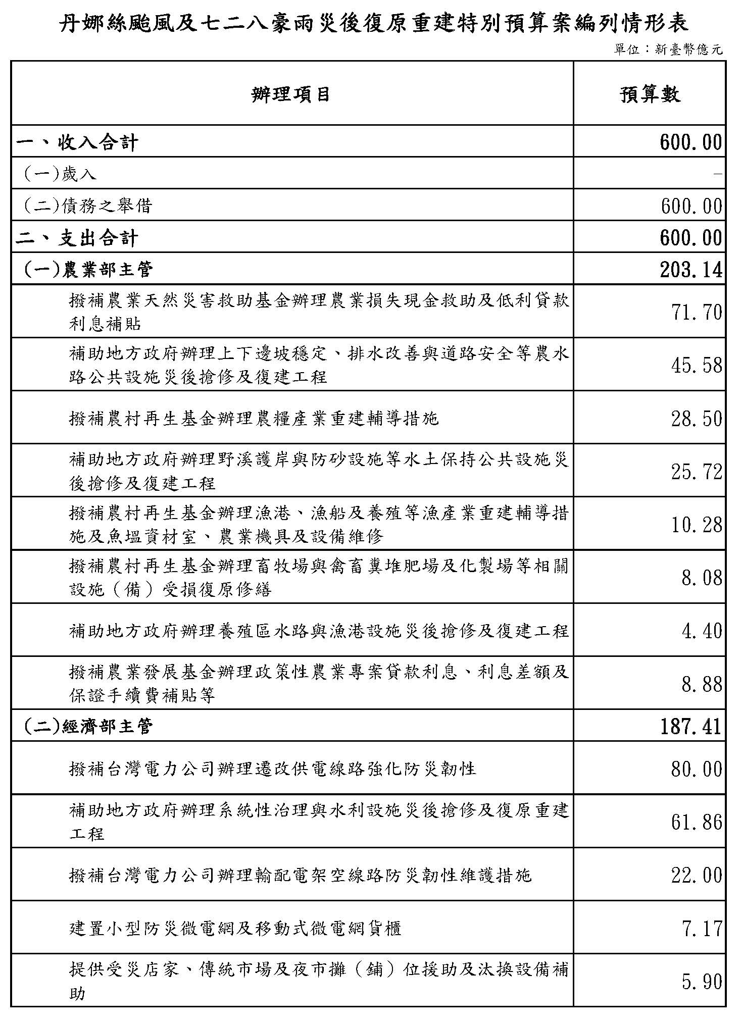 本院依特別條例規定,編製完成本特別預算案,歲出共編列600億元,期程自今年8月19日至116年12月31日止。114至116年度分別編列191億元、316億元及93億元,包括農業部編列203億元、經濟部編列187億元、交通部編列69億元、原住民族委員會編列46億元、內政部編列38億元、環境部編列16億元、教育部編列4億元、文化部編列3億元、國家通訊傳播委員會編列3億元、行政院公共工程委員會編列1億元,另編列預備金30億元;所需財源全數以舉借債務支應。