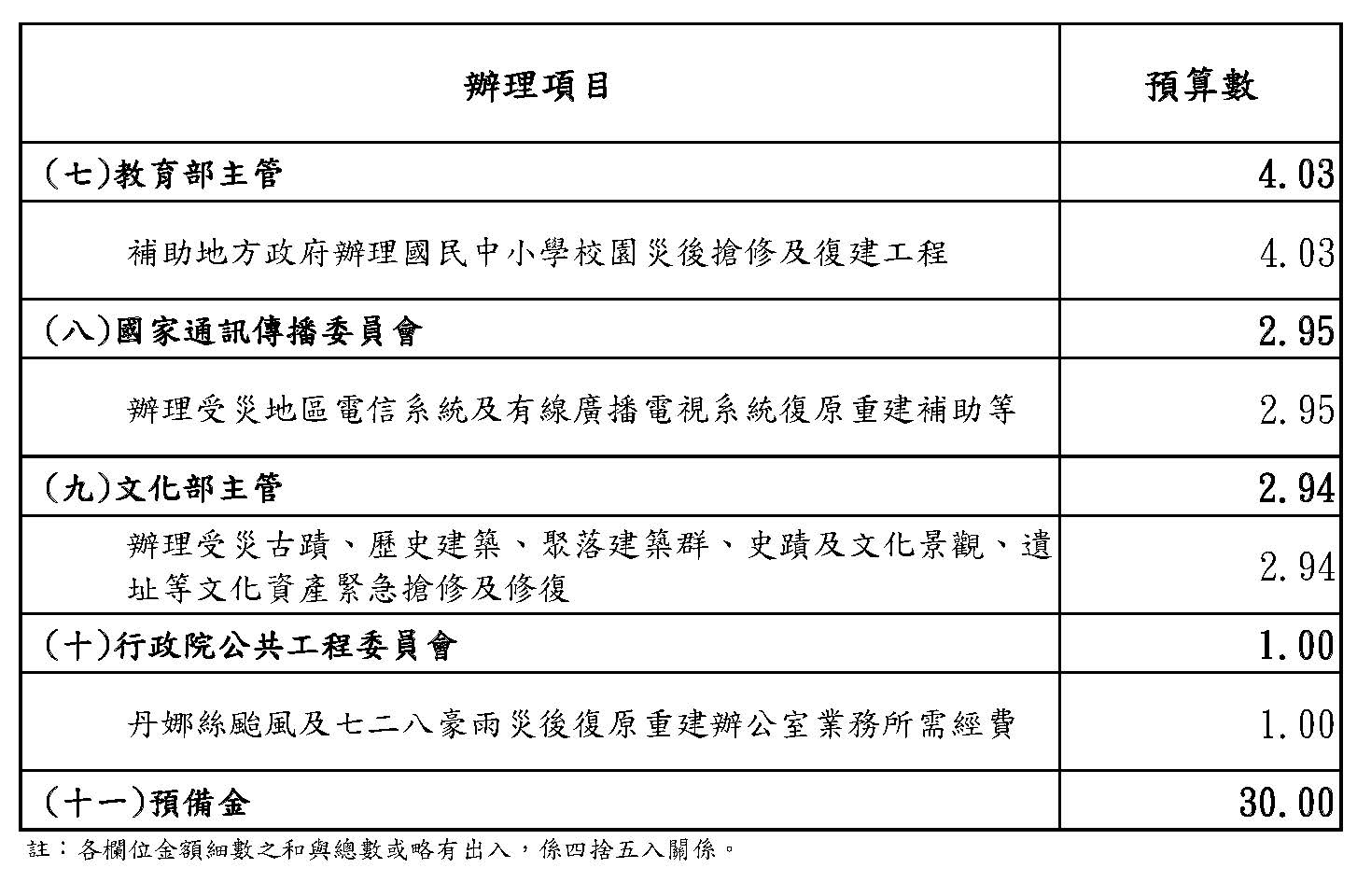 7.教育部主管編列4億元,主要係補助地方政府辦理國民中小學校園災後搶修及復建工程。