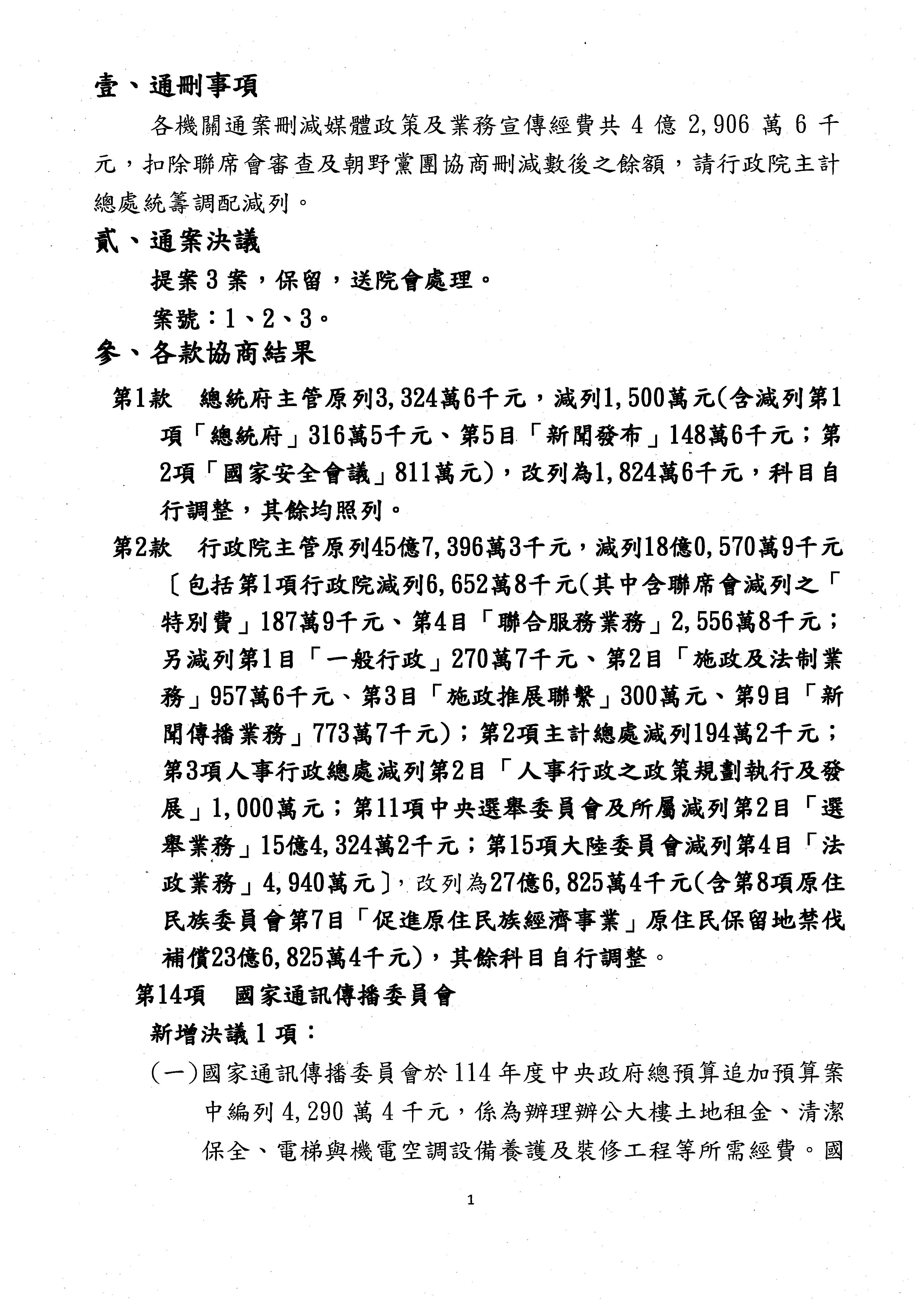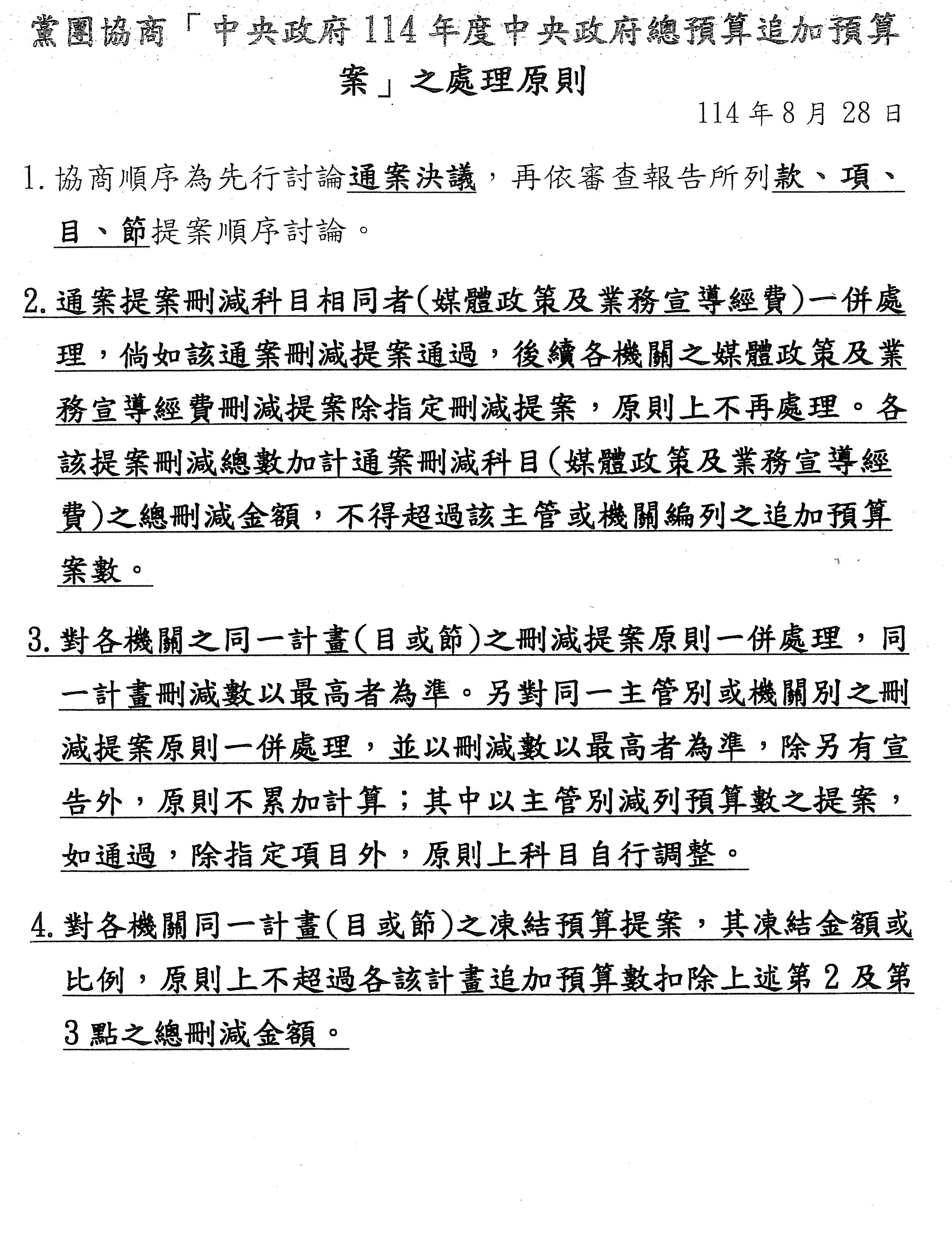 2.通案提案刪減科目相同者(媒體政策及業務宣導經費)一併處理,倘如該通案刪減提案通過,後續各機關之媒體政策及業務宣導經費刪減提案除指定刪減提案,原則上不再處理。各該提案刪減總數加計通案刪減科目(媒體政策及業務宣導經費)之總刪減金額,不得超過該主管或機關編列之追加預算案數。