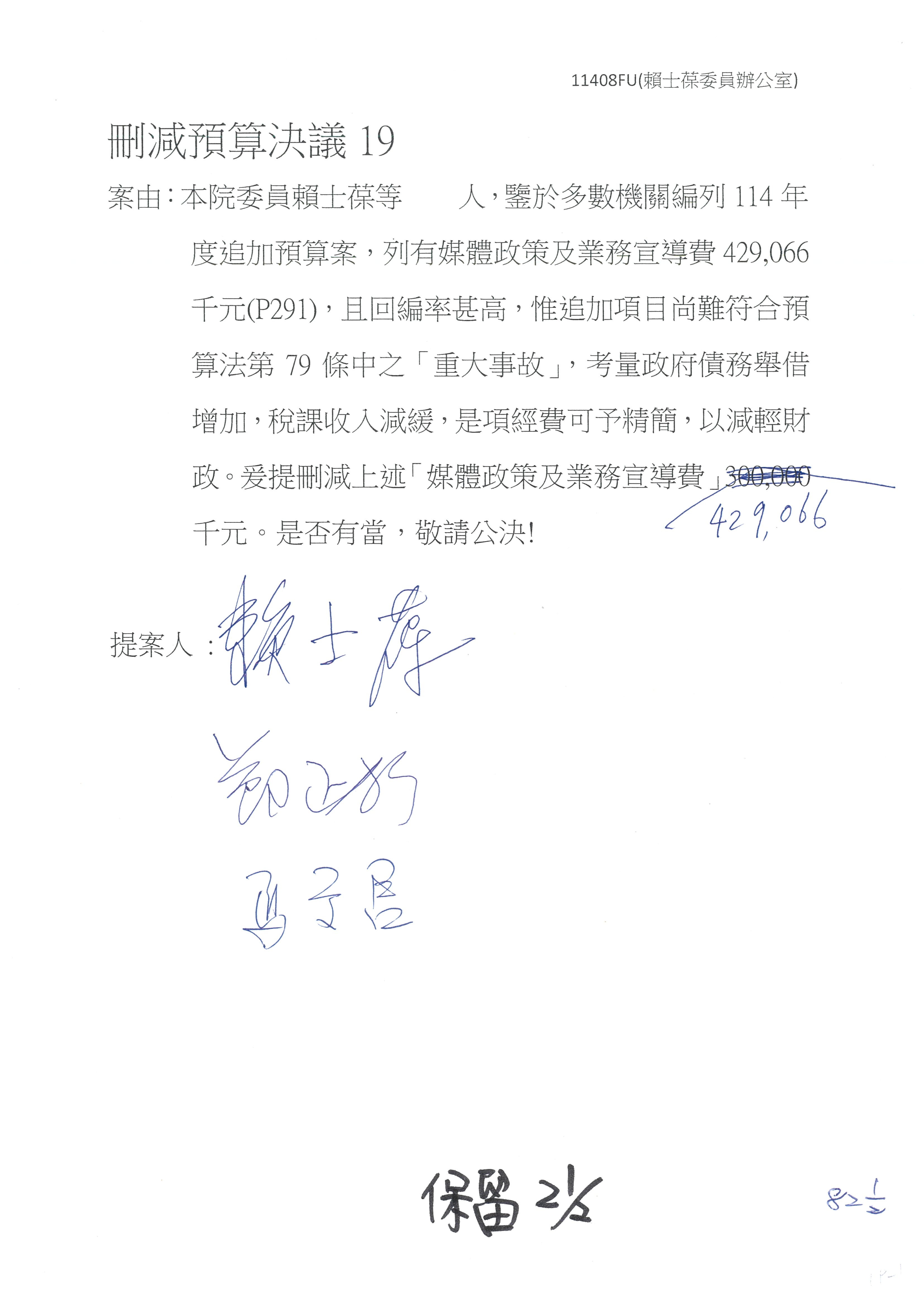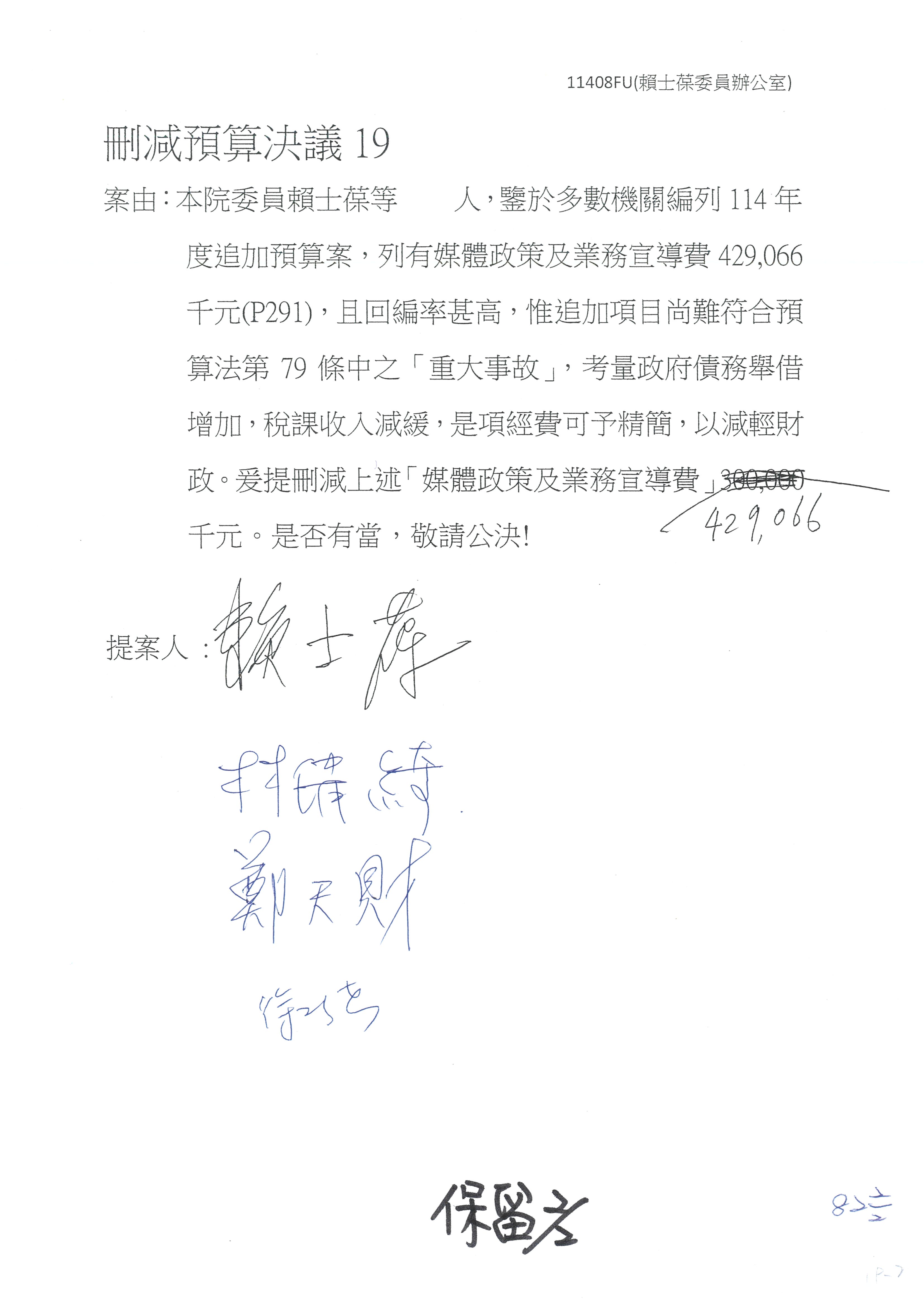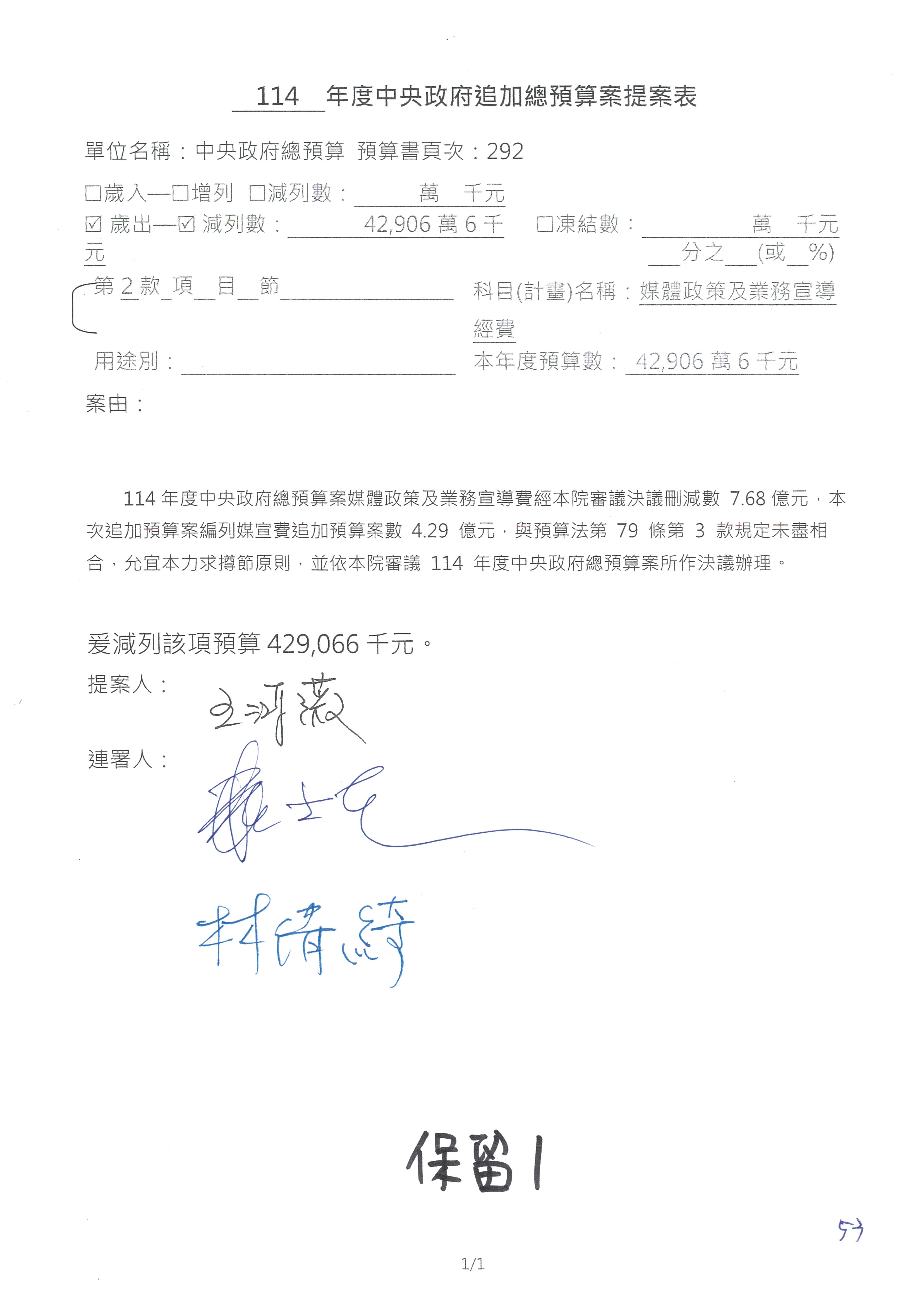 我們等一下要表決兩個案子,第一個案子就是媒體的廣宣費用,他要追加4.29億,你可以看得到,他現在已經有七點……原來就已經有好多錢在用,現在又要增加4.29億,這4.29億在三個月的時間裡面,其實花錢都很辛苦啦,所以一方面他用這個錢來打在野黨,另一方面用這個錢來洗腦人民,是一個洗腦的動作,所以等於用人民的錢洗人民的腦,這個錢就用在這個地方,所以4.29億我們主張全部刪掉!