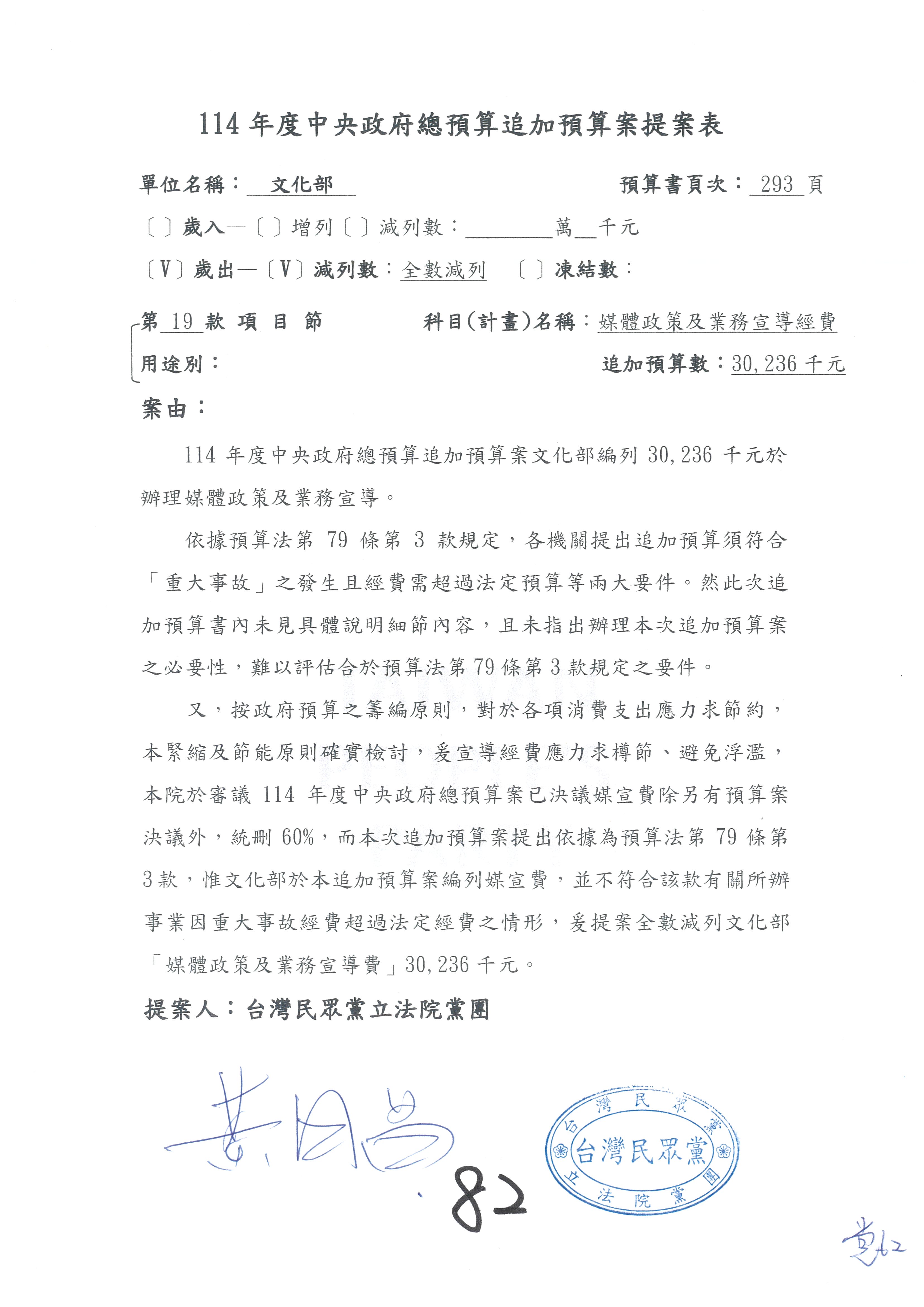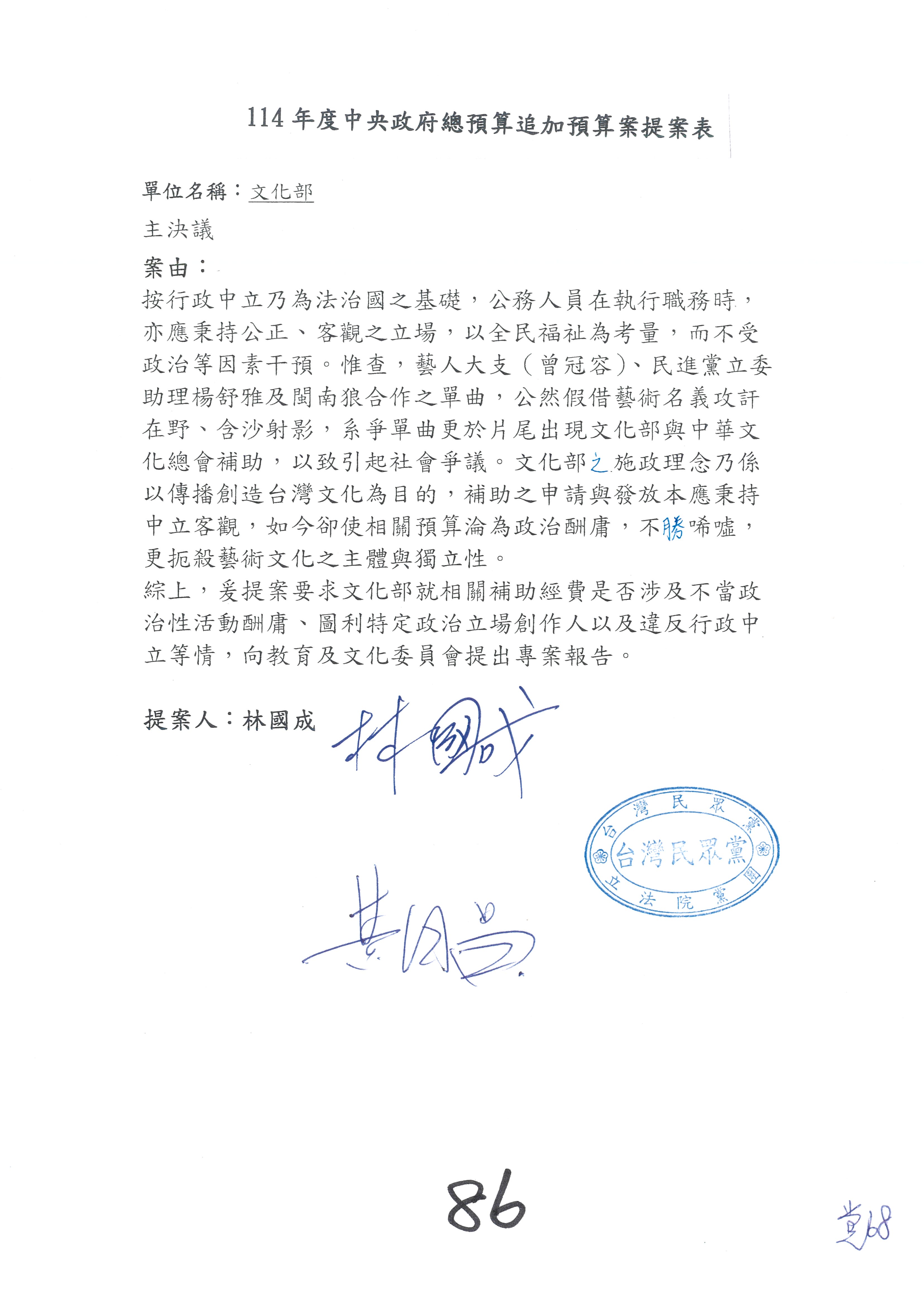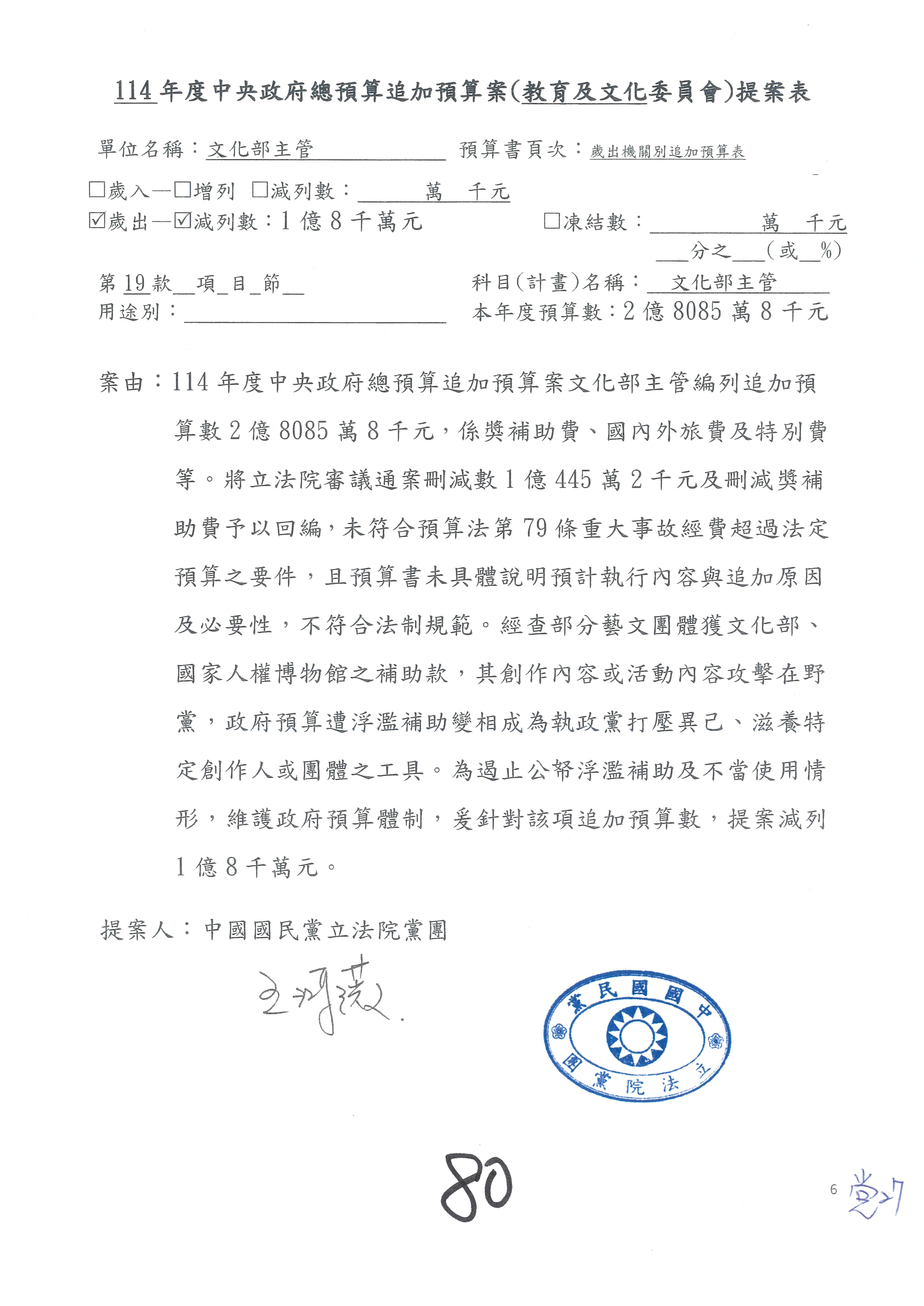 另外一部分,剛才有委員提到文化部的部分,各位,數字會說話,114年文化部的預算是高達279億,比去年多了19億之多,比去年多19億哦!補助的團體、藝文團體,補助團體從9億提高到23億,所以補助團體已經增加了14億,各位,這時候你說不能刪嗎?結果昨天在協商的時候,文化部長非常的強硬,說一毛錢都不能刪,我們原來都妥協了,原來妥協就是刪一部分,一部分讓它通過,部長也不同意,部長就是全要。各位,我們就看正當性在哪裡,於法,它不是重大事故,另外一部分,它的錢已經夠多了,已經比去年增加19億之多,而且補助的方面來講的話也增加14億之多,因此,這個錢既然是部長都不要,我們就來表決,所以等一下我們就請大家一起來表決這兩個案子,我們希望這兩個案子都能夠都按照在野黨的意思,能夠讓它全數刪掉,謝謝。