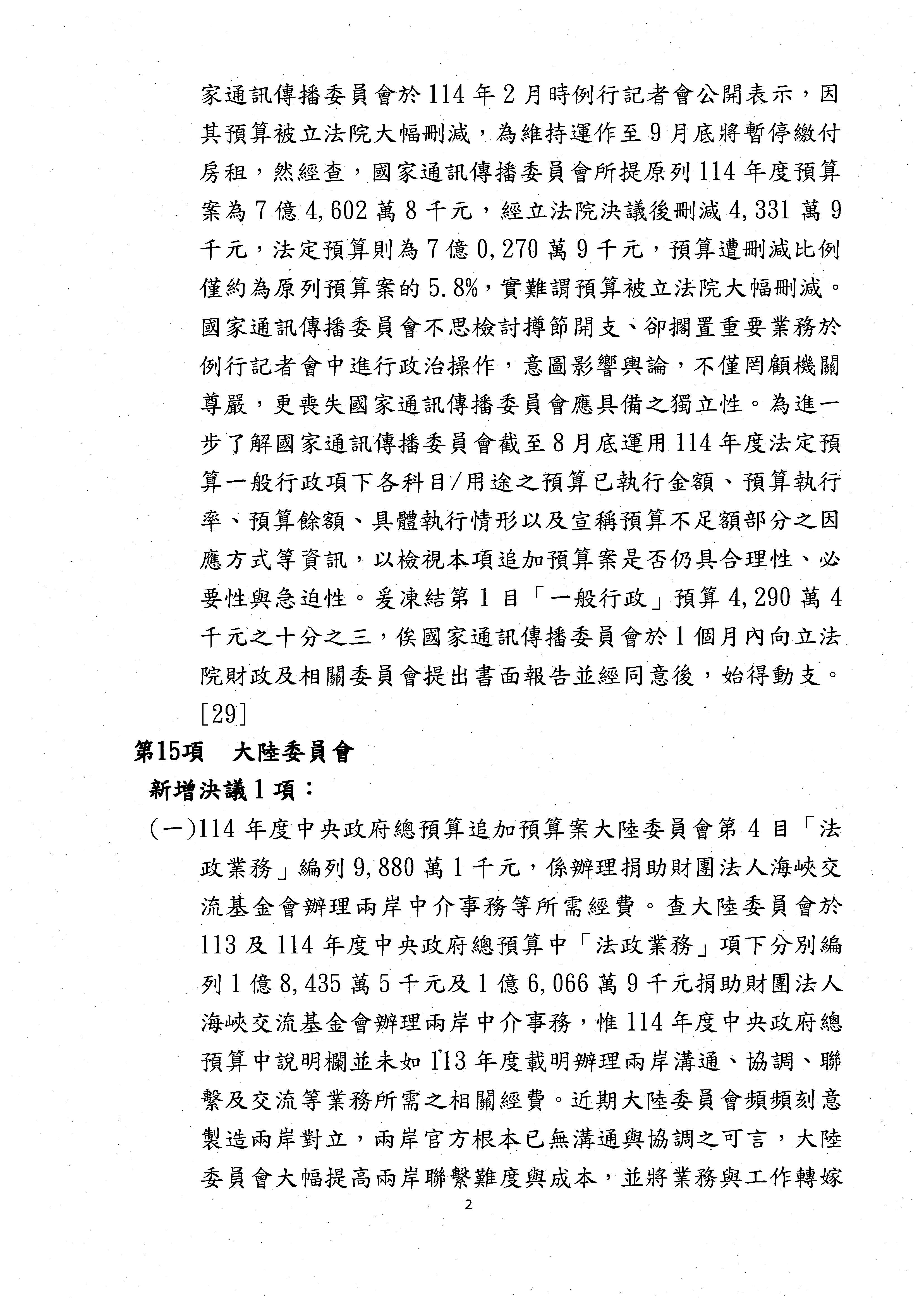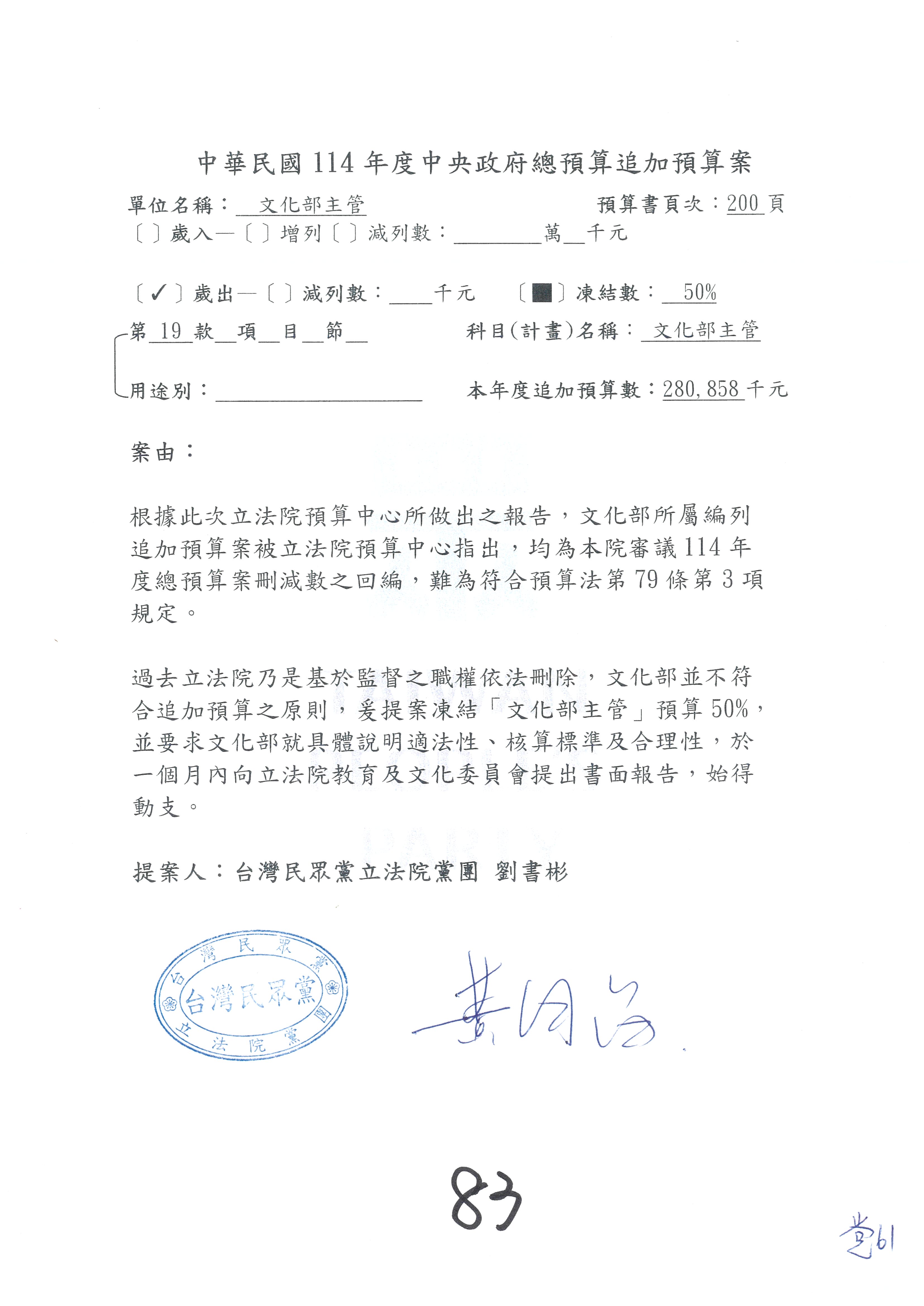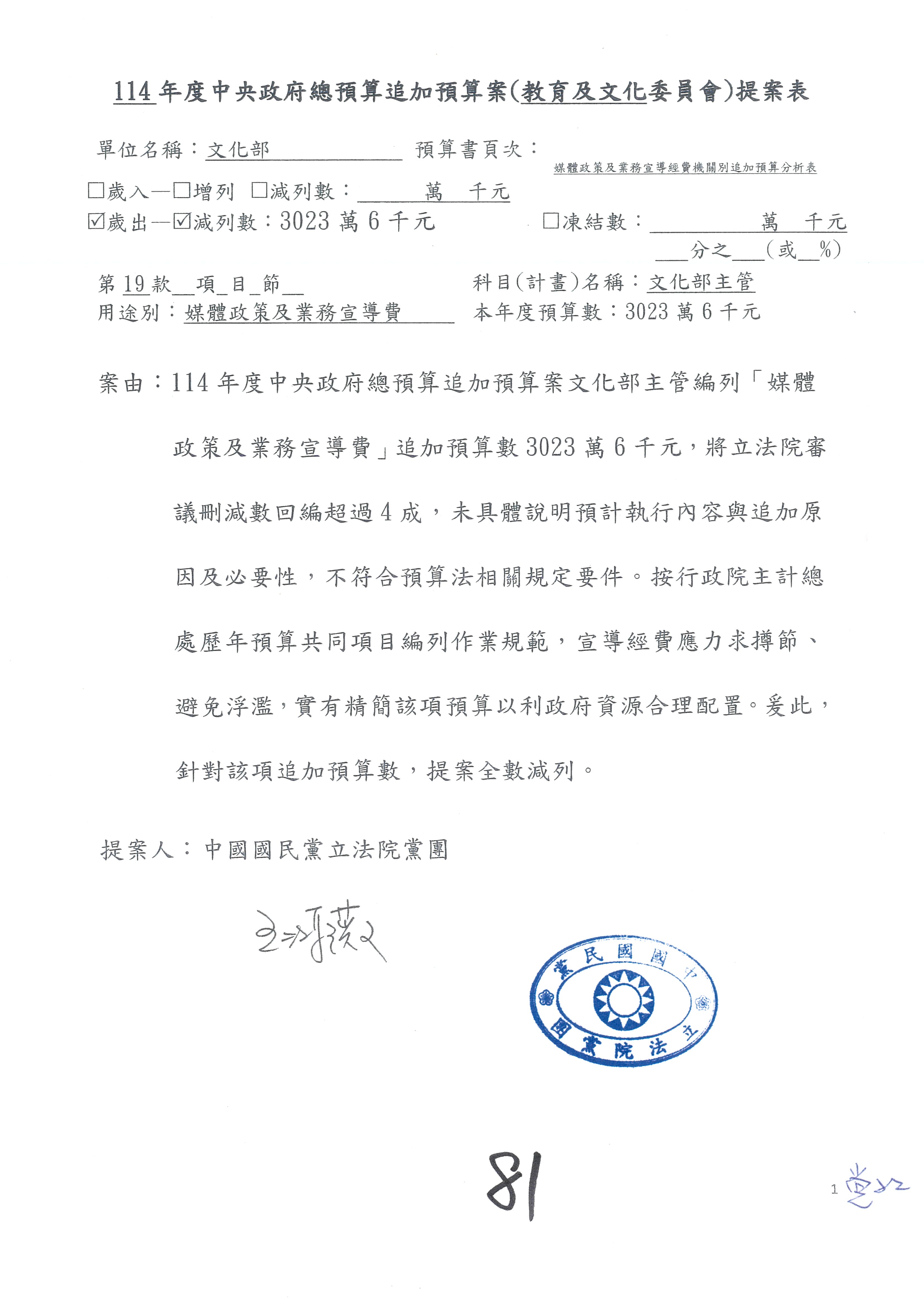 另外一部分,剛才有委員提到文化部的部分,各位,數字會說話,114年文化部的預算是高達279億,比去年多了19億之多,比去年多19億哦!補助的團體、藝文團體,補助團體從9億提高到23億,所以補助團體已經增加了14億,各位,這時候你說不能刪嗎?結果昨天在協商的時候,文化部長非常的強硬,說一毛錢都不能刪,我們原來都妥協了,原來妥協就是刪一部分,一部分讓它通過,部長也不同意,部長就是全要。各位,我們就看正當性在哪裡,於法,它不是重大事故,另外一部分,它的錢已經夠多了,已經比去年增加19億之多,而且補助的方面來講的話也增加14億之多,因此,這個錢既然是部長都不要,我們就來表決,所以等一下我們就請大家一起來表決這兩個案子,我們希望這兩個案子都能夠都按照在野黨的意思,能夠讓它全數刪掉,謝謝。