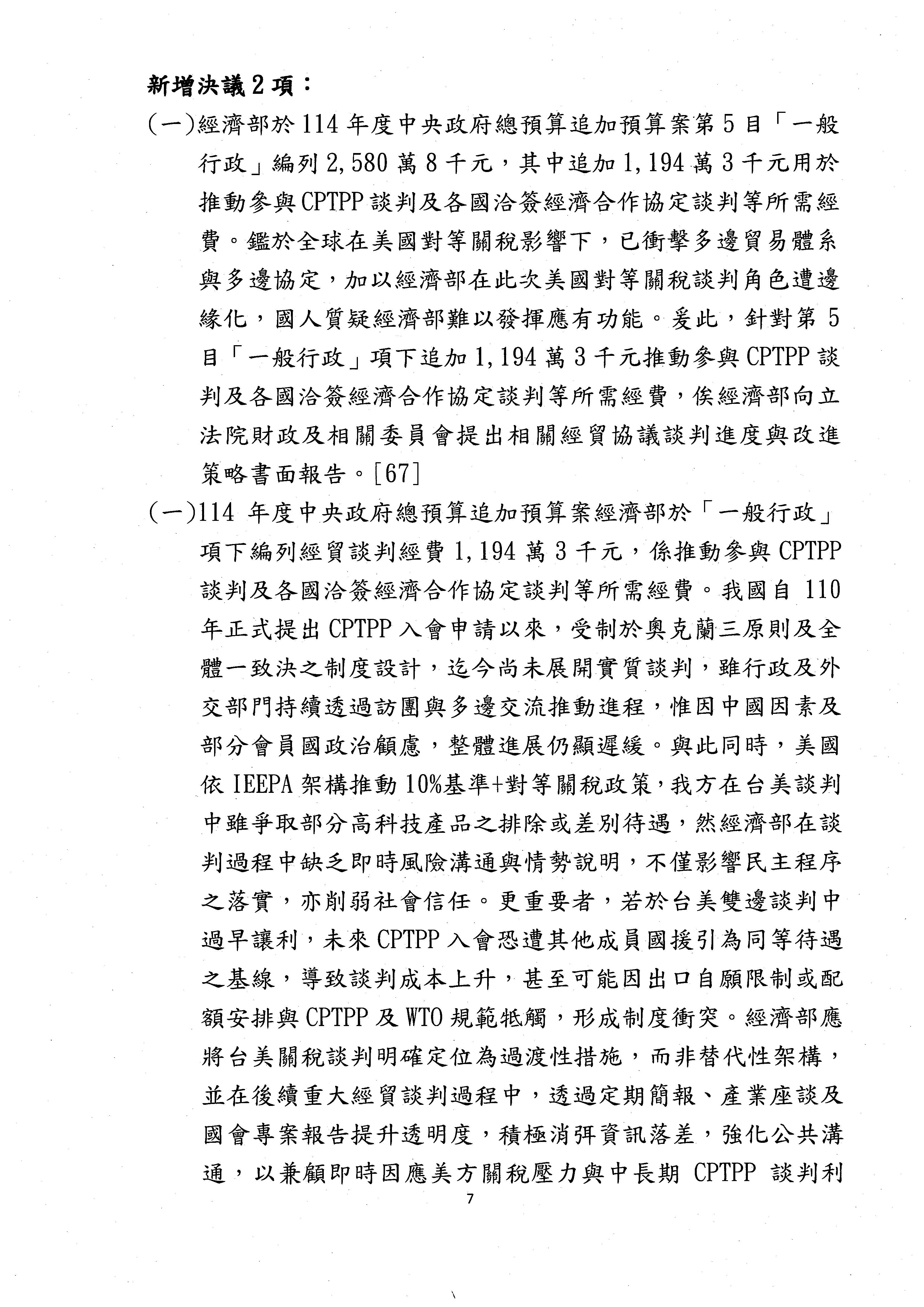 (一)114年度中央政府總預算追加預算案於第3款「立法院主管」編列追加預算2,822萬2千元。據行政院113年度中央政府總決算暨附屬單位決算及綜計表及審計部113年度中央政府總決算審核報告彙整資料,立法院主管預算113年度共編列約36.7億元,然而最後僅執行約35.8億元,產生經費賸餘8,700萬元,賸餘數占原編列預算數比率2.38%;又114年已通過之法定預算已達36.9億元,惟本次追加預算案仍要追加2,822萬2千元,為確保國家資源運用得宜,允宜加強檢視財務效能,避免排擠其他重要政事、造成國家債務負擔。請立法院於1個月內就113年總決算經費賸餘原因及檢討改善方向及追加預算項目是否符合預算法第79條之情形及其必要性,向立法院財政及相關委員會提出書面報告。