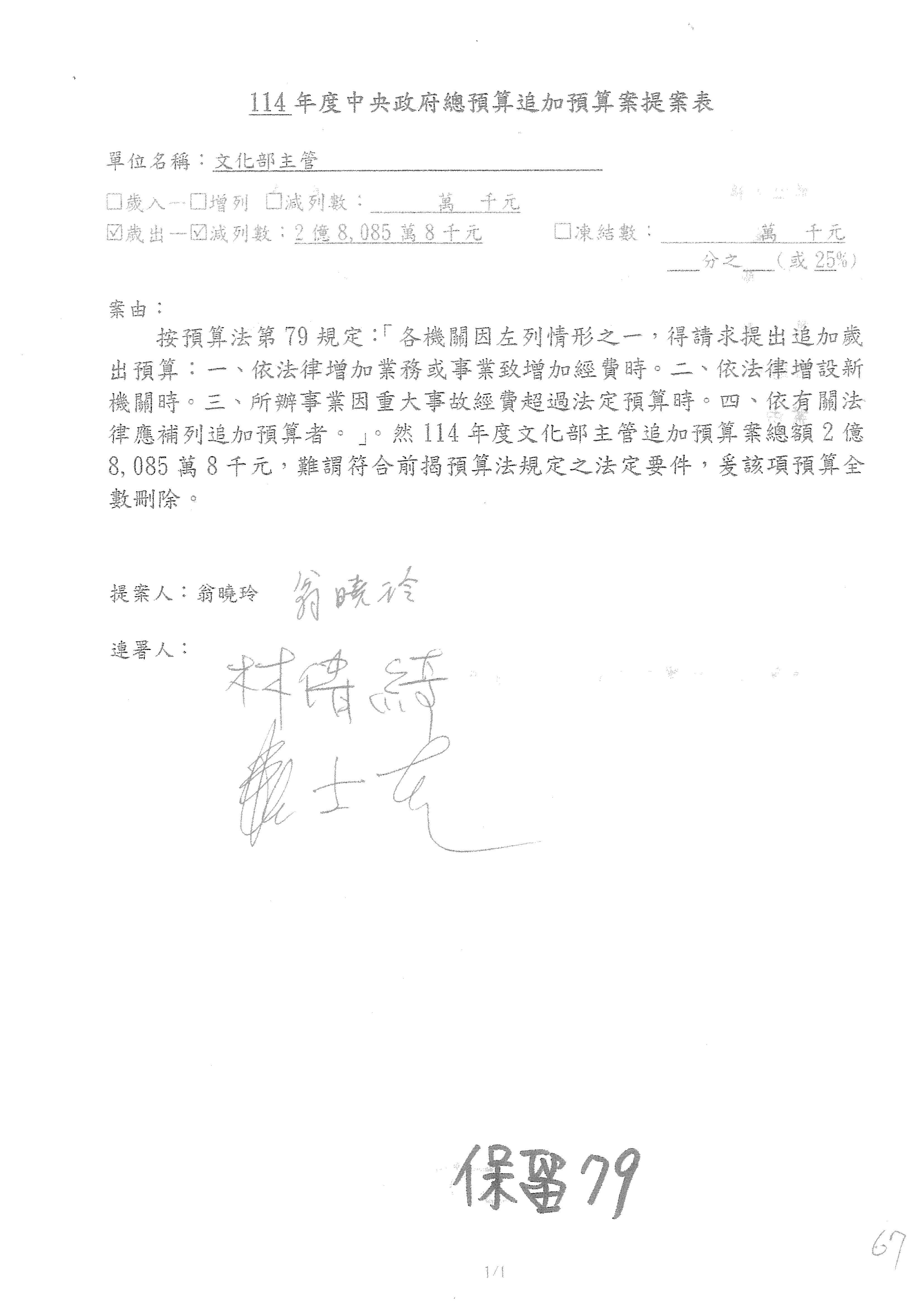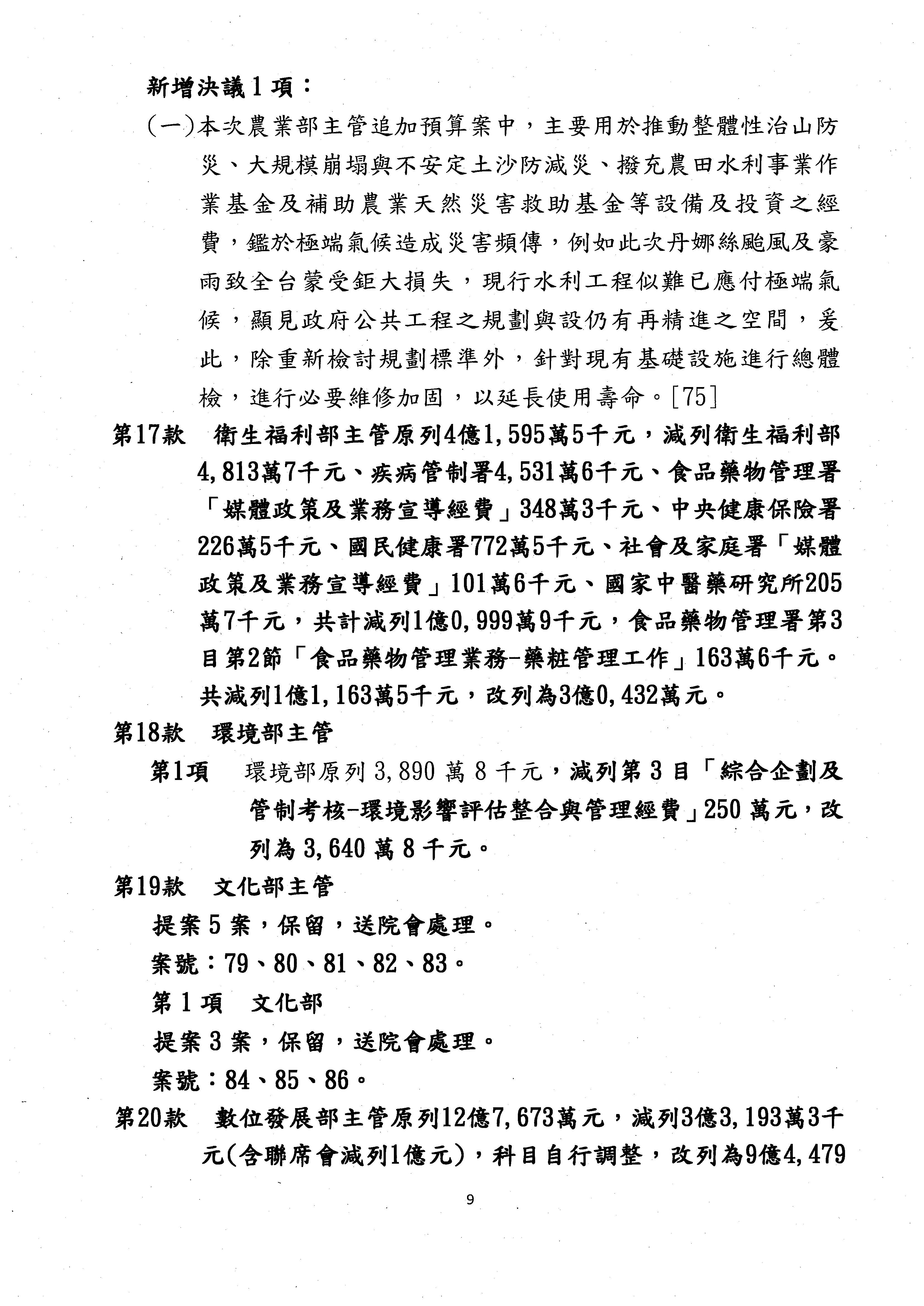 主席:報告院會,因為方才通過第79案,文化部主管追加預算全數刪除,所以保留第80案至第85案,有關減列及凍結部分,文化部主管追加預算之提案(含媒宣費),我們就不再進行處理。