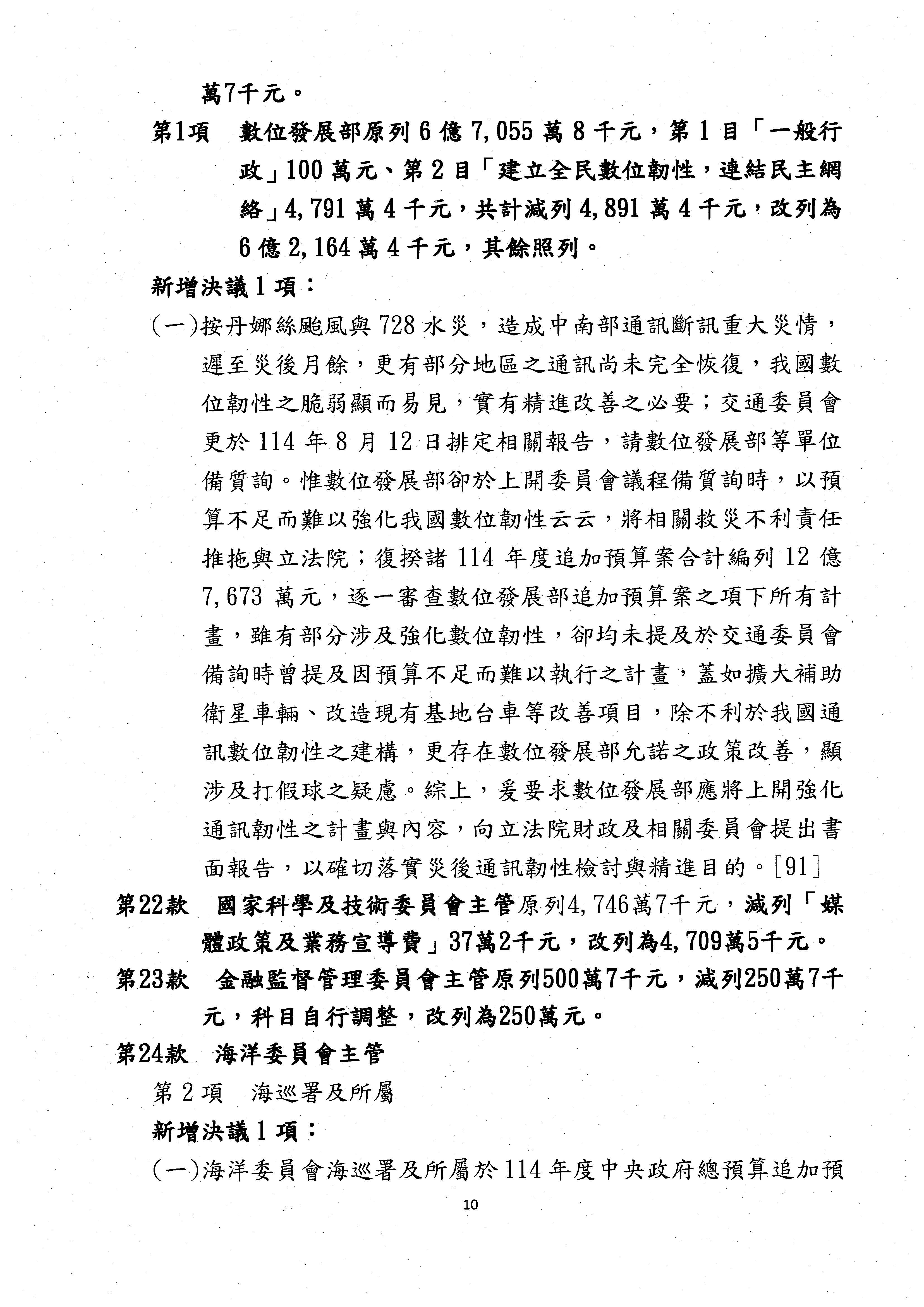 (一)按丹娜絲颱風與728水災,造成中南部通訊斷訊重大災情,遲至災後月餘,更有部分地區之通訊尚未完全恢復,我國數位韌性之脆弱顯而易見,實有精進改善之必要;交通委員會更於114年8月12日排定相關報告,請數位發展部等單位備質詢。惟數位發展部卻於上開委員會議程備質詢時,以預算不足而難以強化我國數位韌性云云,將相關救災不利責任推拖與立法院;復揆諸114年度追加預算案合計編列12億7,673萬元,逐一審查數位發展部追加預算案之項下所有計畫,雖有部分涉及強化數位韌性,卻均未提及於交通委員會備詢時曾提及因預算不足而難以執行之計畫,蓋如擴大補助衛星車輛、改造現有基地台車等改善項目,除不利於我國通訊數位韌性之建構,更存在數位發展部允諾之政策改善,顯涉及打假球之疑慮。綜上,爰要求數位發展部應將上開強化通訊韌性之計畫與內容,向立法院財政及相關委員會提出書面報告,以確切落實災後通訊韌性檢討與精進目的。