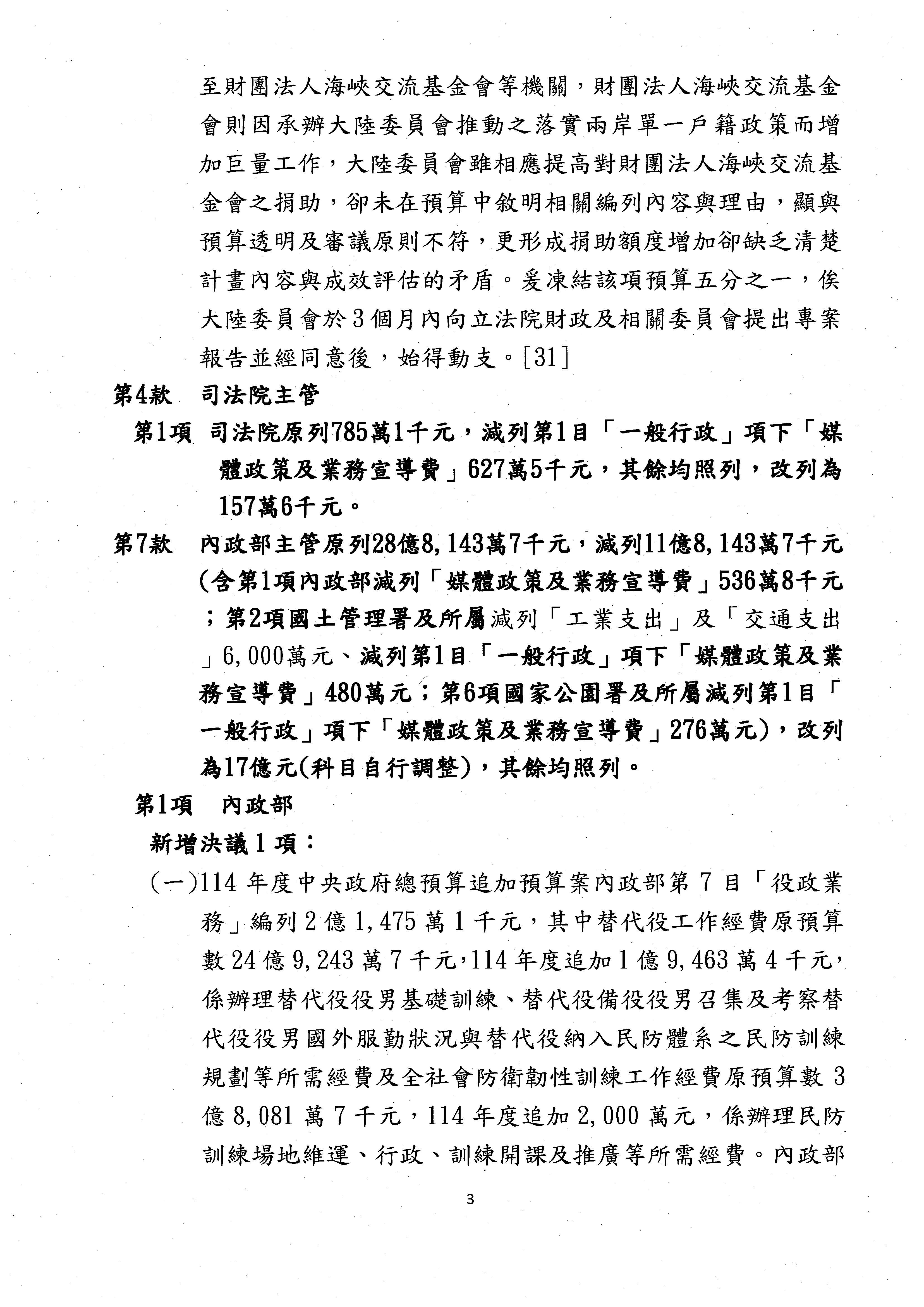 (一)114年度中央政府總預算追加預算案大陸委員會第4目「法政業務」編列9,880萬1千元,係辦理捐助財團法人海峽交流基金會辦理兩岸中介事務等所需經費。查大陸委員會於113及114年度中央政府總預算中「法政業務」項下分別編列1億8,435萬5千元及1億6,066萬9千元捐助財團法人海峽交流基金會辦理兩岸中介事務,惟114年度中央政府總預算中說明欄並未如113年度載明辦理兩岸溝通、協調、聯繫及交流等業務所需之相關經費。近期大陸委員會頻頻刻意製造兩岸對立,兩岸官方根本已無溝通與協調之可言,大陸委員會大幅提高兩岸聯繫難度與成本,並將業務與工作轉嫁至財團法人海峽交流基金會等機關,財團法人海峽交流基金會則因承辦大陸委員會推動之落實兩岸單一戶籍政策而增加巨量工作,大陸委員會雖相應提高對財團法人海峽交流基金會之捐助,卻未在預算中敘明相關編列內容與理由,顯與預算透明及審議原則不符,更形成捐助額度增加卻缺乏清楚計畫內容與成效評估的矛盾。爰凍結該項預算五分之一,俟大陸委員會於3個月內向立法院財政及相關委員會提出專案報告並經同意後,始得動支。