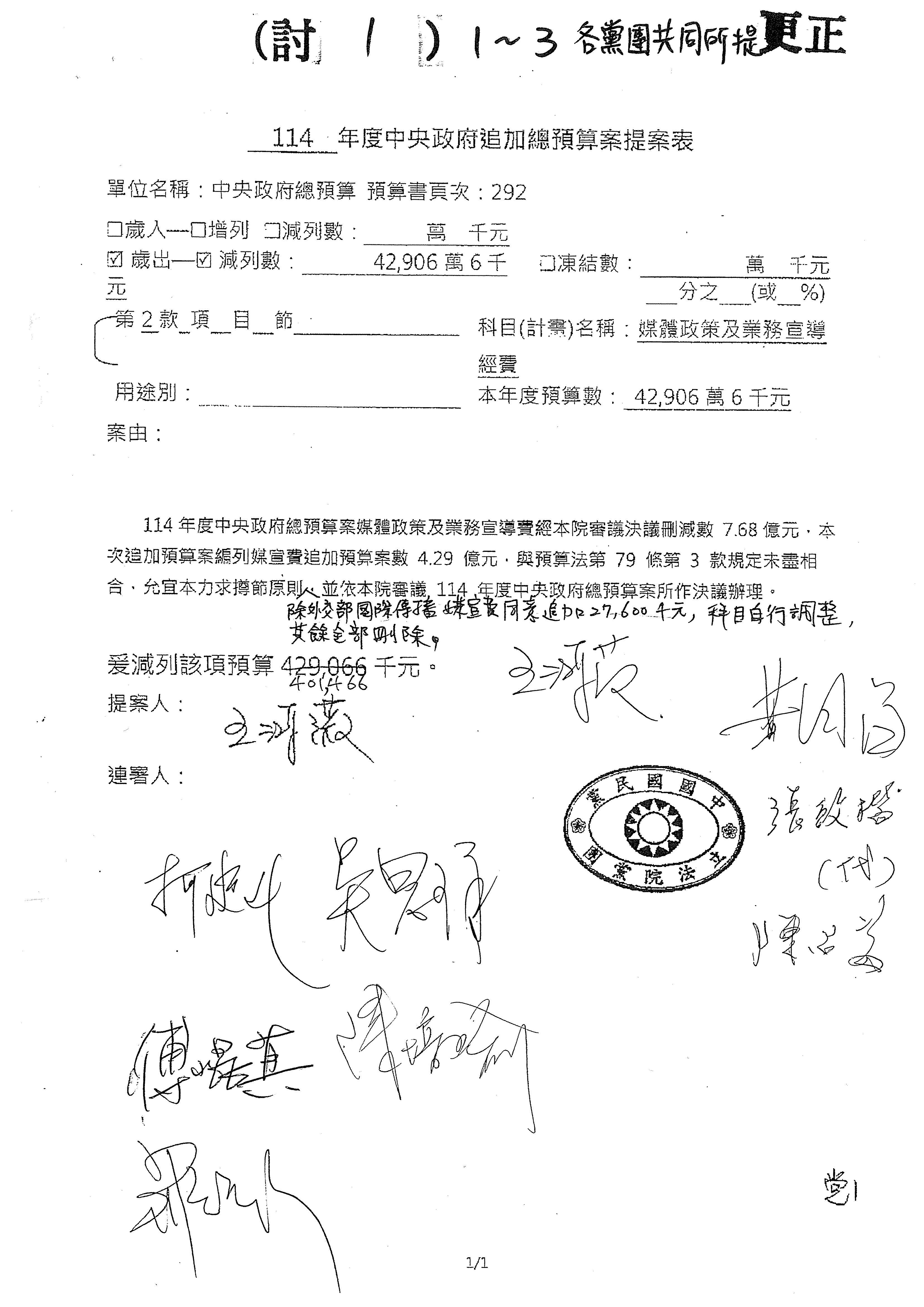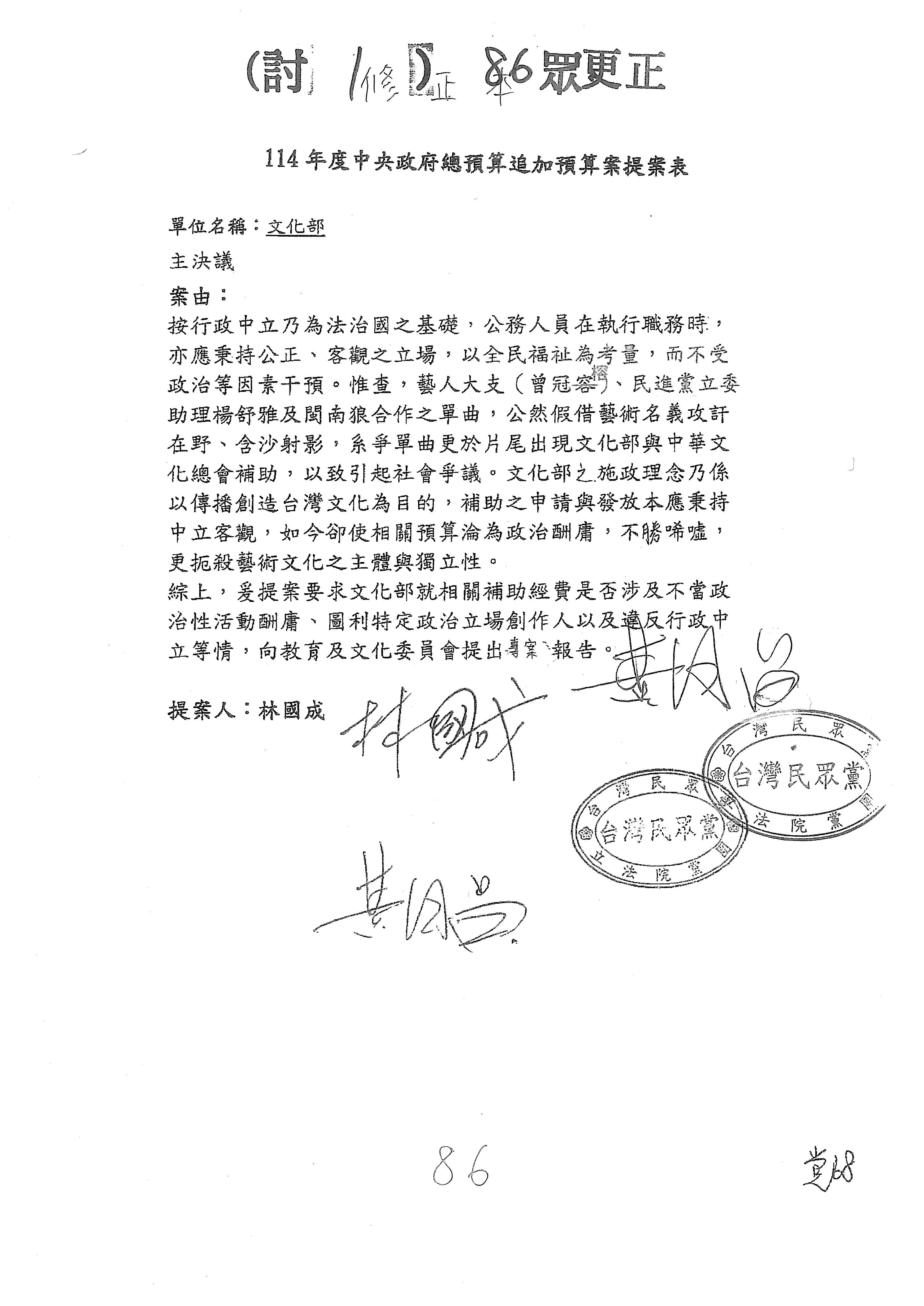 國民黨黨團、民進黨黨團、台灣民眾黨黨團共同更正提議: