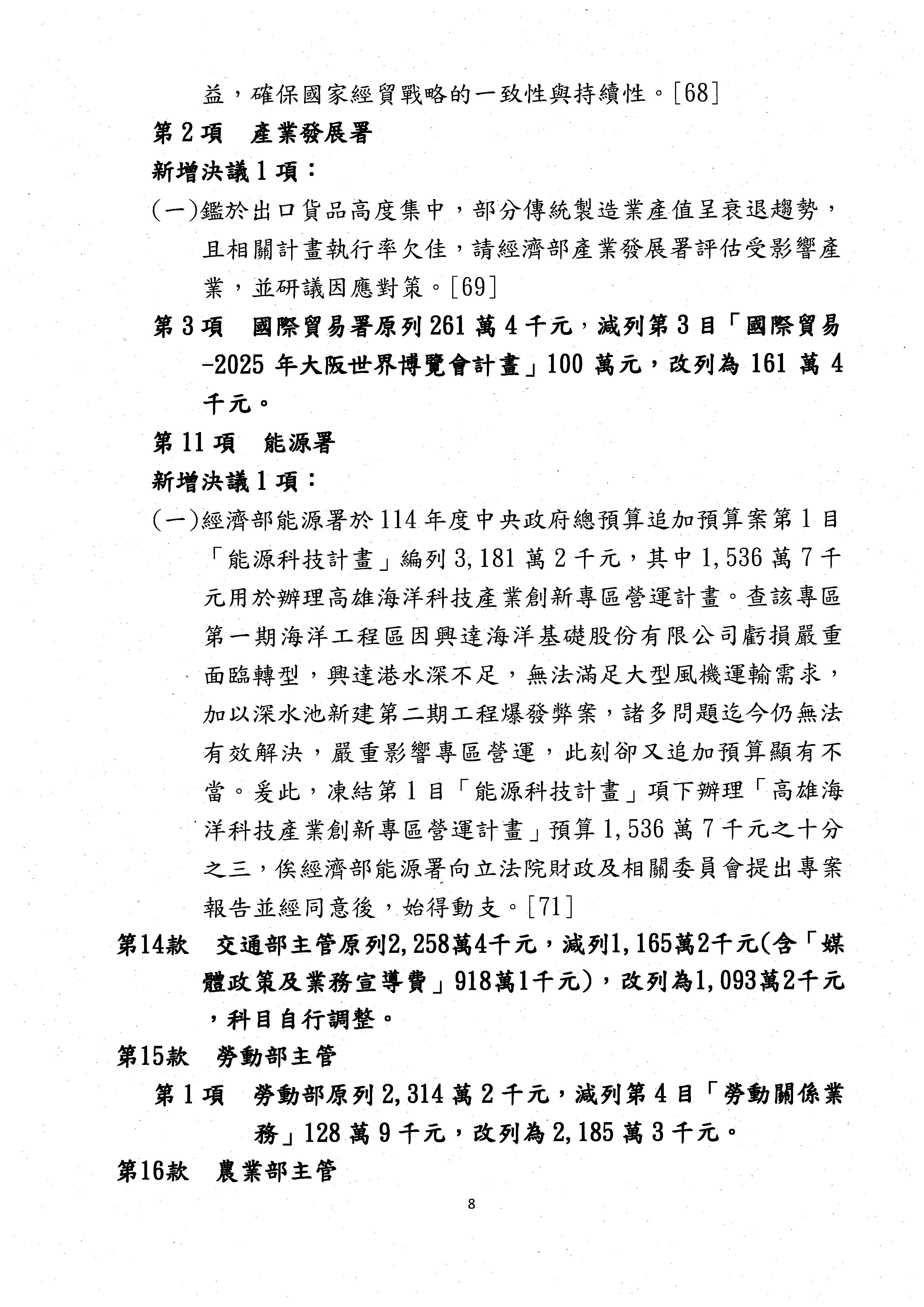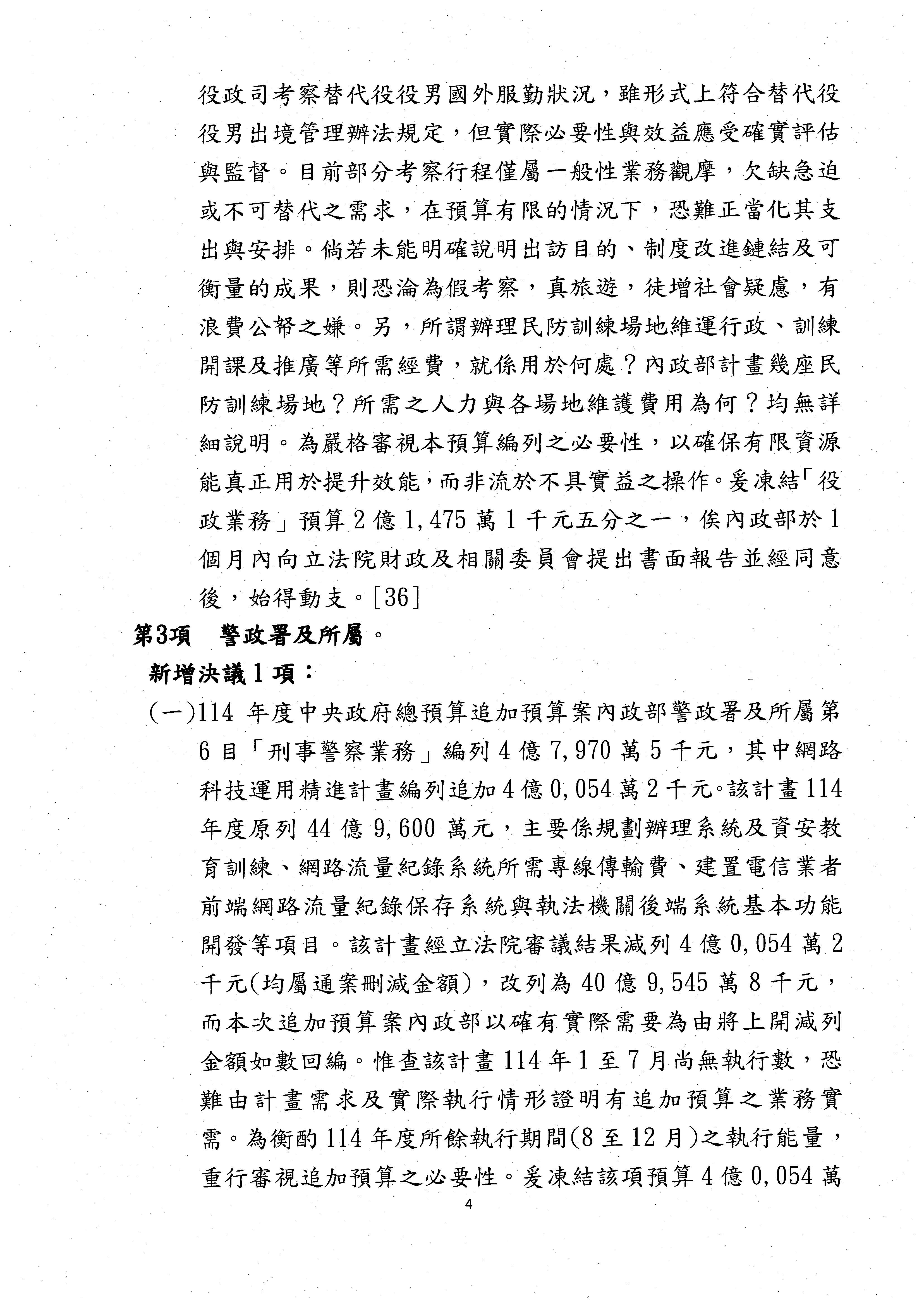 (一)本次中央政府總預算追加預算案中,行政院於第1項第2目「施政及法制業務」編列追加預算957萬6千元,用以辦理政策及法案研審、法規審查研議等。近年來詐欺防治為我國重點工作項目,詐欺案件造成人民每日數億元的財產損失,然而114年詐欺犯罪危害防制條例出現重大爭議,刑事大法庭113年度台上大字第4096號裁定中,只要繳回實際取得的酬勞即可減刑,遭各界質疑有縱放詐團成員之疑慮,在法務部高呼修法後,立法院委員已提出因應修法,但在委員會審查上,行政院法務部與司法院討論無法聚焦,且溝通方向上難以體現保障受害者權益之立法目的,令社會各界對政府打詐之決心以及兩院之法案溝通效率產生疑慮。爰建請行政院對於詐欺犯罪危害防制條例修法進度,以及會同相關單位全面盤點本條例中是否有相關條文尚待精進,並確保相關單位了解本法之精神,以保障未來本條例中不會再有詐欺犯遭縱放之空間,於彙整後向立法院財政及相關委員會提出書面報告,以展現政府打擊詐欺犯罪、保護受害者權益之決心。