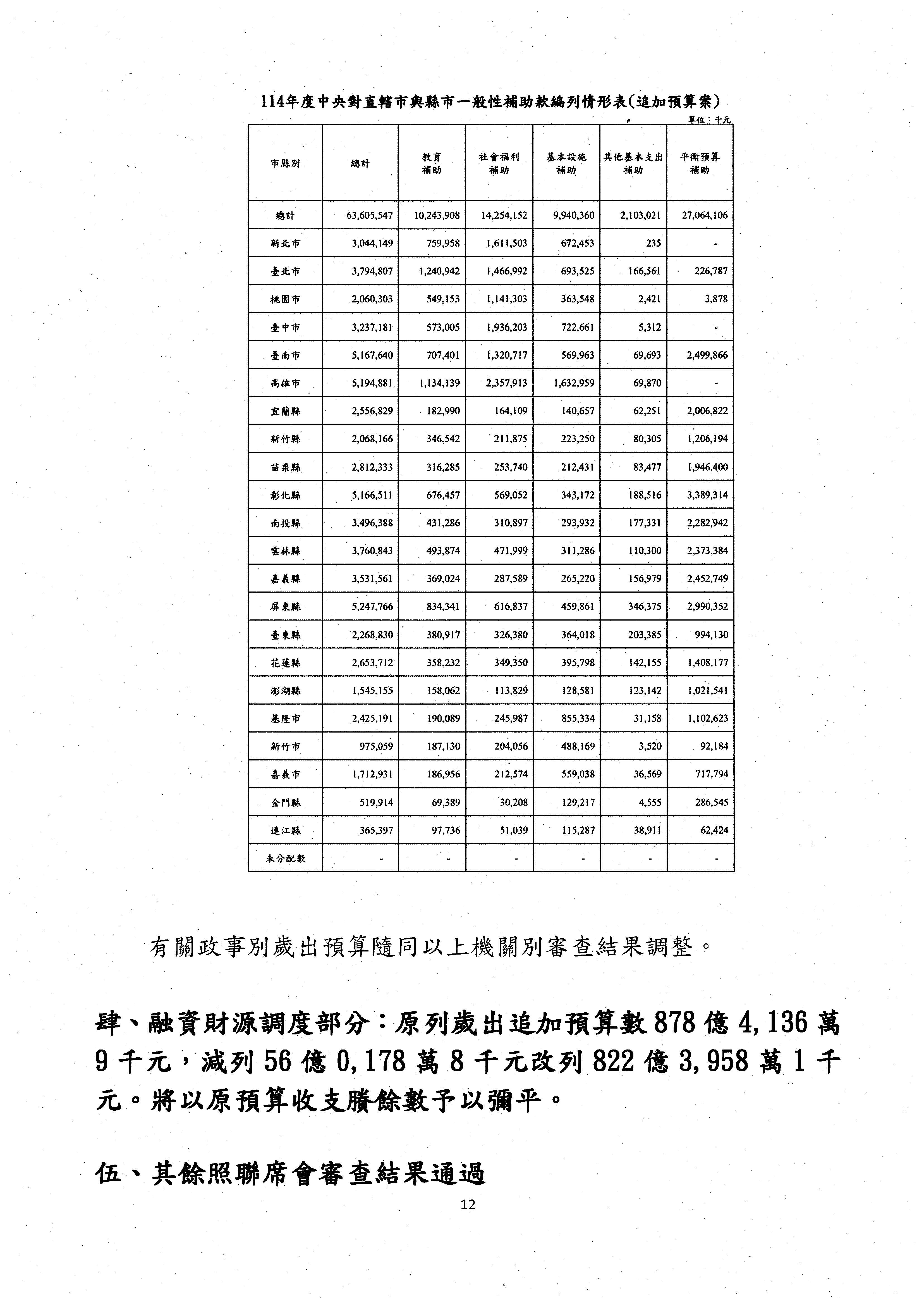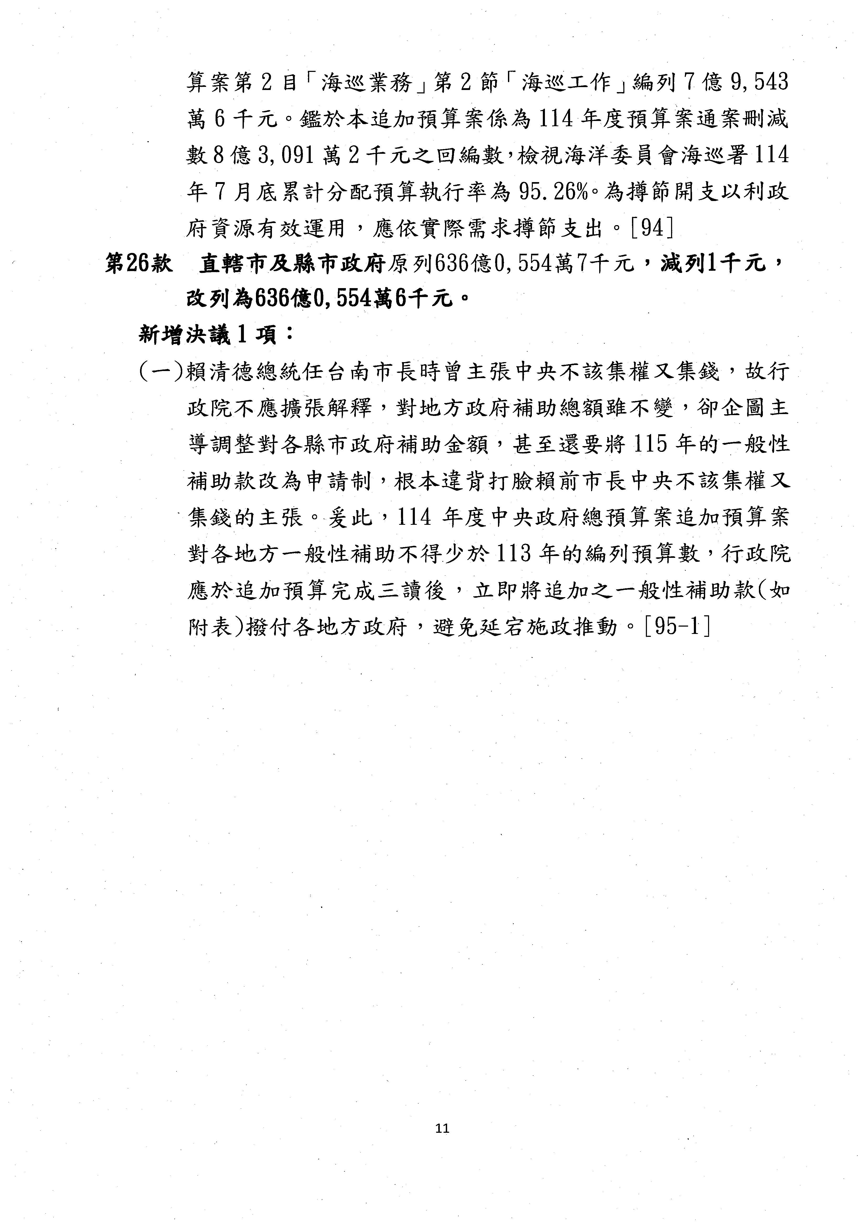 甚至在這一次追加預算當中引起最大爭議的就是636億的地方補助款,我們在審查2025年中央政府總預算的時候,在通刪的事項上面清楚表明,刪除的是中央政府及其所屬機關,結果沒有想到,我們的行政院自己該刪的預算不刪,竟然把腦筋動到地方政府的頭上!依照法制,本來是不應該讓它過的,但是當我們的行政院院長公然幹起擄人勒贖這樣的行為的時候,我們沒有辦法,只有先付贖金把肉票救出來!但是這樣子違法編列預算的方式,相關的責任,我們還是會追究。