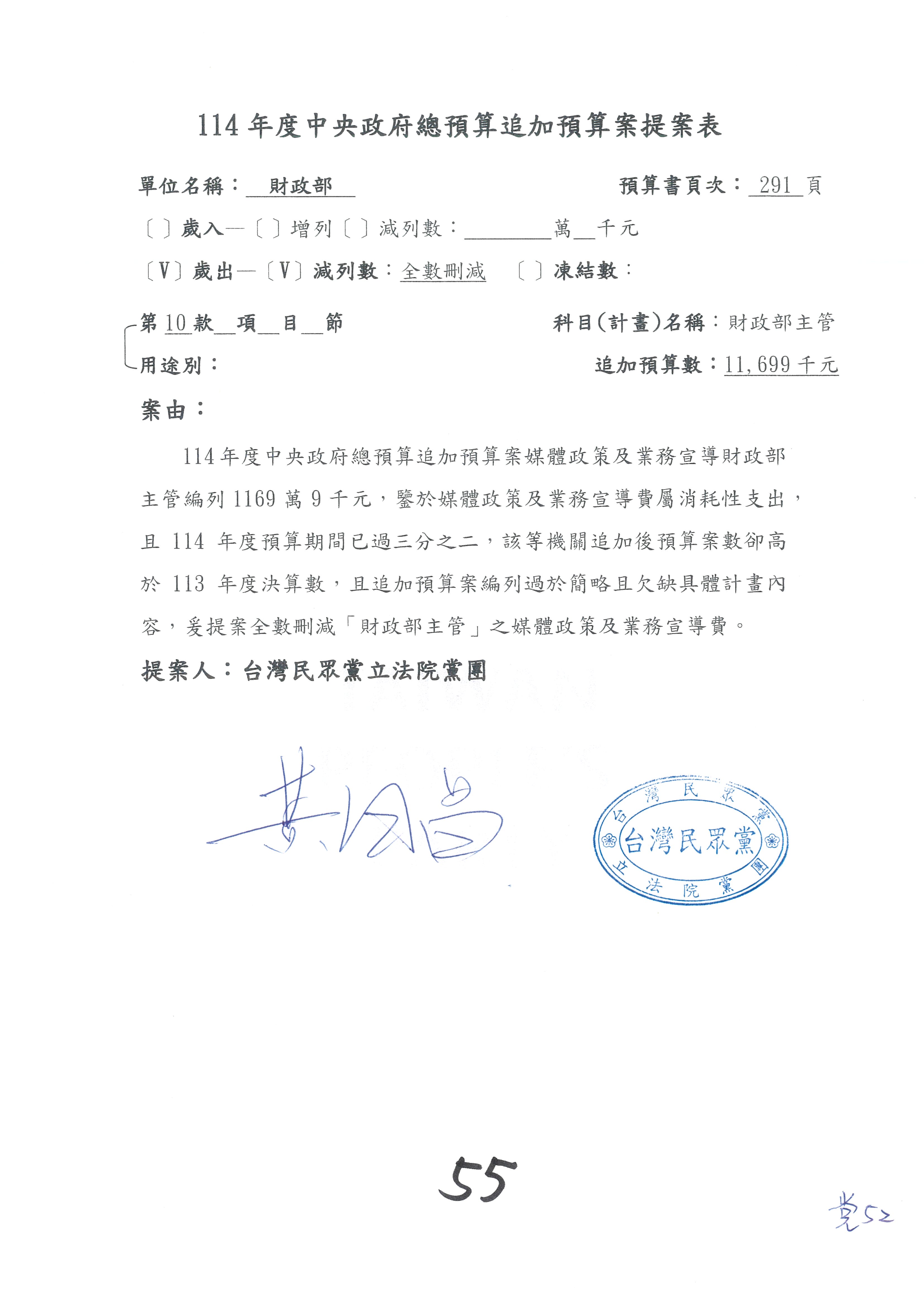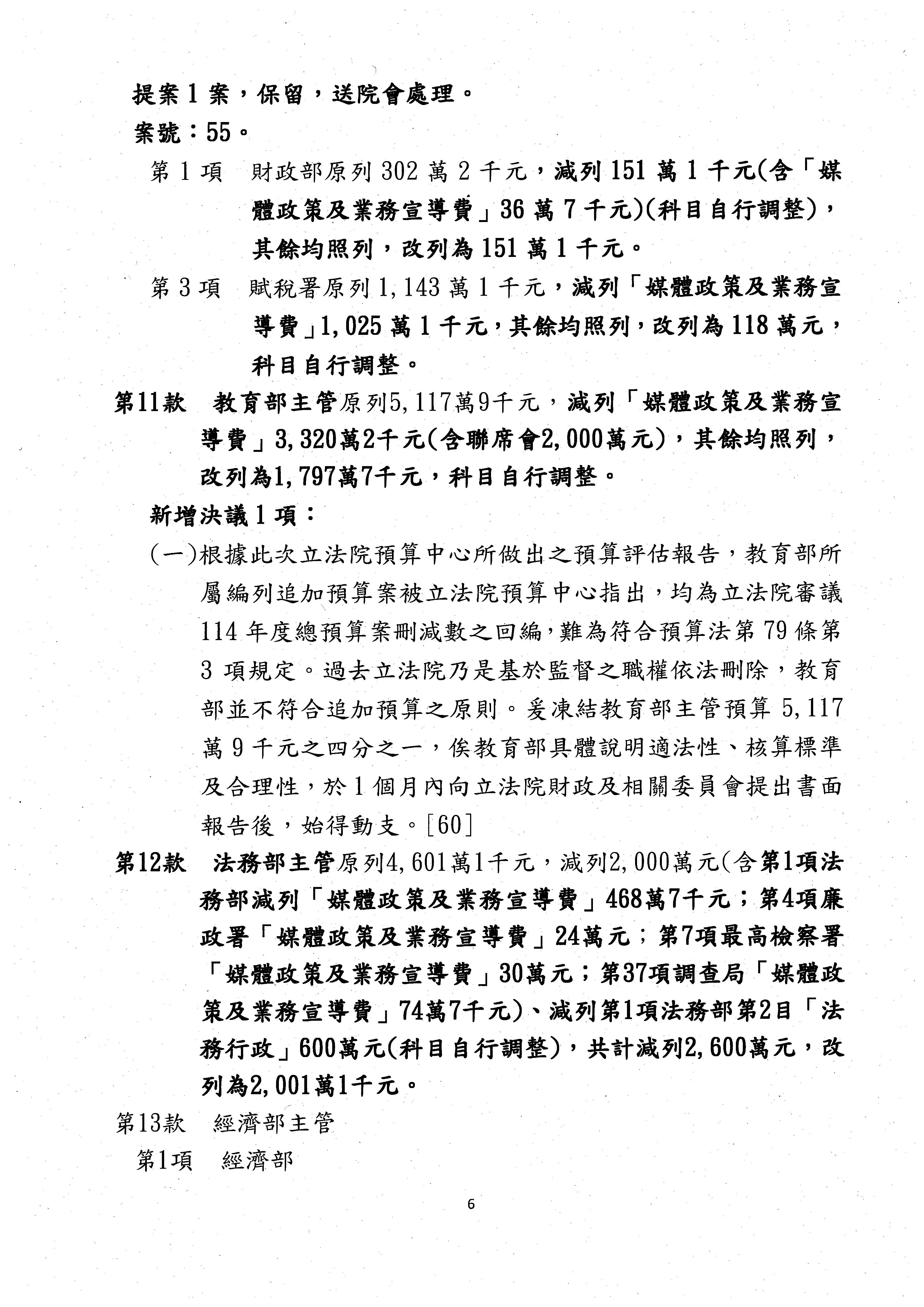 報告院會,因為方才有媒體政策及業務宣導費第1、2、3案合併處理之共同提議,所以保留第55案有關財政部媒宣案,我們就不再進行處理。