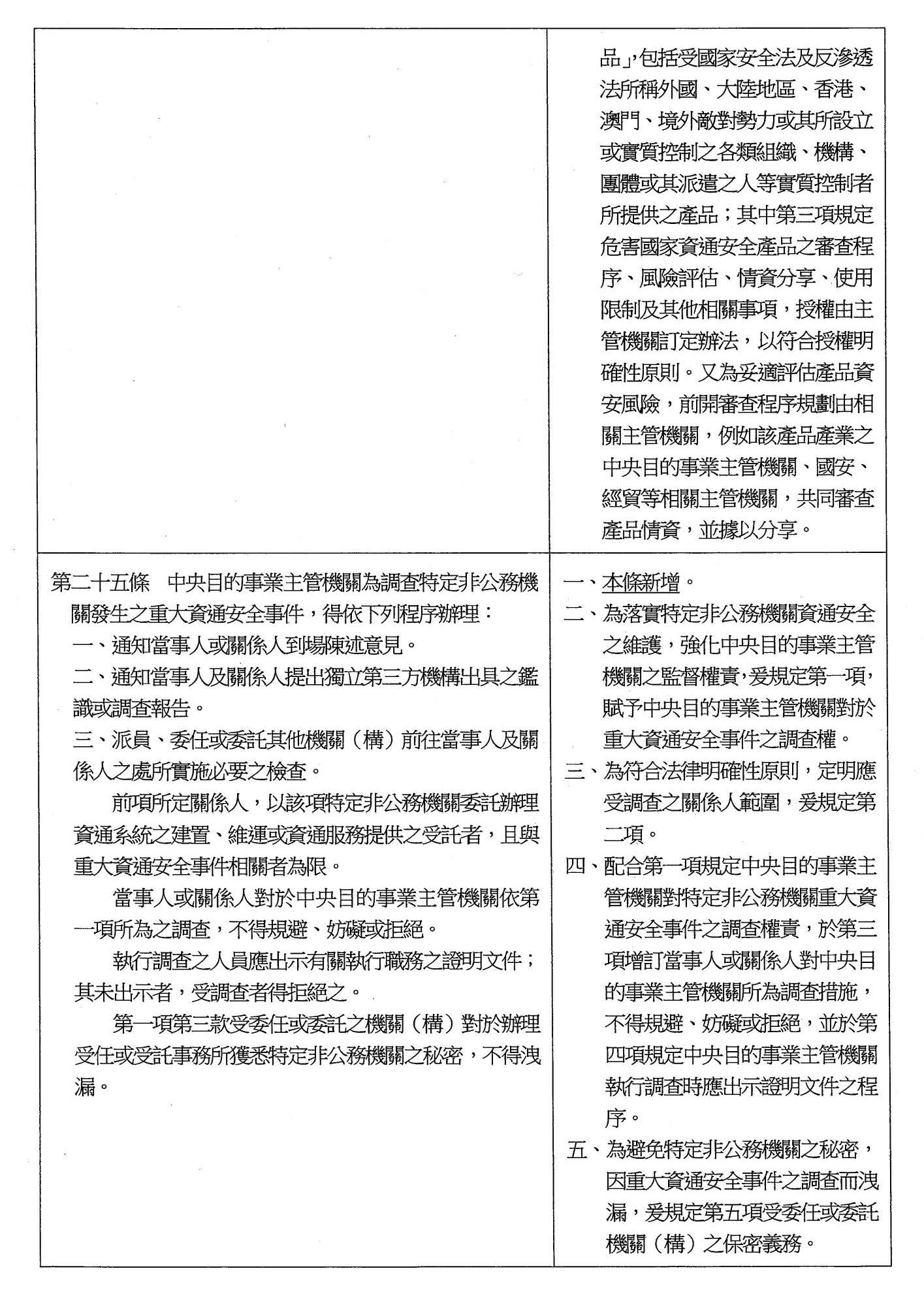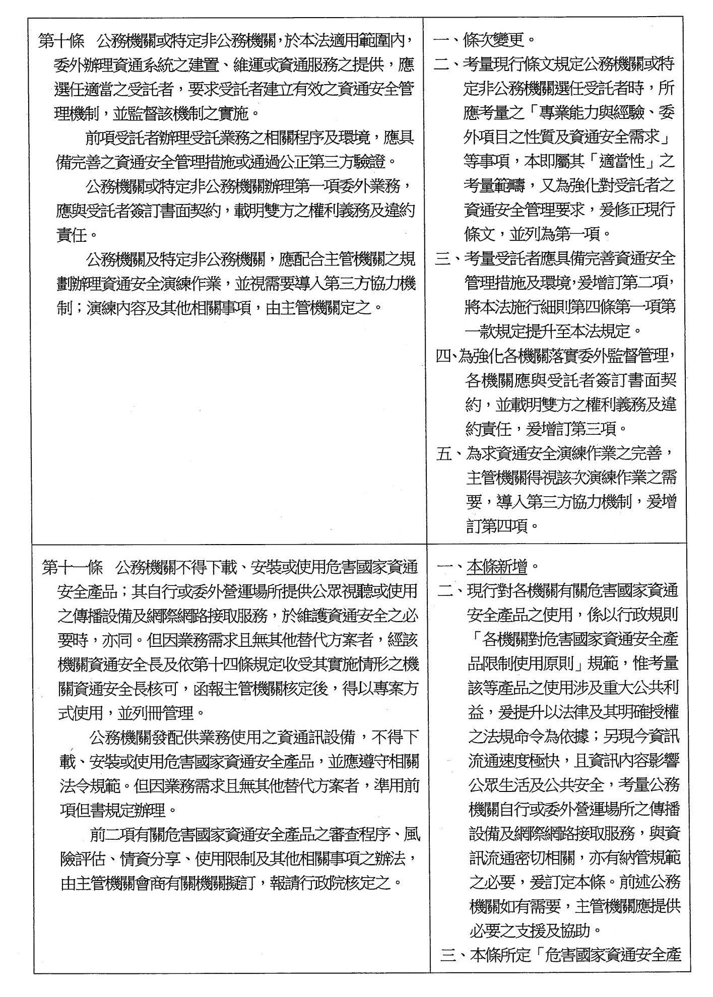 惟本次修法涉及多數重大變動,其中涉及子法者除上述子法應隨同修正外,尚包括但不限於草案第5條第4項「國家資通安全會報組成……」、第11條第3項「資通安全產品審查程序……」、第16條第3項「資通安全維護計畫必要事項……」、第19條第6項「資通安全專職人員查核」等內容尚待擬訂子法加以規範。