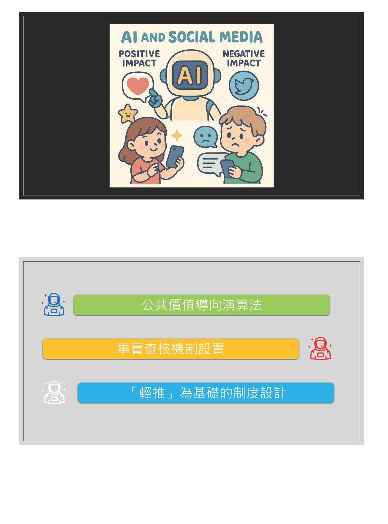 今天我要談的AI主要有兩點:第一個是社群媒體、社群平臺的演算法,另外一個就是生成式AI的內容。所謂社群媒體AI的演算法會影響什麼?它基本上就是影響所有社群媒體的使用者會看到哪些資訊?某一些社群平臺可能是給你想看的資訊,就是它會依照你的偏好來推薦一些資訊,這個時候就會產生很嚴重所謂的同溫層效應,也就是你只會活在你認為的這個世界裡面。但是有一些的社群媒體會讓不同的意見,甚至是多元、更加對立的內容產出在你的塗鴉牆上面,這個時候就會看到很多不同的資訊,當然好處是可以促進民主政治的溝通,但壞處也是民眾可能看到這麼多衝突的資訊,久而久之就對這個感到厭煩而不想看,反而對於民主治理會有一定程度的影響。