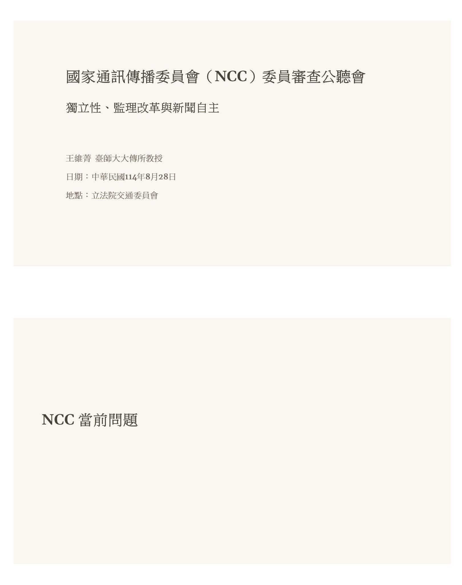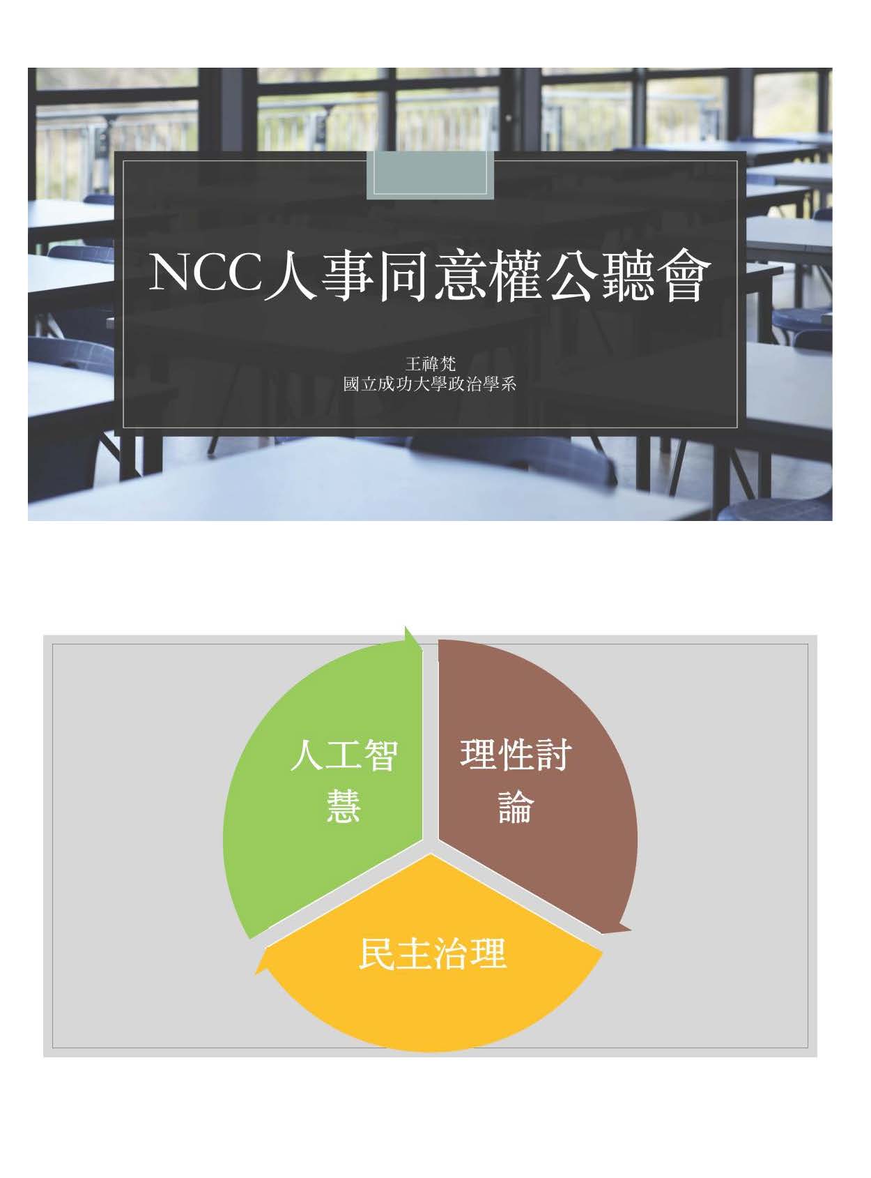 王教授禕梵:主席、各位學者、專家、先進,各位媒體女士、先生,大家早安、大家好,我是成大政治系的助理教授王禕梵。今天很開心能夠來到交通委員會,對於NCC人事同意權發表一些意見,因為我是一個公共行政的學者,所以基本上會從政策面做一些議題上的討論,當然這些議題可能也跟其他行政院的部會有關聯,因為今天主要談的是NCC,所以提供一些意見供各位參考。