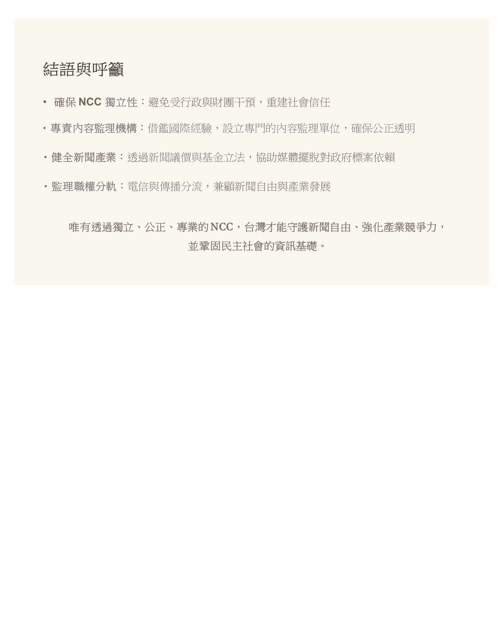 最後的結語就是希望確保NCC的獨立性,避免受到行政跟財團的干預,並重新建立社會的信任,也借鏡國際經驗,設立專門的內容監理單位。其他大概也講過了,好像也有附在這個資料裡面,就請大家參閱,謝謝。