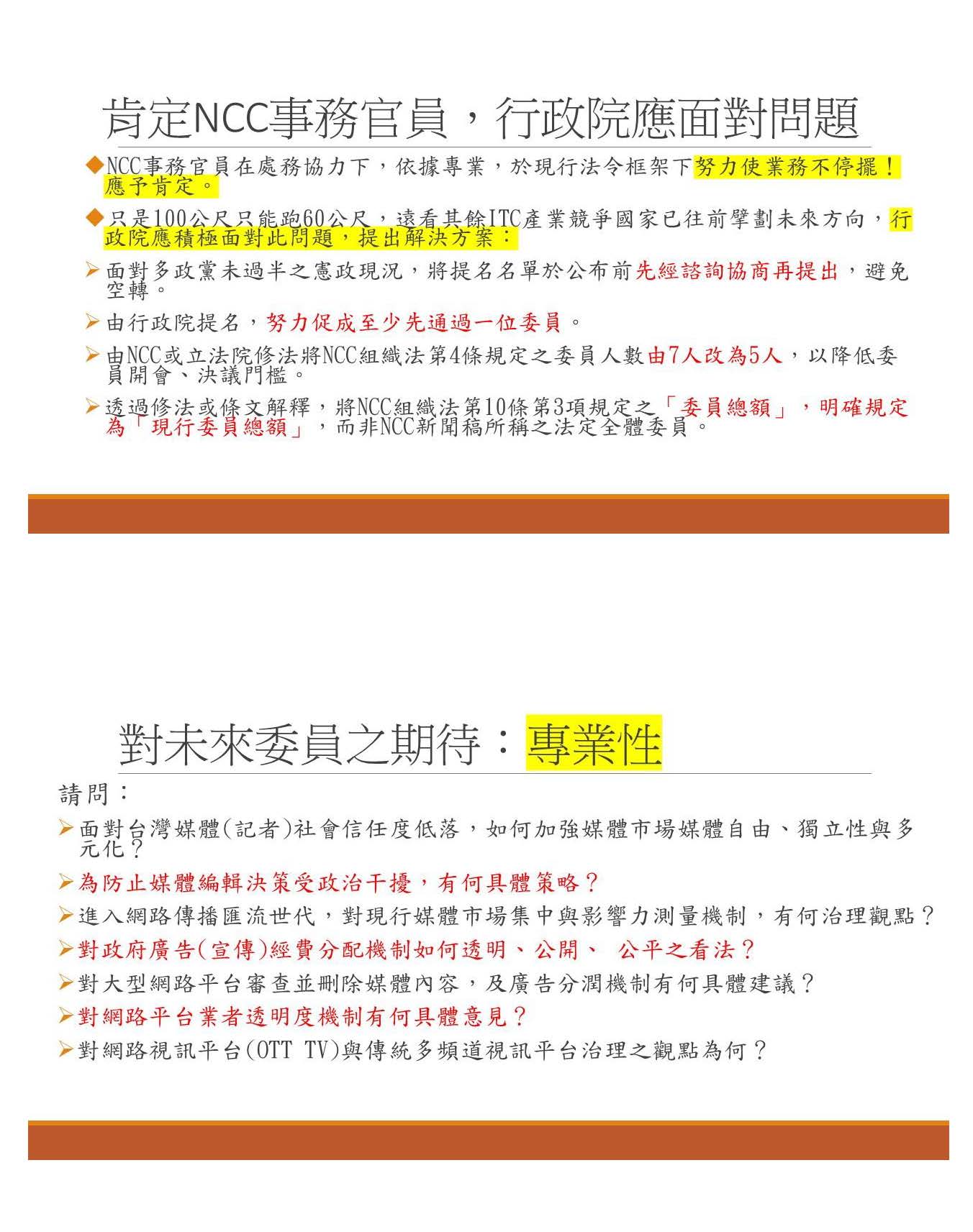 簡單來說,三大期待,對於嚴守獨立機關的專業性、對於新聞自由、言論自由跟市場的公平性,還有社會責任的參與主動性,這是我期待未來NCC的委員能夠負起責任的!我們一樣專業審查、嚴格把關,適任的、合理的名單,我們絕對沒有阻擋的理由,但如果是不適任的,或者是大家外界普遍認為他是不符合NCC獨立機關期待的話,我們也會勇敢的投下反對票。但最重要的是行政部門應該要積極的提名真的符合大家所期待的NCC委員,讓我們國家持續往前邁進,臺灣是我們共同的,所以我們一起努力,希望讓我們國家越來越好,感謝!