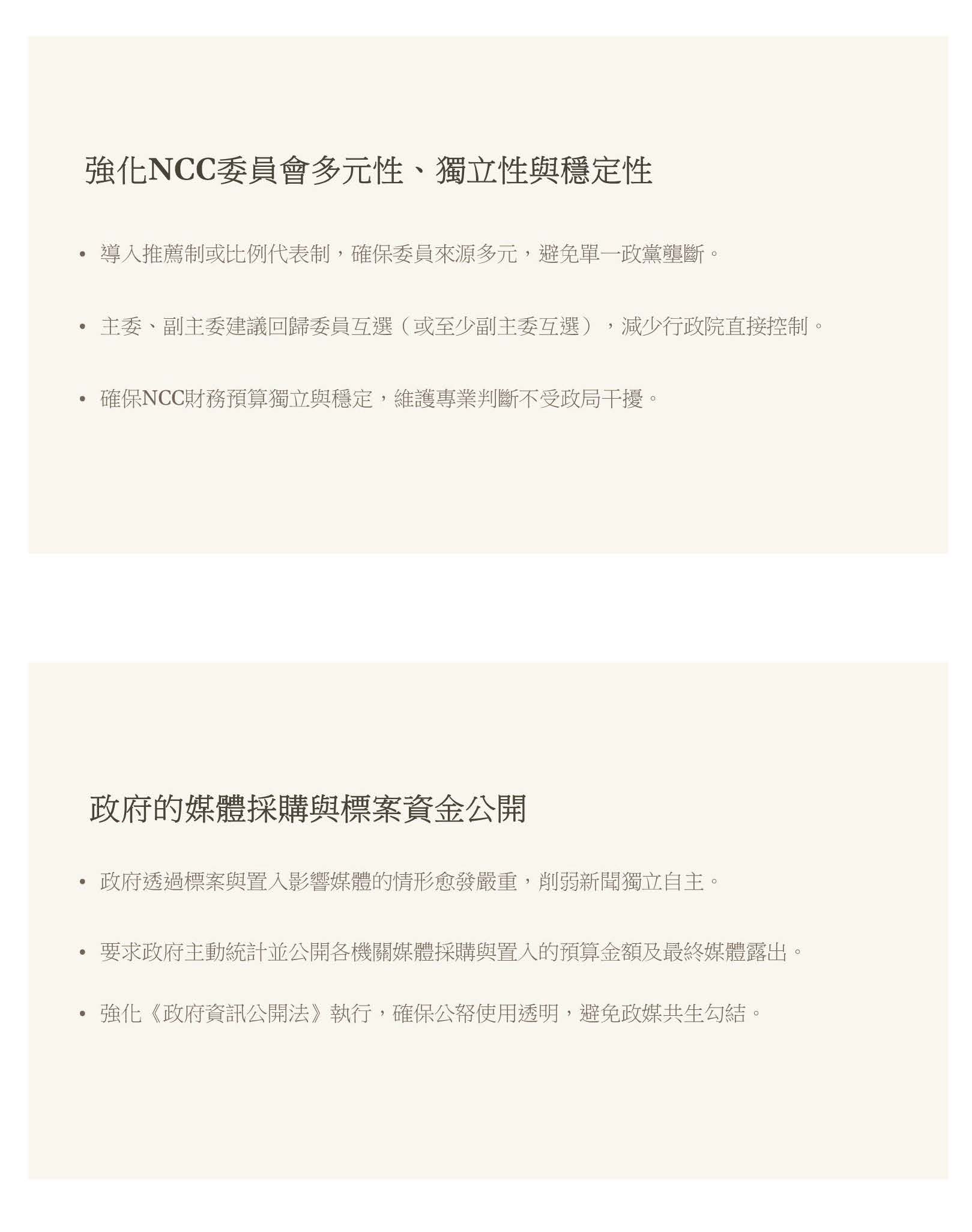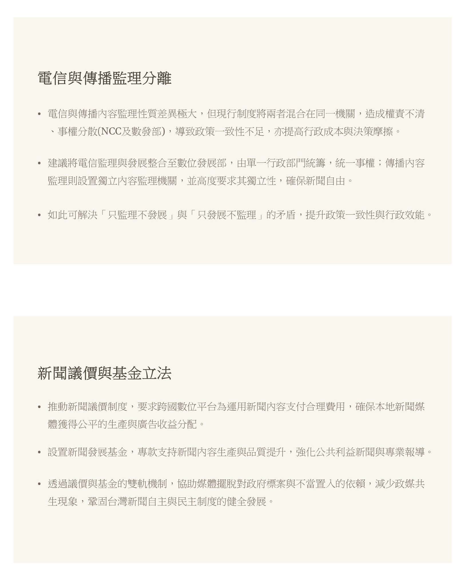 我們也希望電信跟傳播的監理應該要分離,因為現在其實很多電信的業務已經轉到數發部了,事權分散導致政策的一致性不足,也提高了行政成本跟決策的摩擦。也希望可以推動新聞議價跟基金立法,解決媒體對政府標案跟不當置入的依賴,減低政媒共生的現象,鞏固臺灣的新聞自主與民主制度的發展。