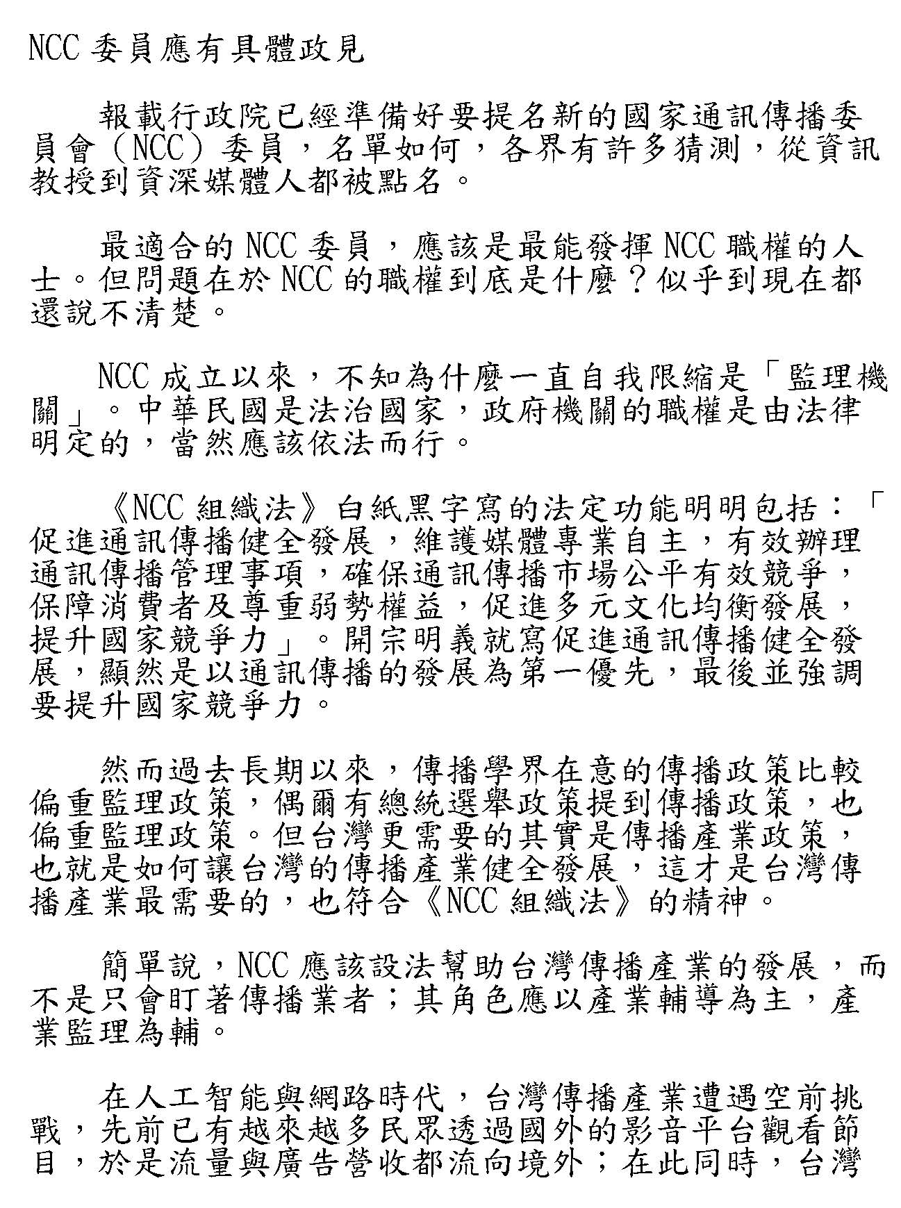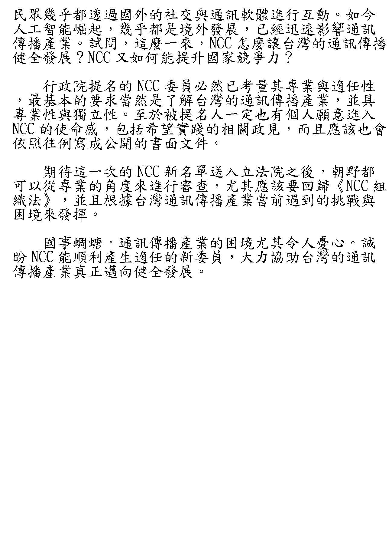 我以下有四點訴求:第一個,誠懇的籲請回歸專業。本會今天以整體產業的角度為全體會員發聲,本會鄭重呼籲,懇請各方能夠放下政治立場和對立,還給媒體專業自主的營運空間,回歸到國家通傳基本法和組織條例,讓本屆NCC委員的遴選能夠根據專業本位產生,能夠維持NCC專業獨立的監管機制。NCC設置的宗旨明文規定包括以下這幾點,容我把它一一條列出來:「促進通訊傳播健全發展」、「依法獨立行使職權,落實憲法保障之言論自由」、「維護媒體專業自主」、「有效辦理通訊傳播管理事項」、「確保通訊傳播市場公平有效競爭」。綜合以上,本會期待這一次能夠在國家發展的高度來進行這一次的審查案,NCC被提名的委員,我們懇盼能夠尊重媒體產業言論自由,作為最重要的前提,能夠積極提升行政效能,能夠協助產業健全的發展。
