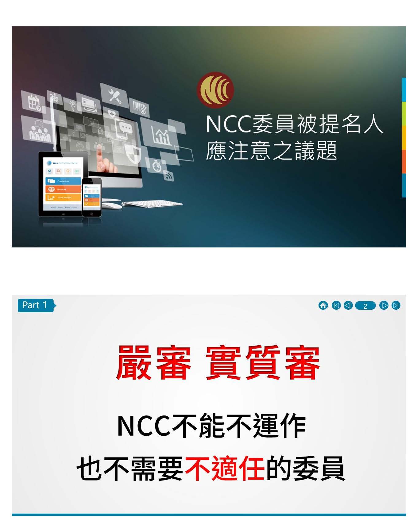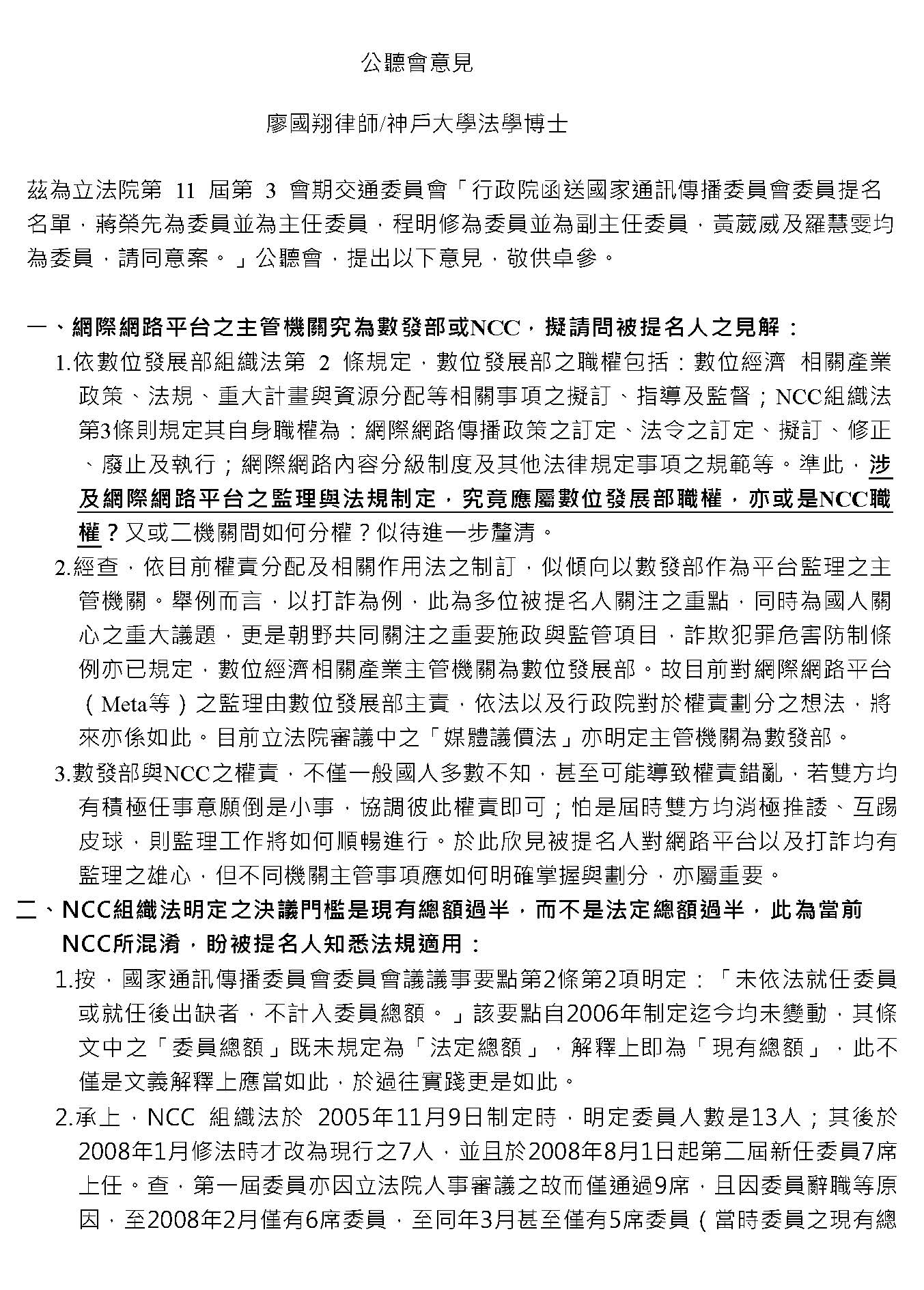 廖律師國翔:主席、各位先進,大家好,我是廖國翔律師。針對本次NCC被提名人的人事同意權審議,謹在此公聽會上提出個人3點淺見、建議,有機會的話,也想就教於被提名人。
