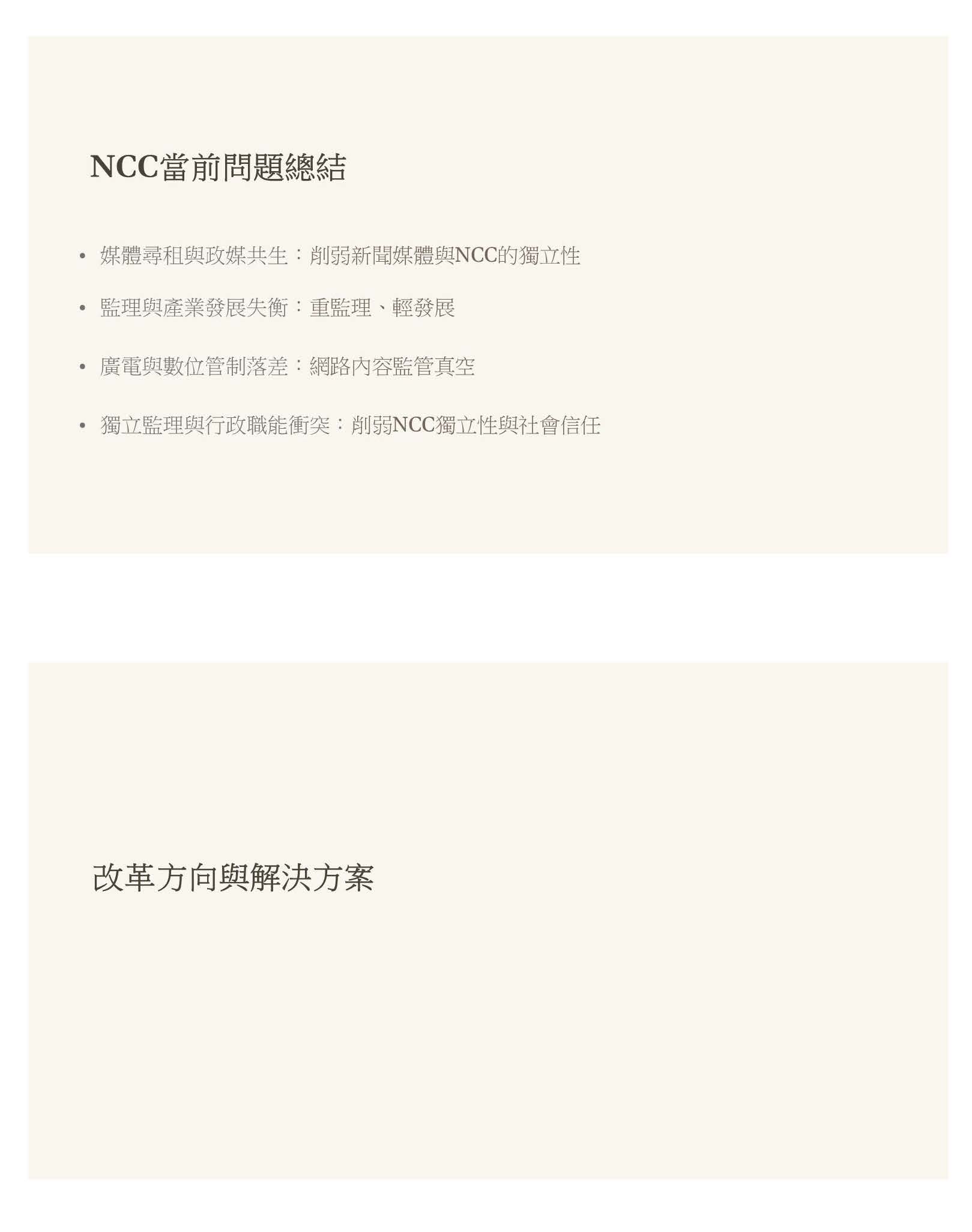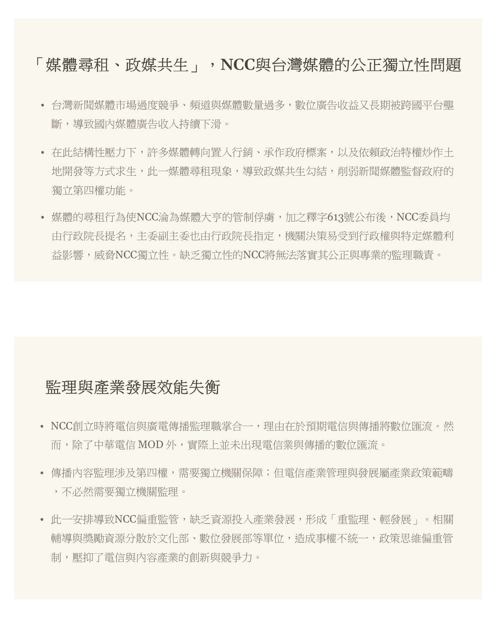 所以問題總結就是,包括像媒體尋租與政媒共生,削弱了新聞媒體跟NCC的獨立性;監理跟產業發展的失衡,造成重監理、輕發展;廣電跟數位管制的落差,使得網路內容的監管是真空的;獨立監理跟行政職能的衝突也削弱了NCC的獨立性。