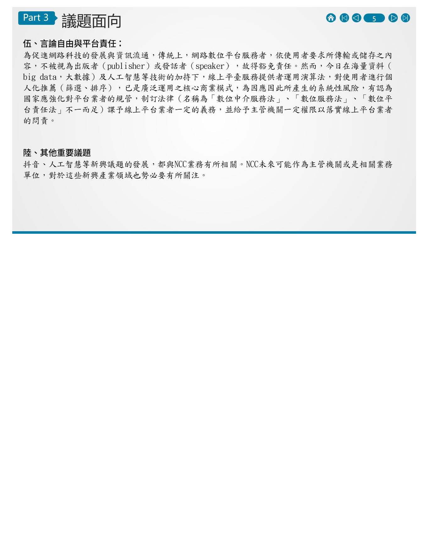 依照目前我們所看到的,看起來涉及到網際網路平臺的監理及法規的制訂,以目前的法規,好像是屬於數發部在進行的,以打詐為例,像過去通過的打詐法或是目前立法院審議當中的媒體議價法,都是明定數發部作為主管機關。我們知道,不管是打詐或是平臺監理都是國人非常關注的議題,因此被提名人也都有雄心壯志去做平臺問責、平臺監理的工作,但是將來NCC與數發部之間如何對這個平臺的議題做主管機關的擇定、選定,或者是相互間如何合作,我相信是個非常重要的事項。如果雙方都有雄心壯志願意納管的話,那只是雙方互相協調的問題而已,就怕如果雙方都消極推諉、互踢皮球的話,這個監理的工作要如何順暢進行就可能會出現問題,所以將來不管是數發部、還是NCC,不同機關之間的主管事項應該如何被明確地劃分及掌握都是非常重要的議題,這是第一點。