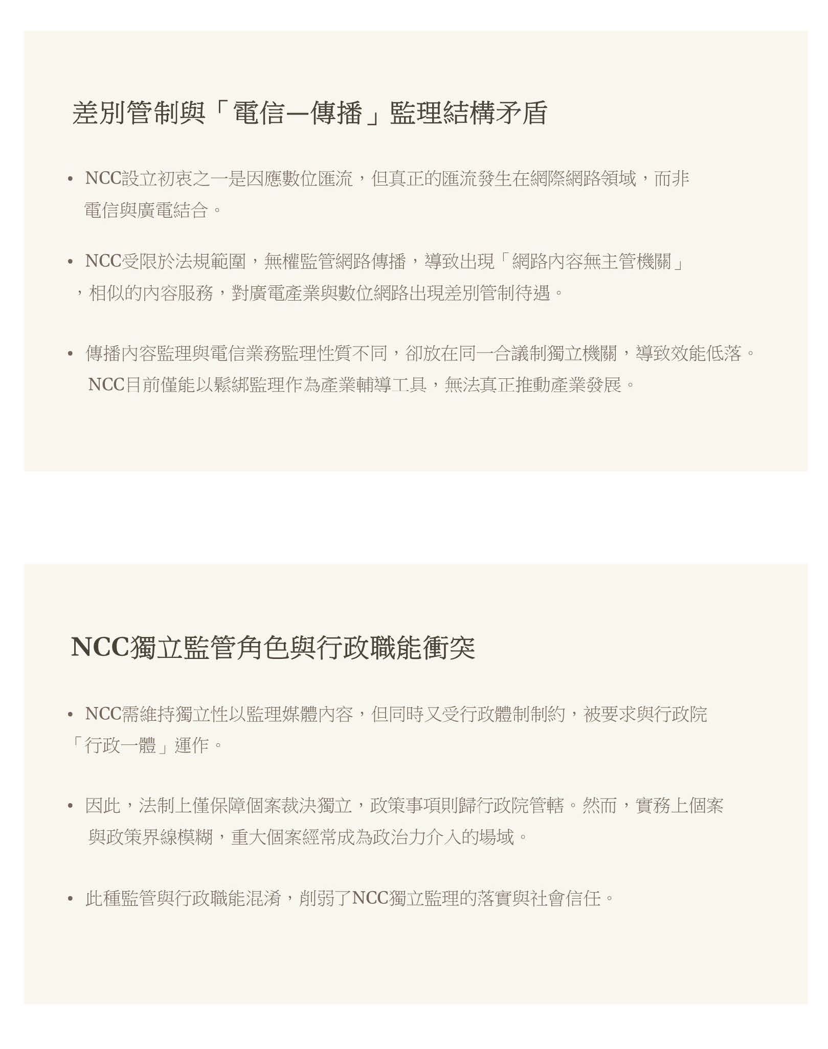 NCC其實也遇到其獨立監管角色與行政職能的衝突,剛剛有提到大法官釋字的解釋案,NCC雖然是獨立運作監理媒體內容,可是它必須要受到行政體制的制約,被要求跟行政院行政一體運作,在法制上只有保障這個個案裁決是獨立的,可是政策事項又歸行政院管轄,但實務上個案跟政策的界線是非常模糊的,所以當遇到重大個案的時候,常常就會成為政治力介入的場域,所以這種監管跟行政職能的混淆,其實某種程度也削弱了NCC獨立監理的落實及社會信任。
